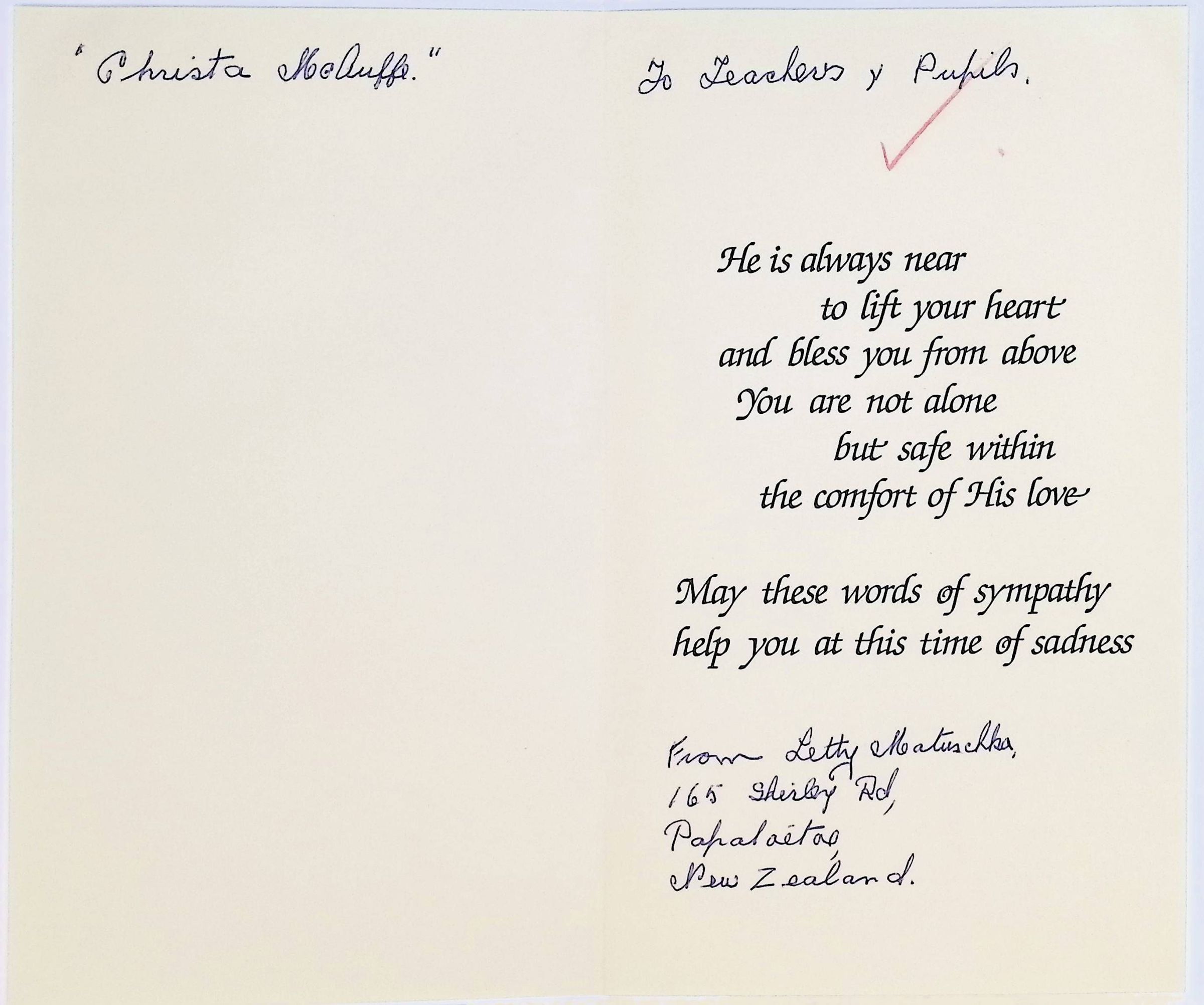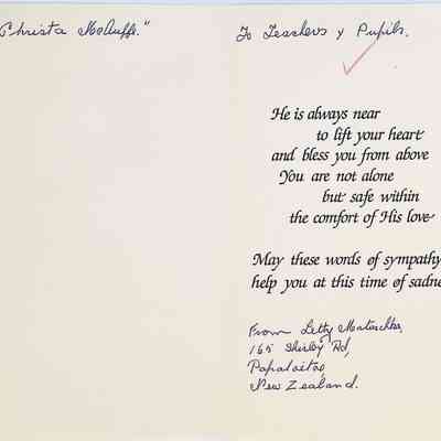 Sympathy Card to Concord High School from Lethy Matinchka? (New Zealand)