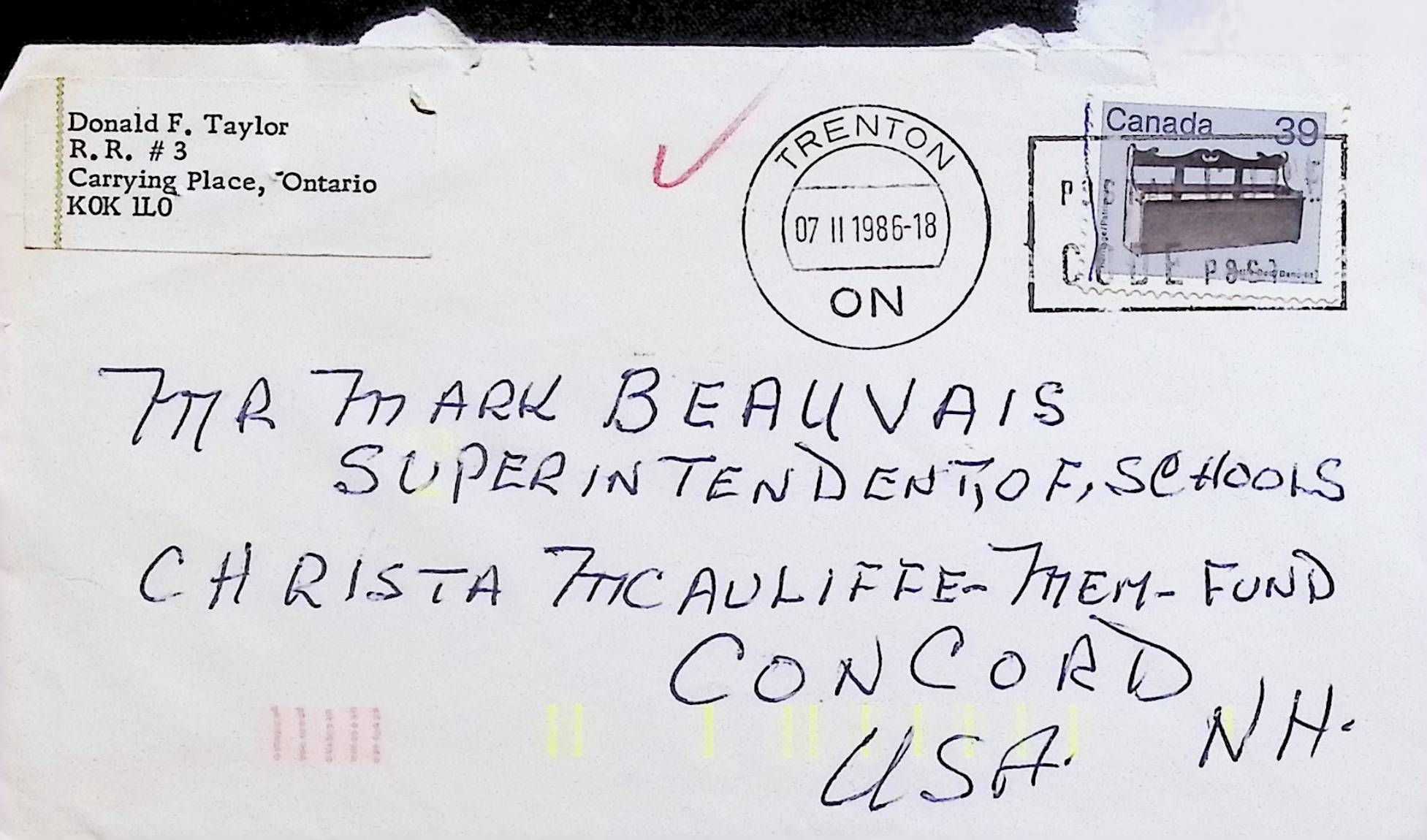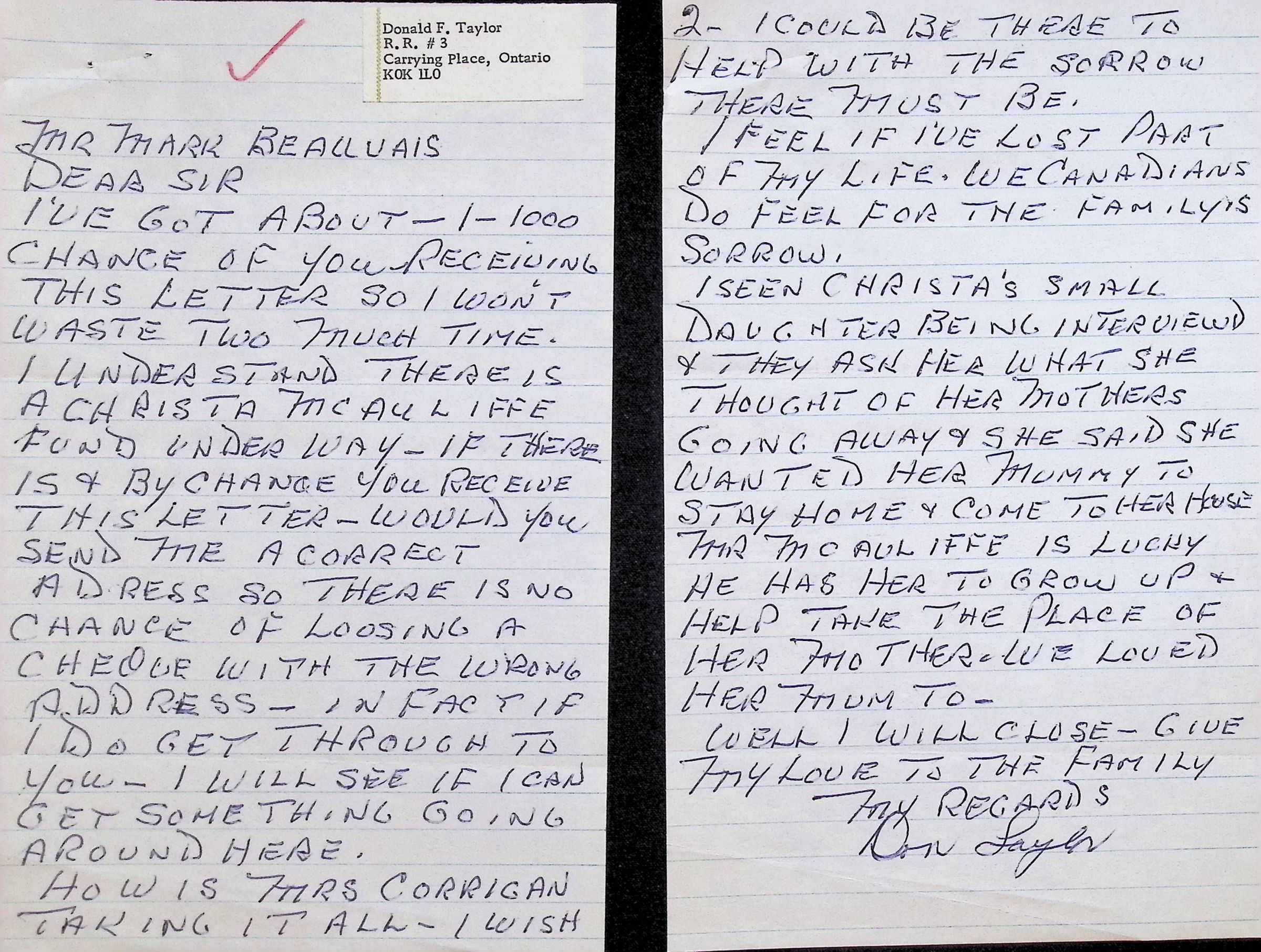 Handwritten Letter to Mark Beauvais (Superintendent) from Donald Taylor