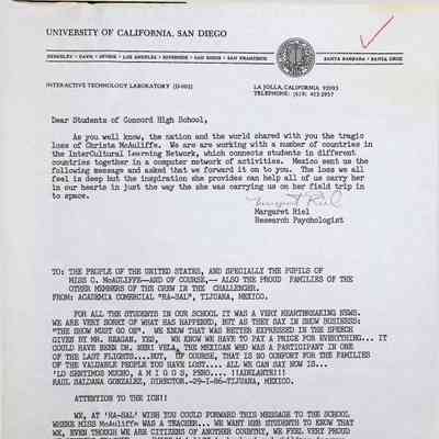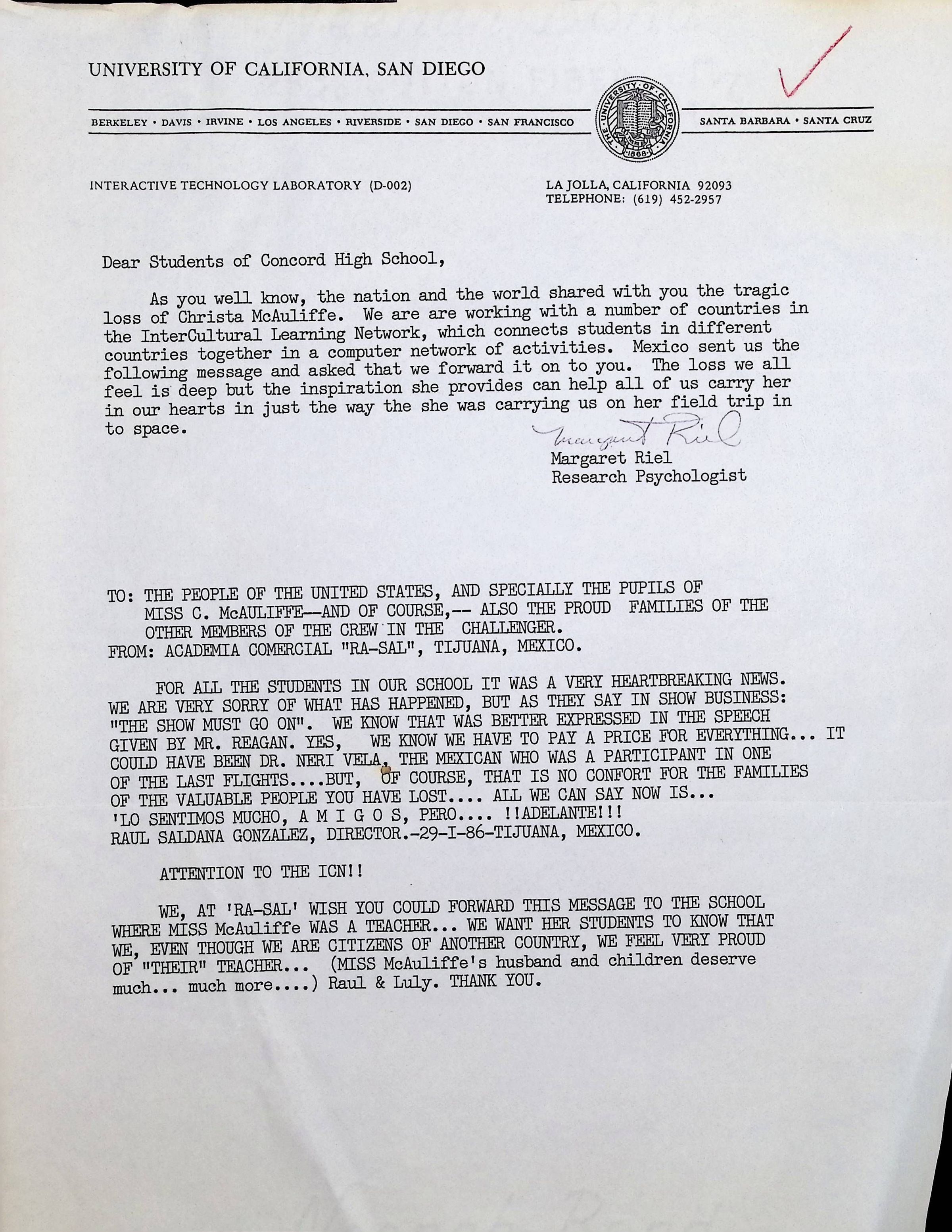 Typed Letter to Students of Concord High School from Margaret Riel (University of California San Diego, a part of the InterCultural Learning Network), Raul Saldana Gonzalez, and Raul & Lucy (Academia Comercial "Ra-Sal")