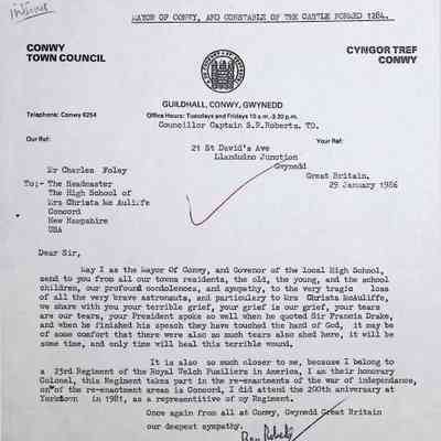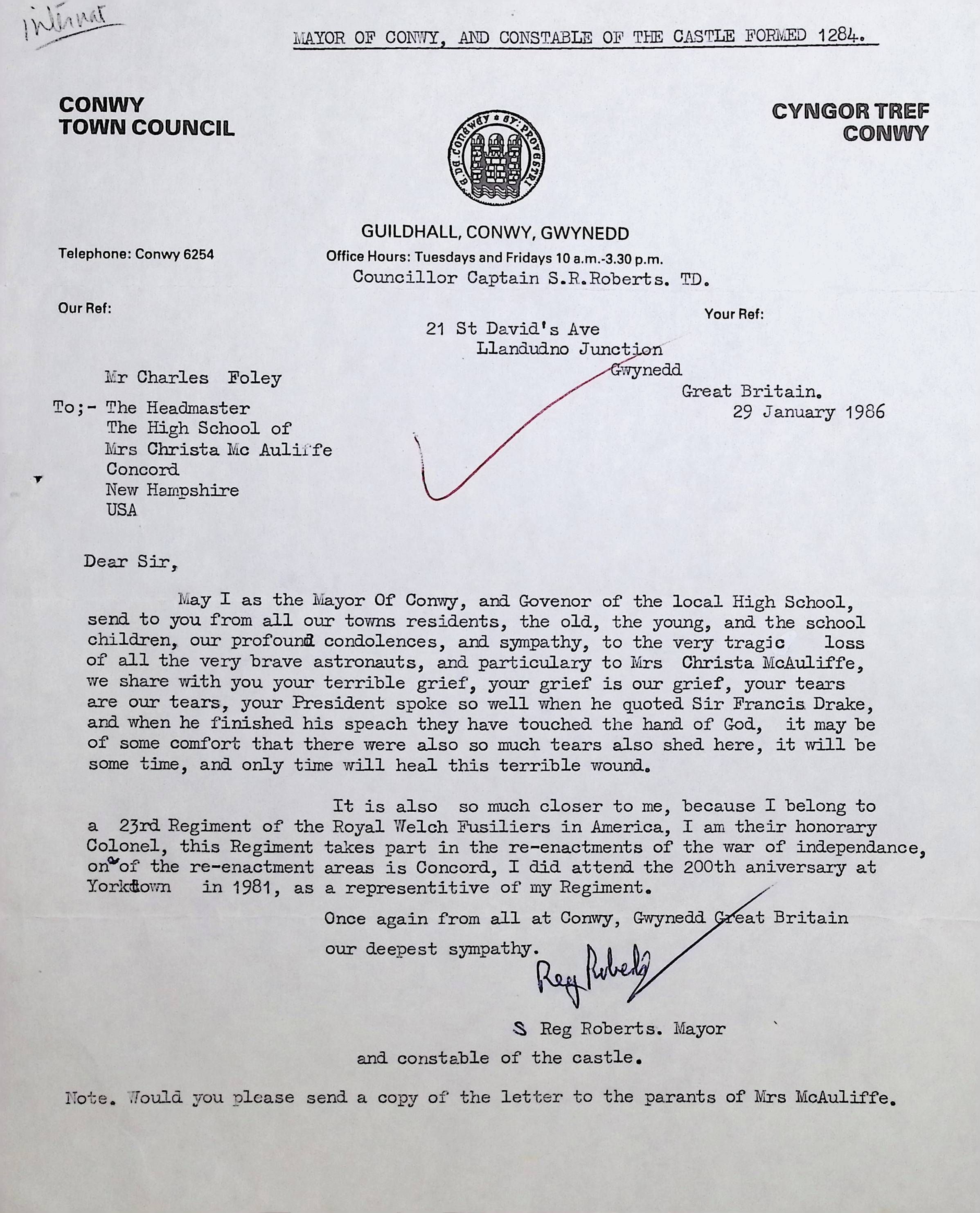 Handwritten Letter to Charles Foley (Principal of Concord High School) from Mayor Reg Roberts (Wales)