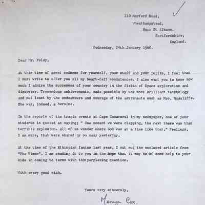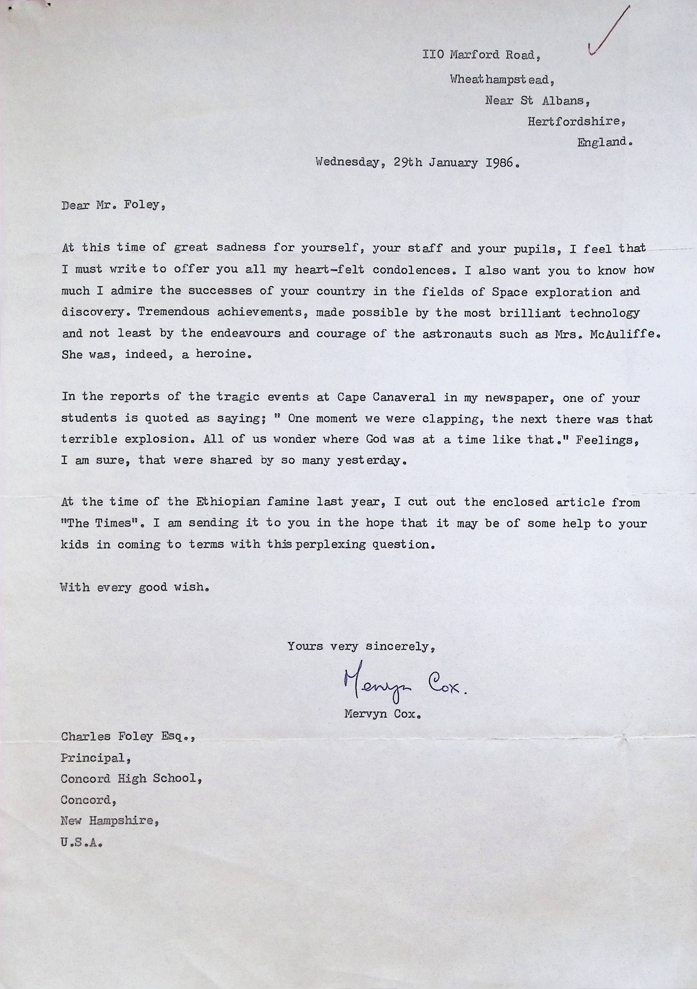 Typed Letter to Charles Foley (Principal of Concord High School) from Mervyn Cox (England)