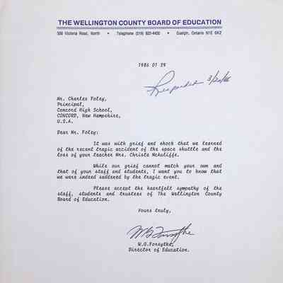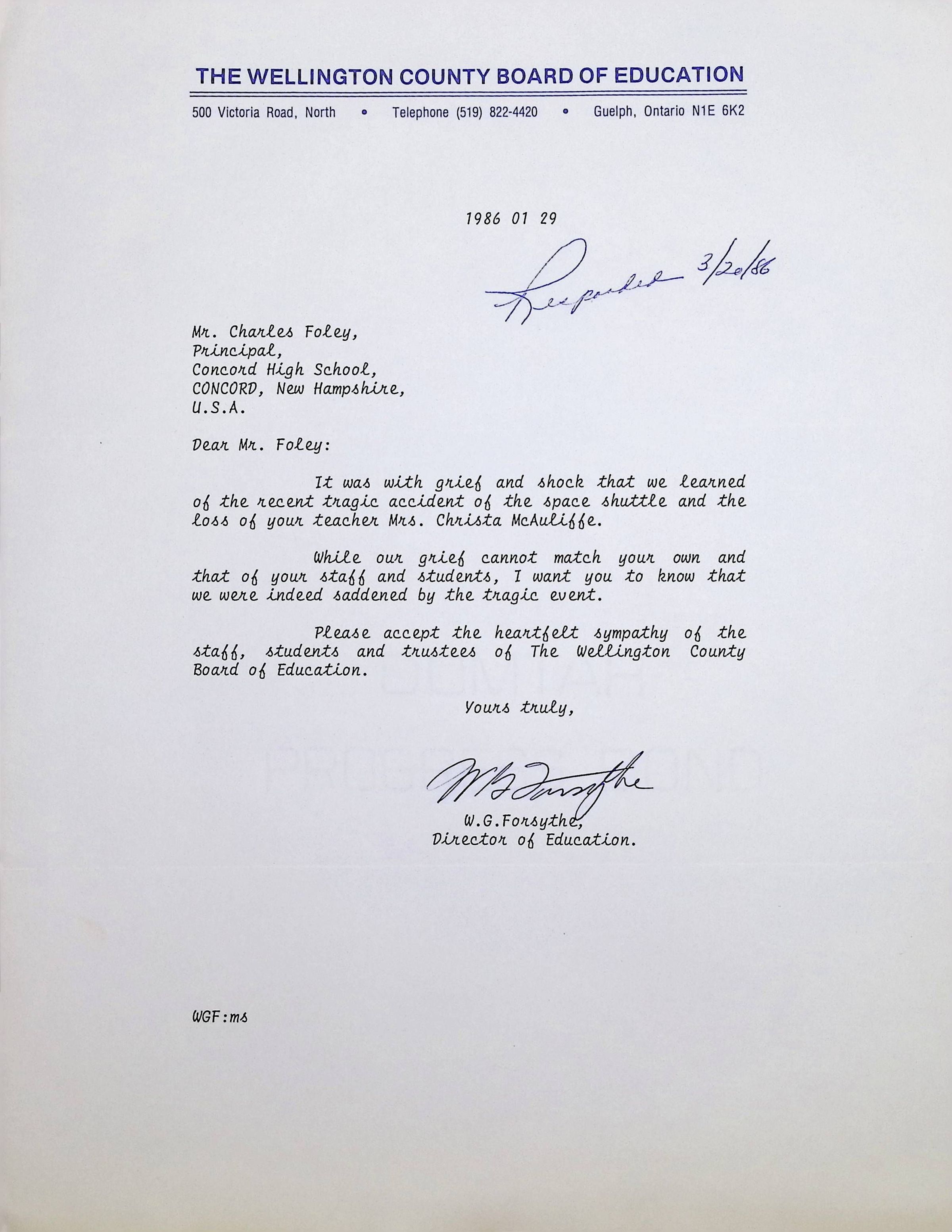 Typed Letter to Charles Foley (Principal of Concord High School) from W.G. Forsythe (The Wellington County Board of Education)