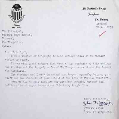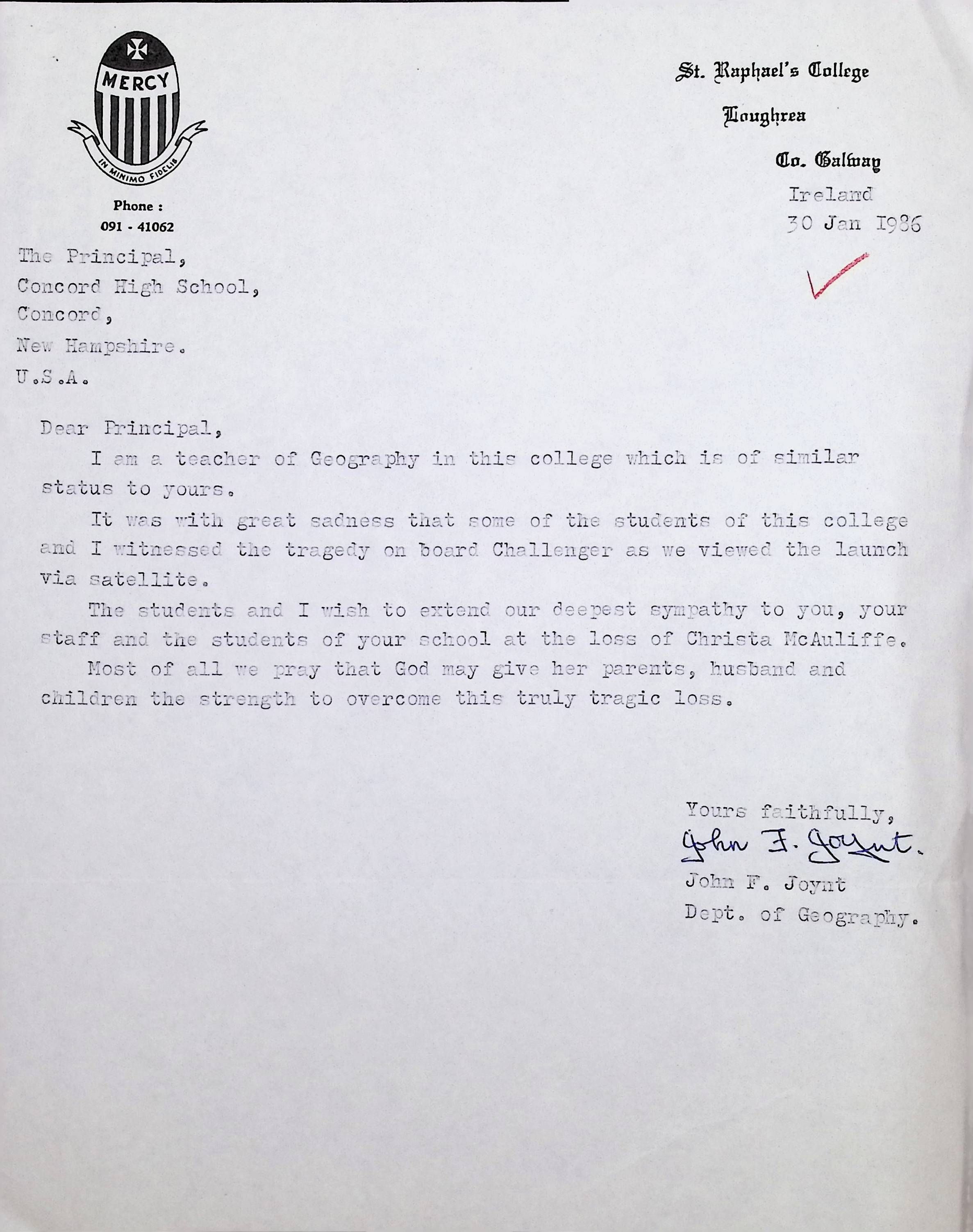 Handwritten Letter to Principal of Concord High School (Charles Foley) from John Joynt of St. Raphael's College (Ireland)