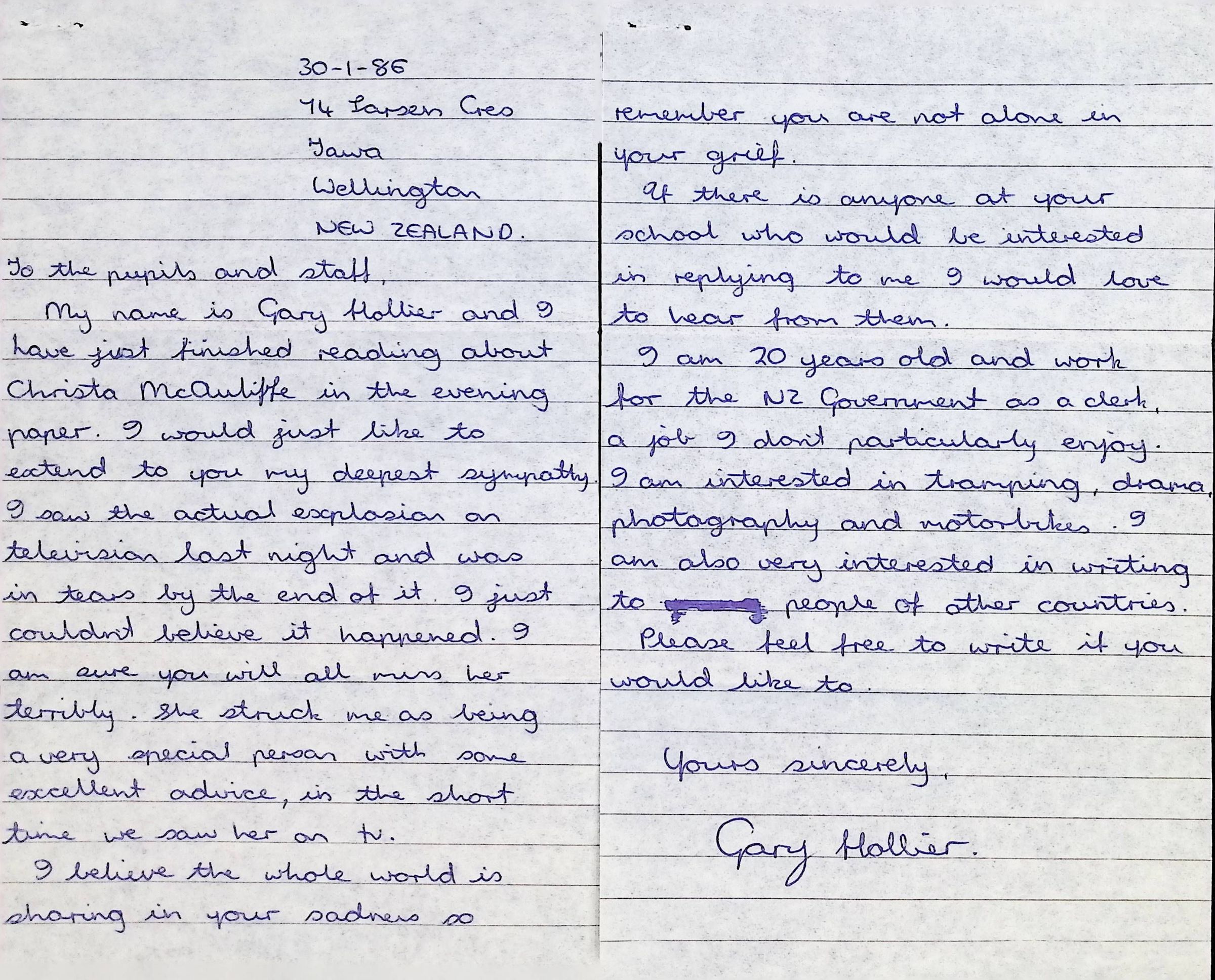 Letter to Concord High School Pupils and Staff from Gary Hollier (New Zealand)