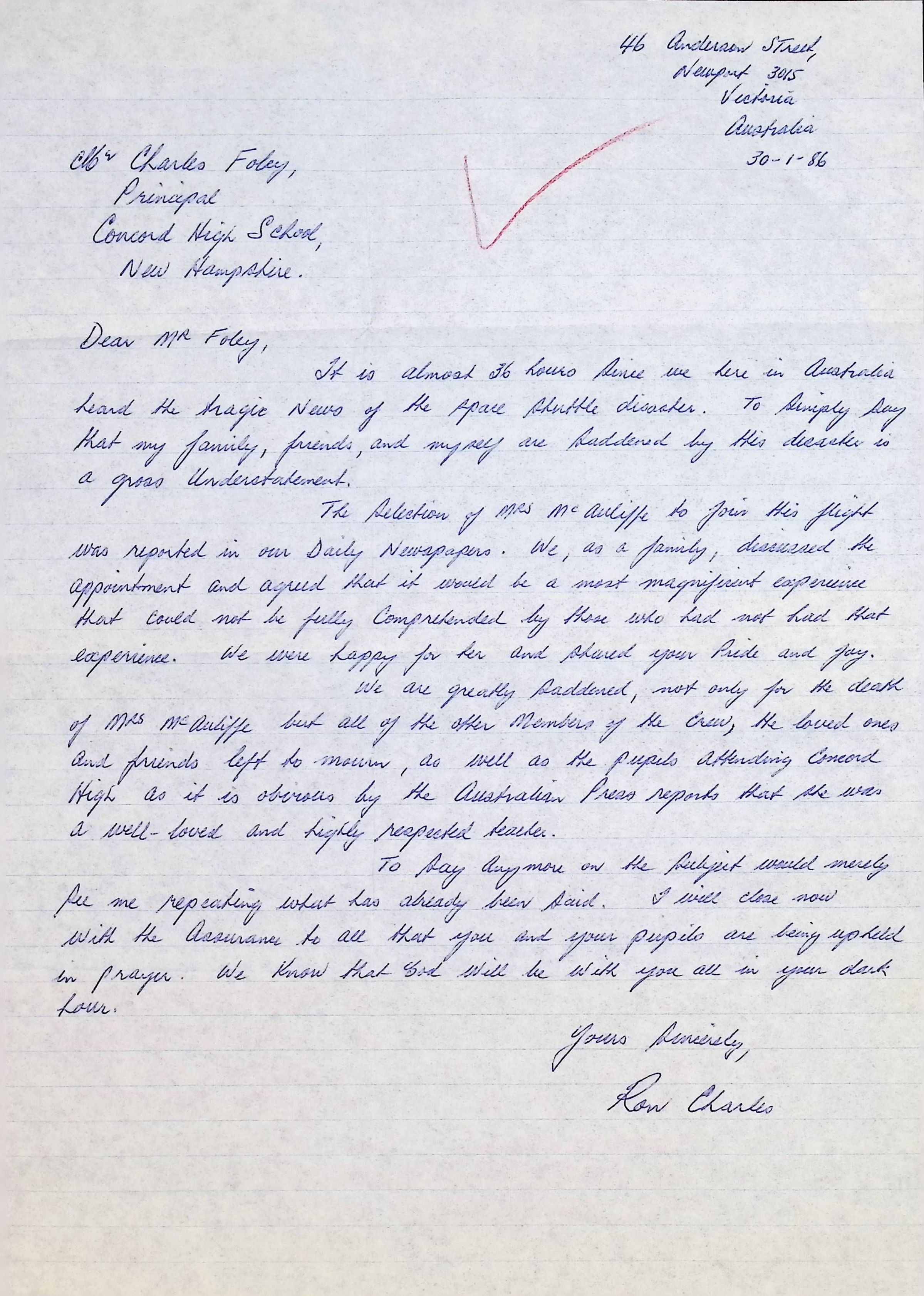 Letter to Concord High School from Ron Charles (Australia) Dated January 30, 1986