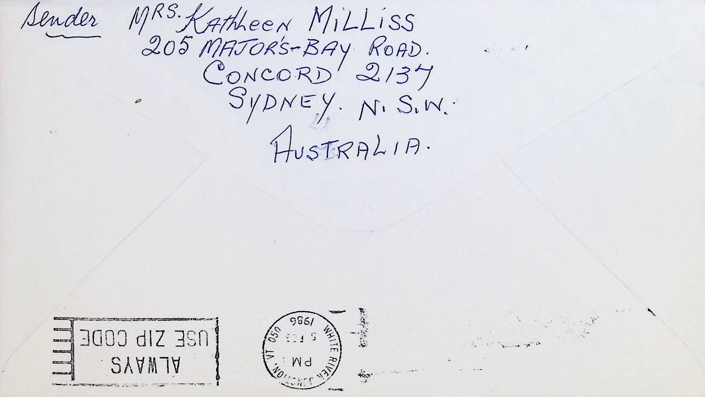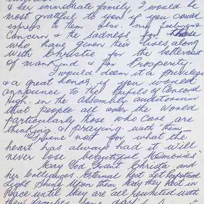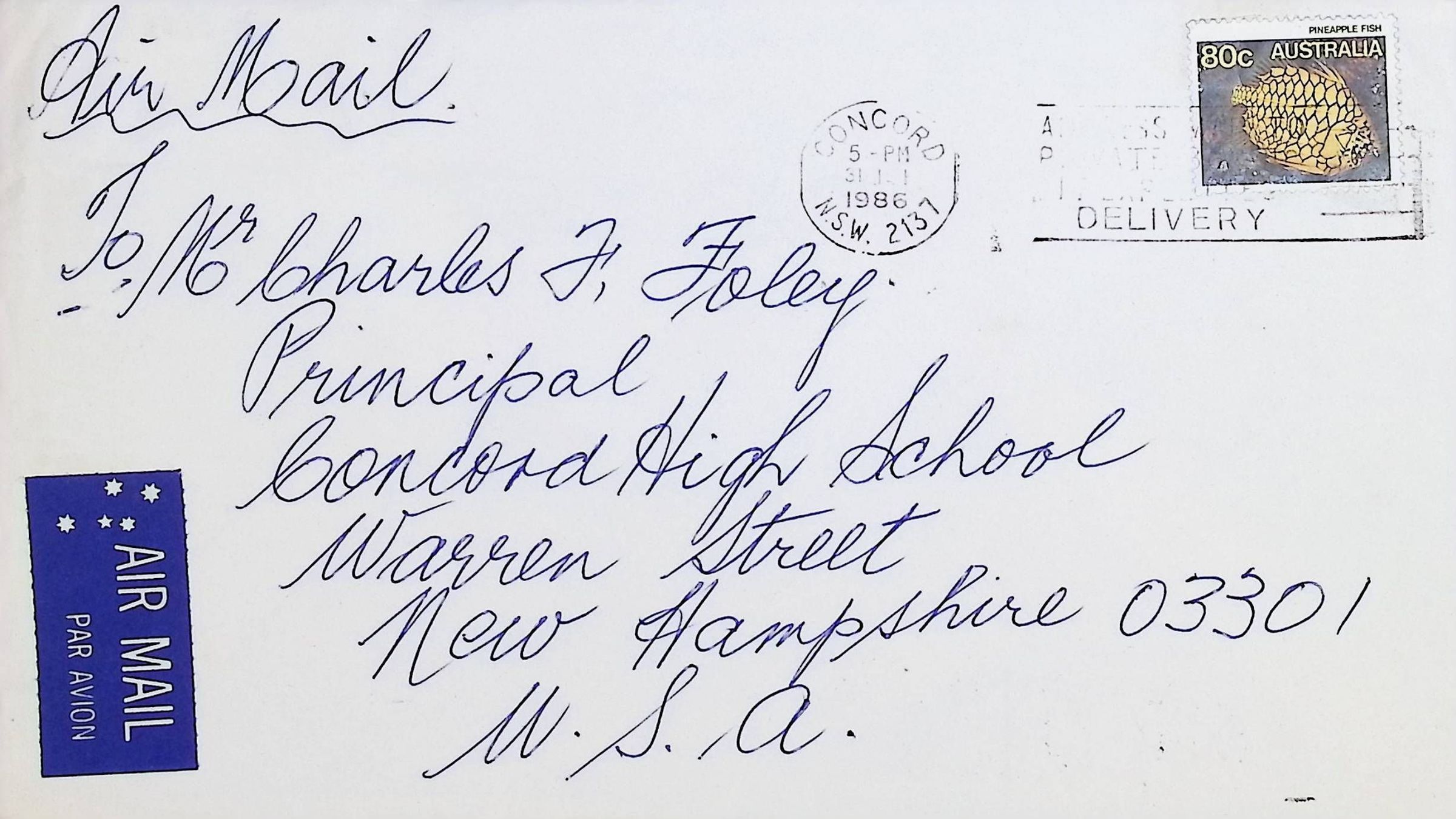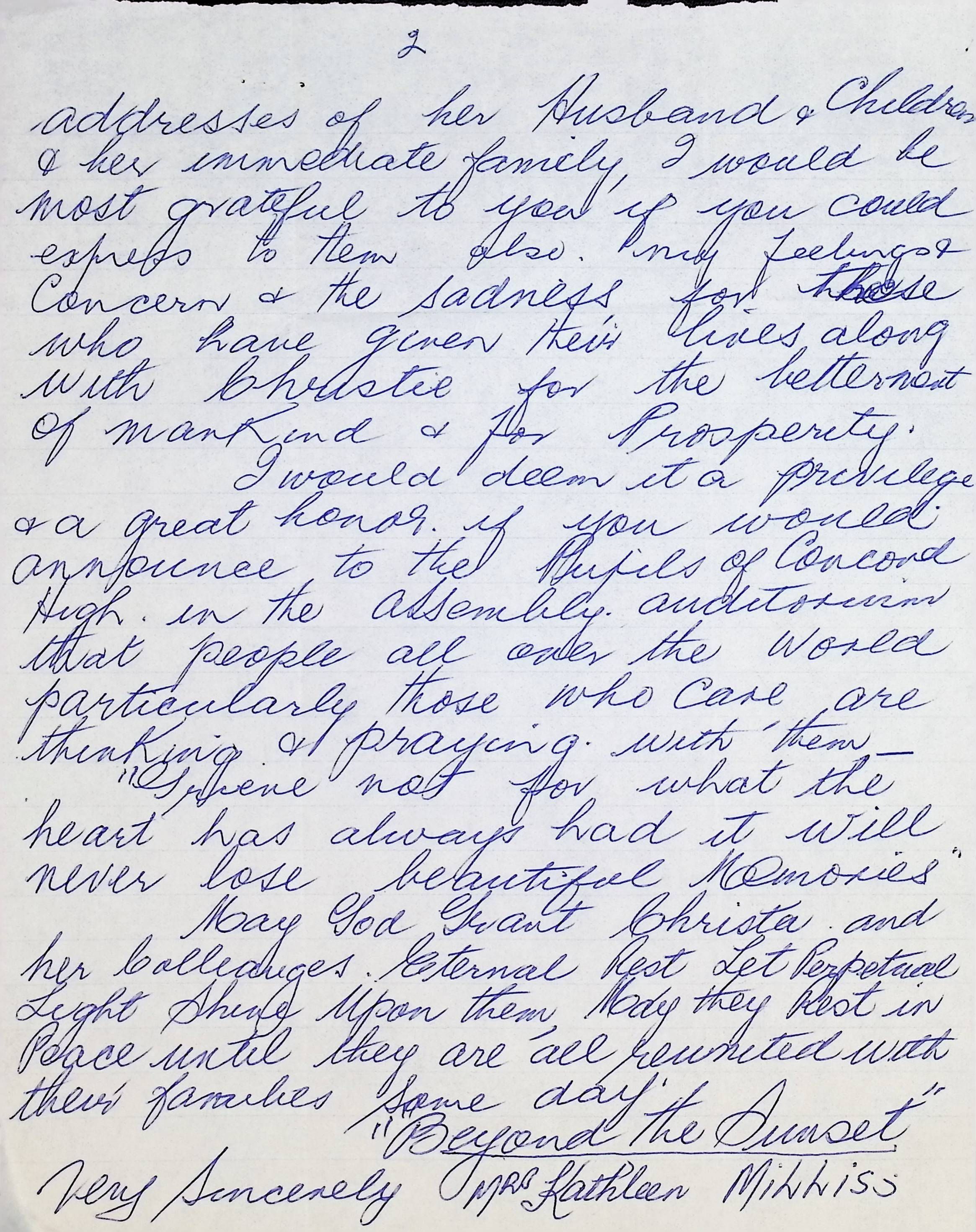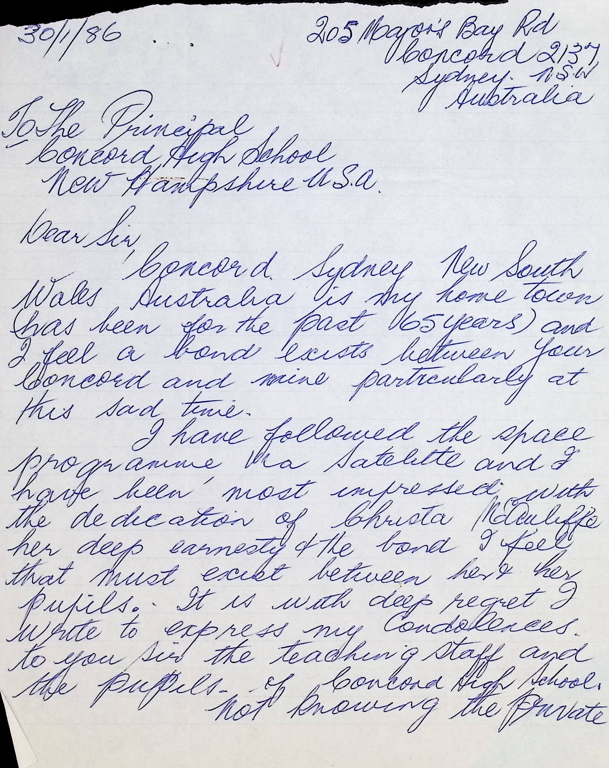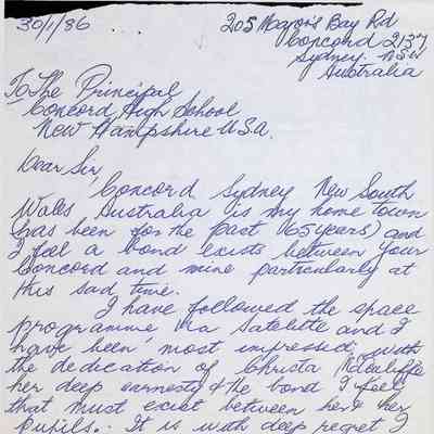 Letter to Concord High School from Kathleen Milliss (Australia) Dated January 30, 1986