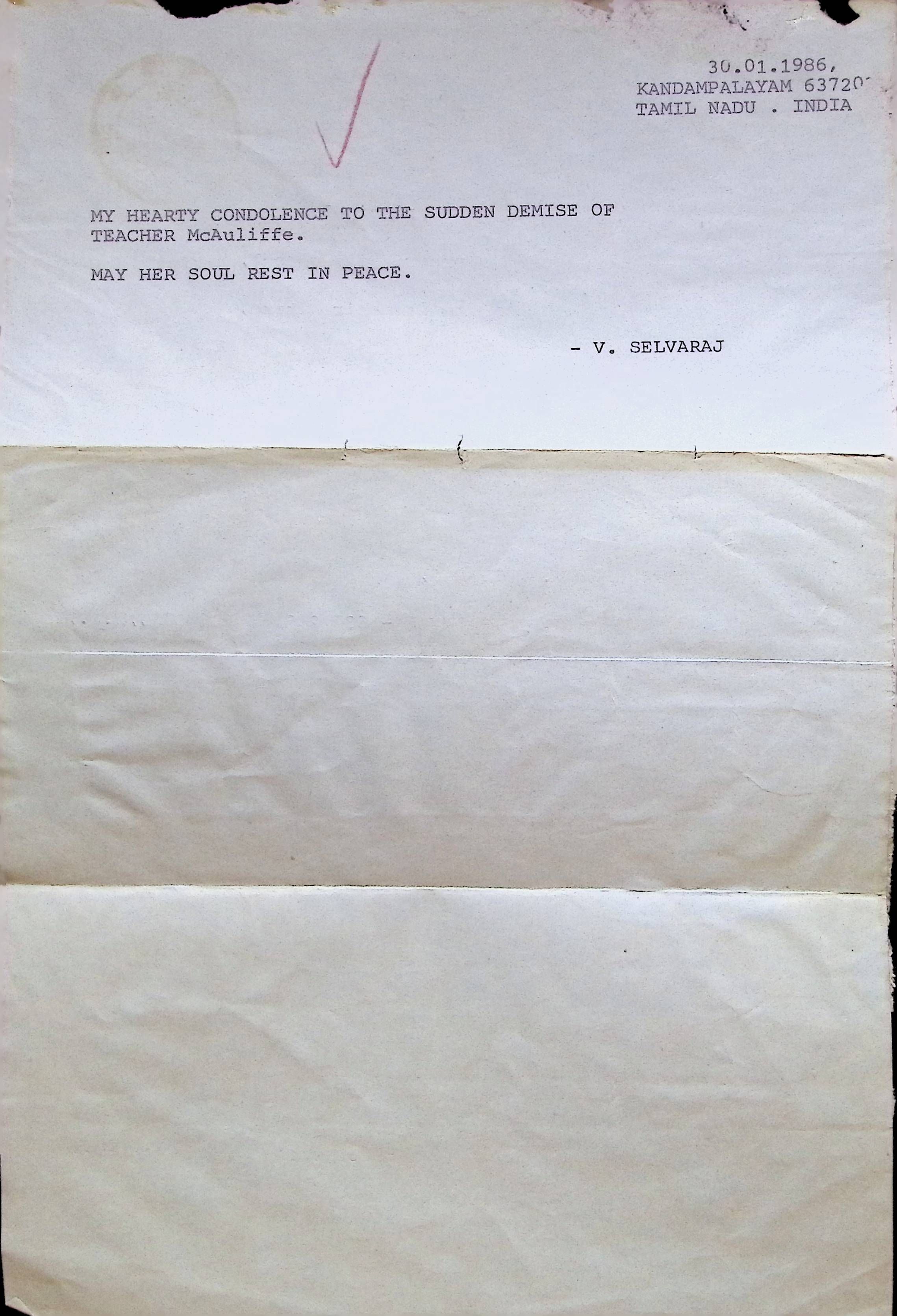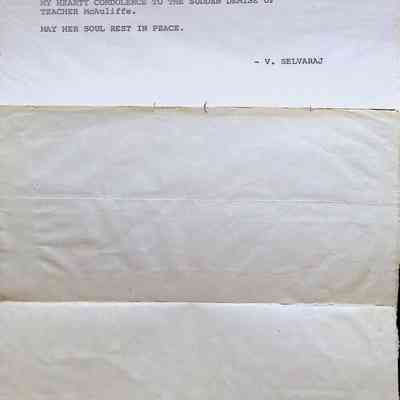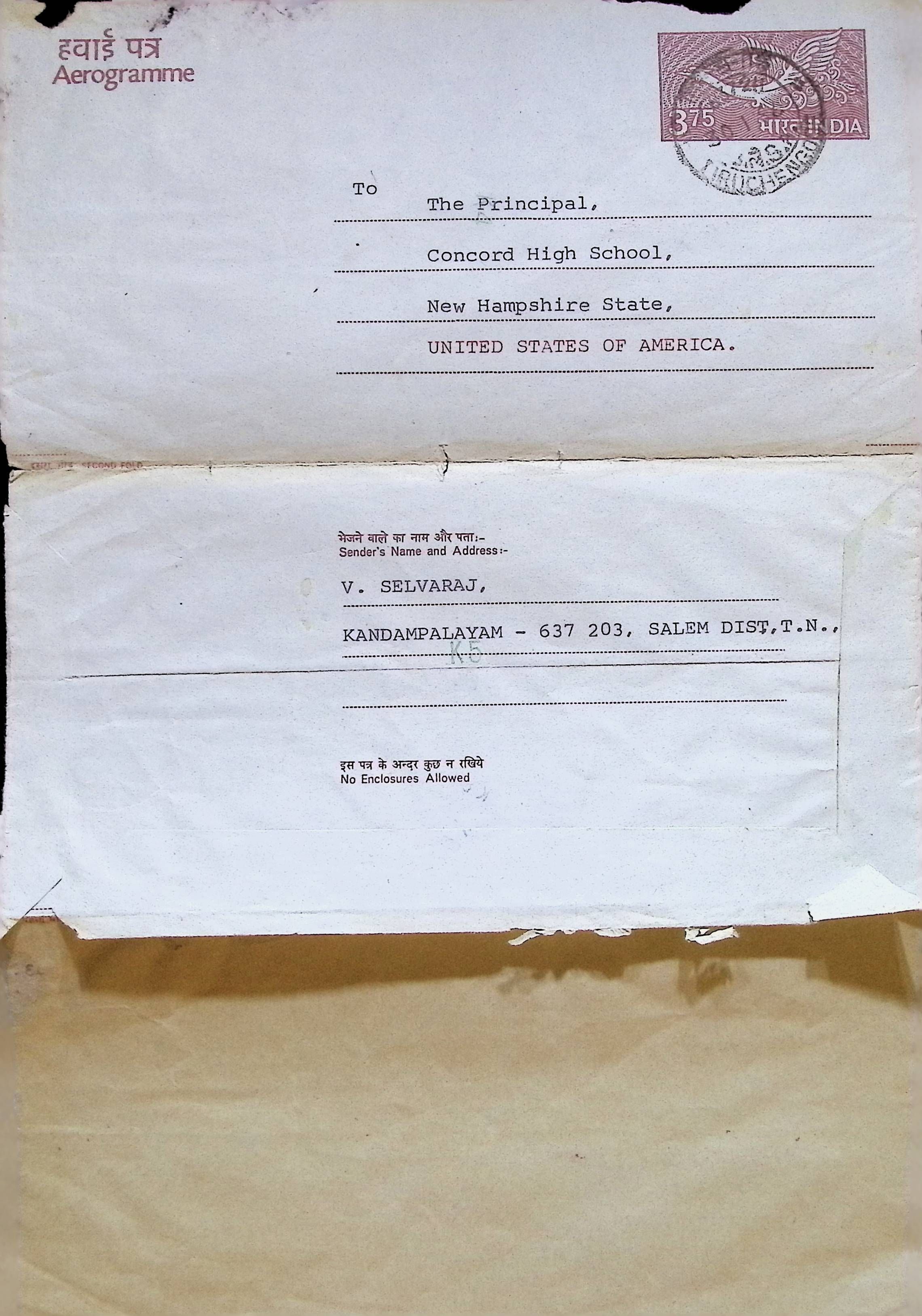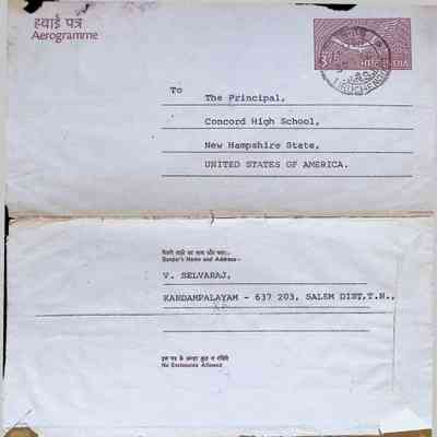 Aerogramme Letter to Principal of Concord High School (Charles Foley) from V. Selvaraj