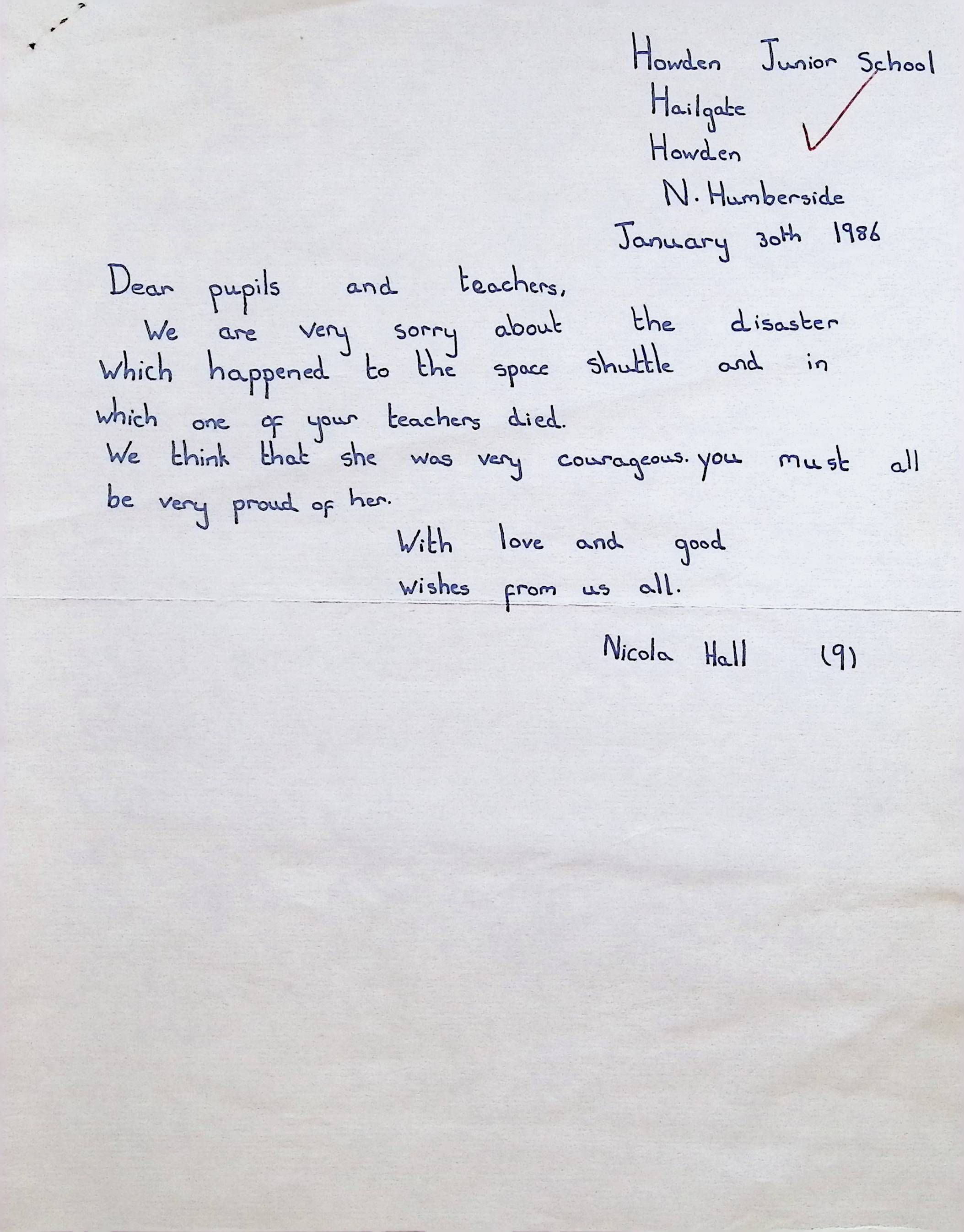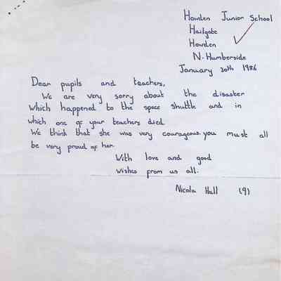 Letter to Pupils and Teachers of Concord High School) from Nicola Hall from Howden Junior School (England)