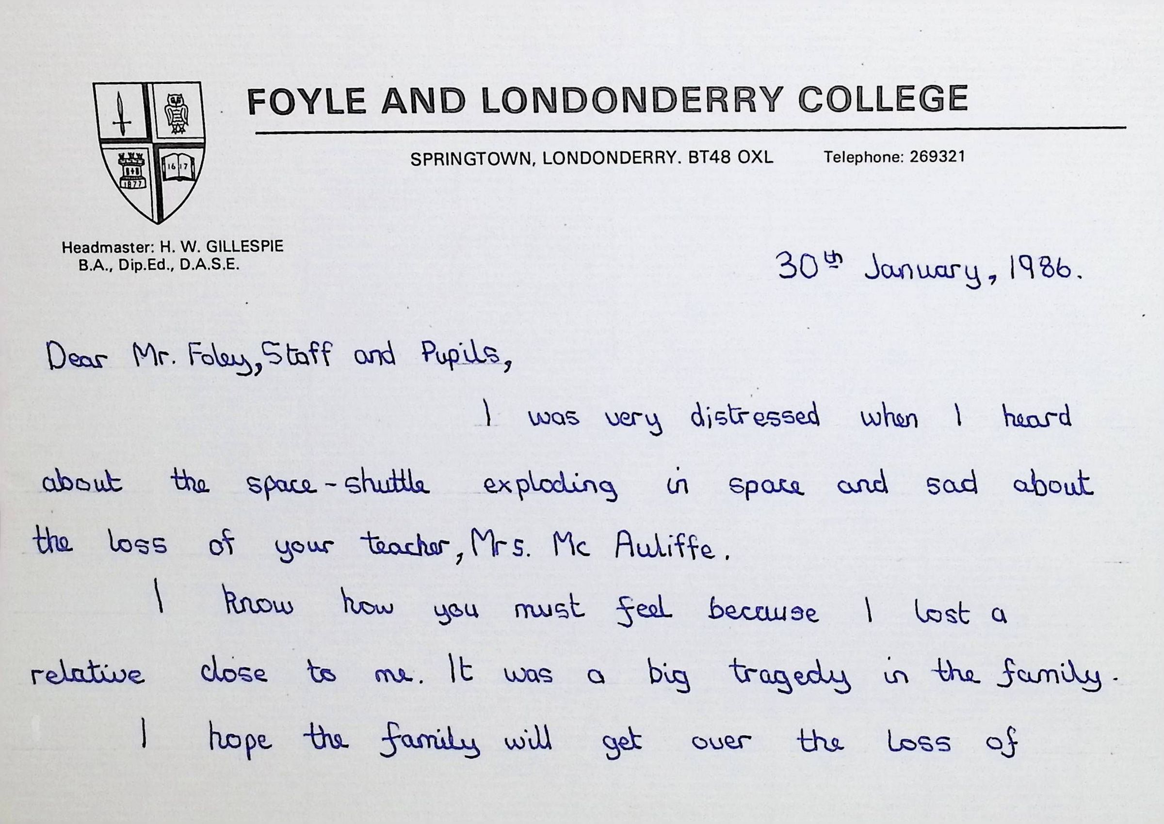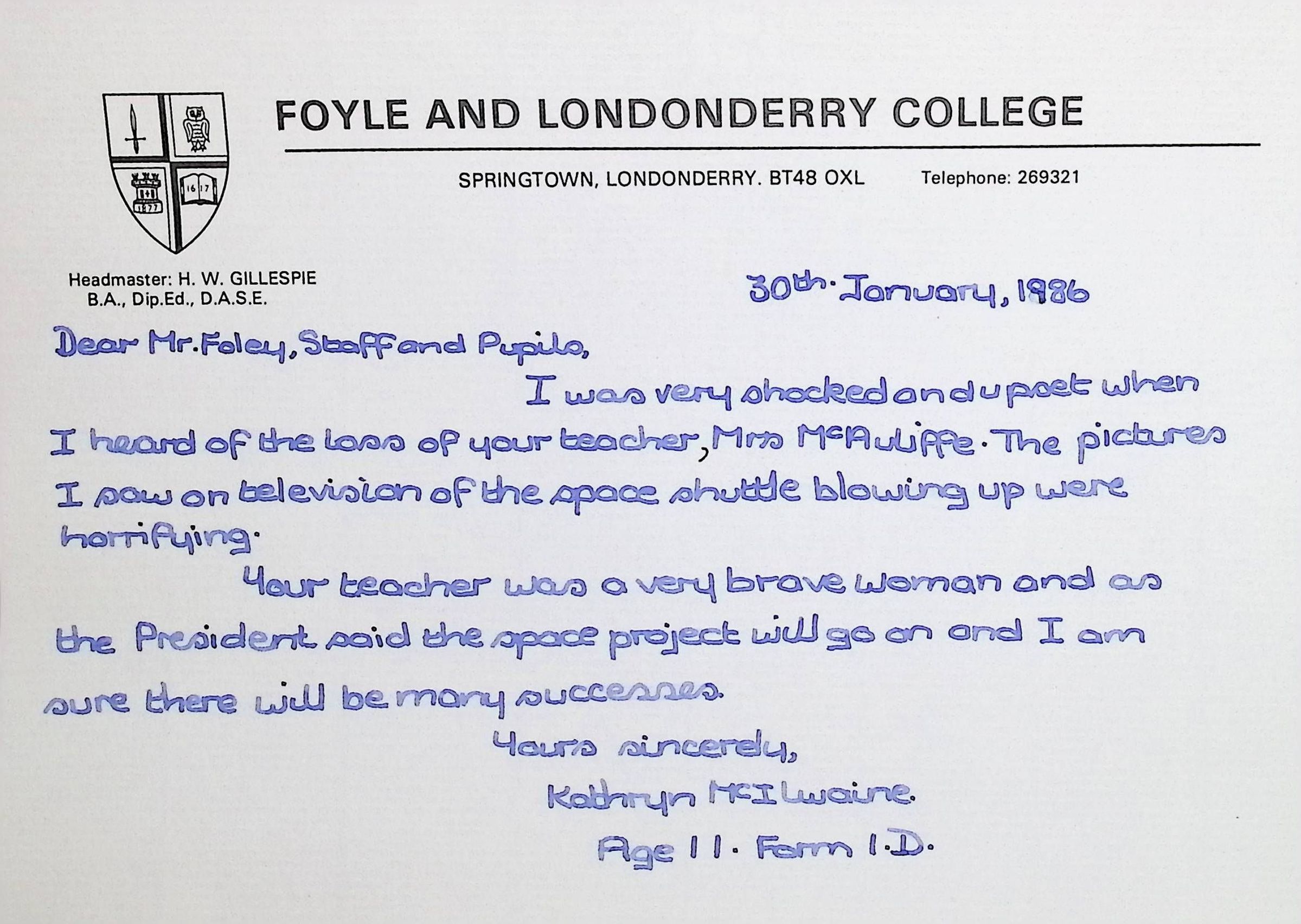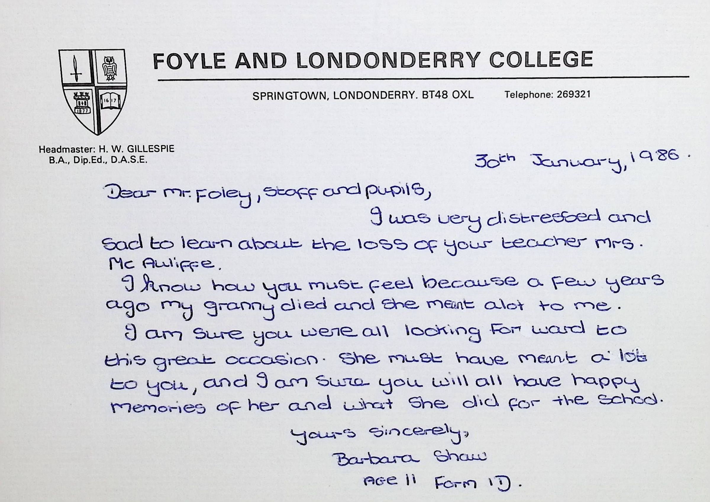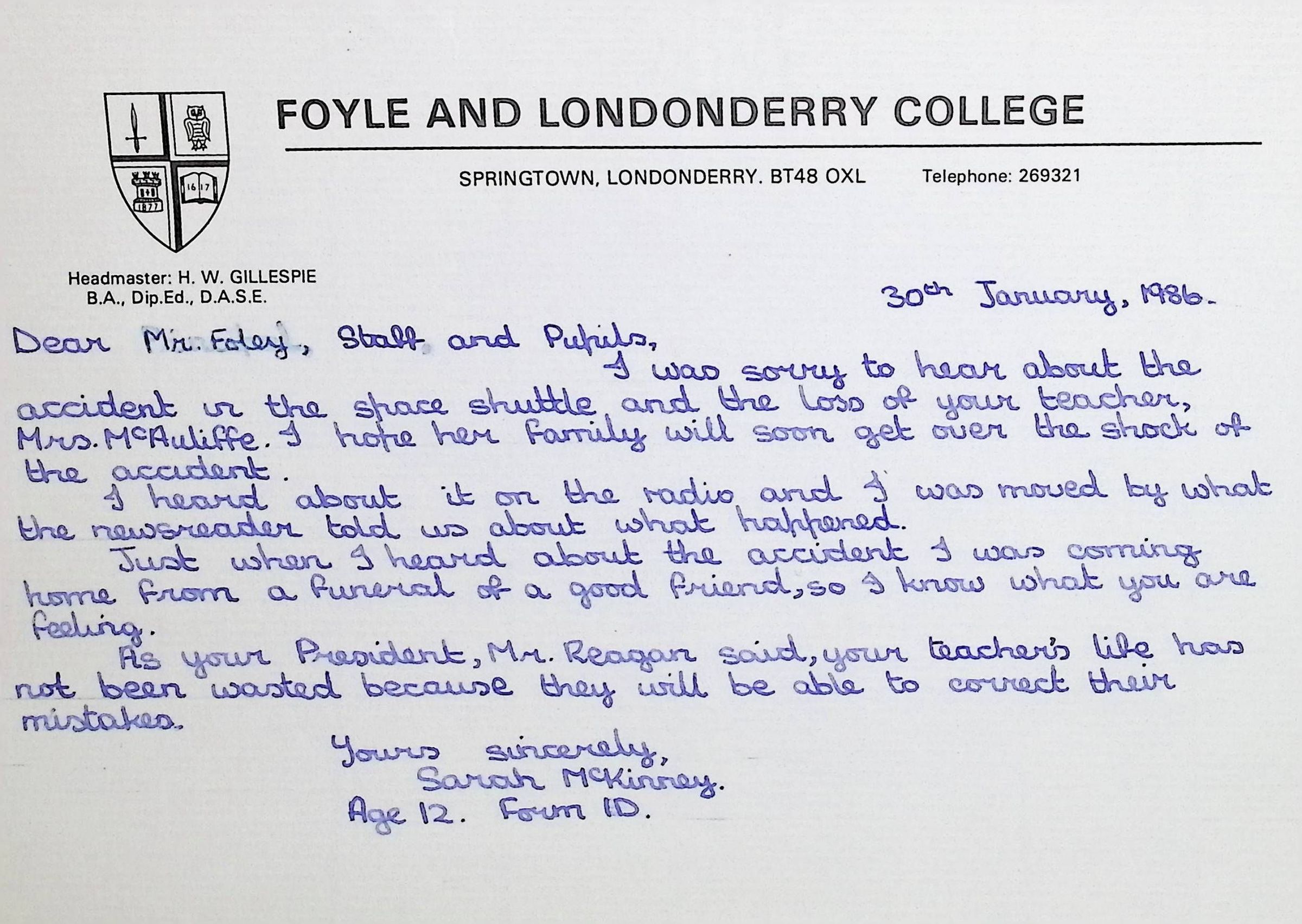 Handwritten Letters to Charles Foley (Principal), Staff, and Pupils of Concord High School from Karen Madeleine Shaw of Foyle and Londonderry College (2 pages)