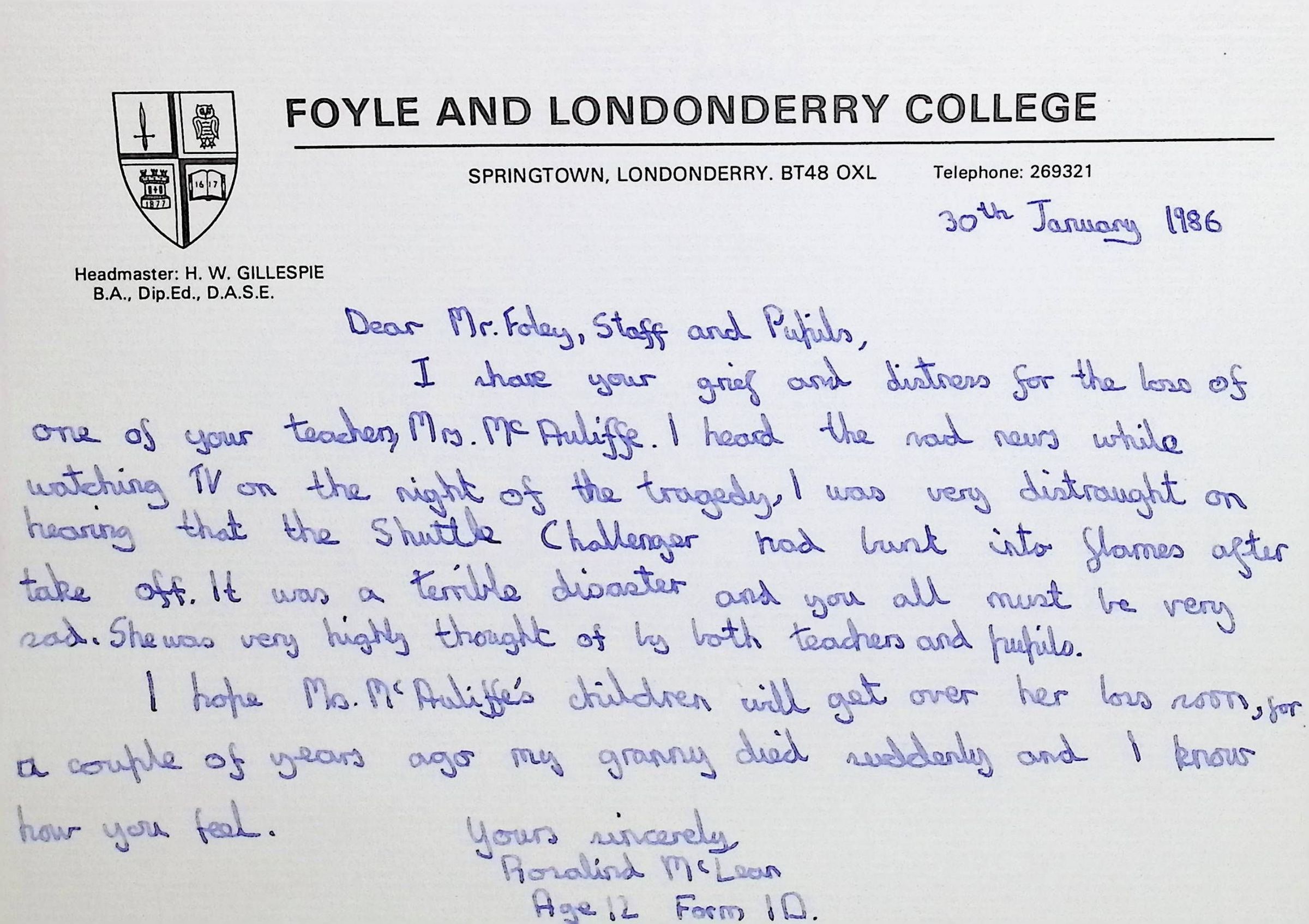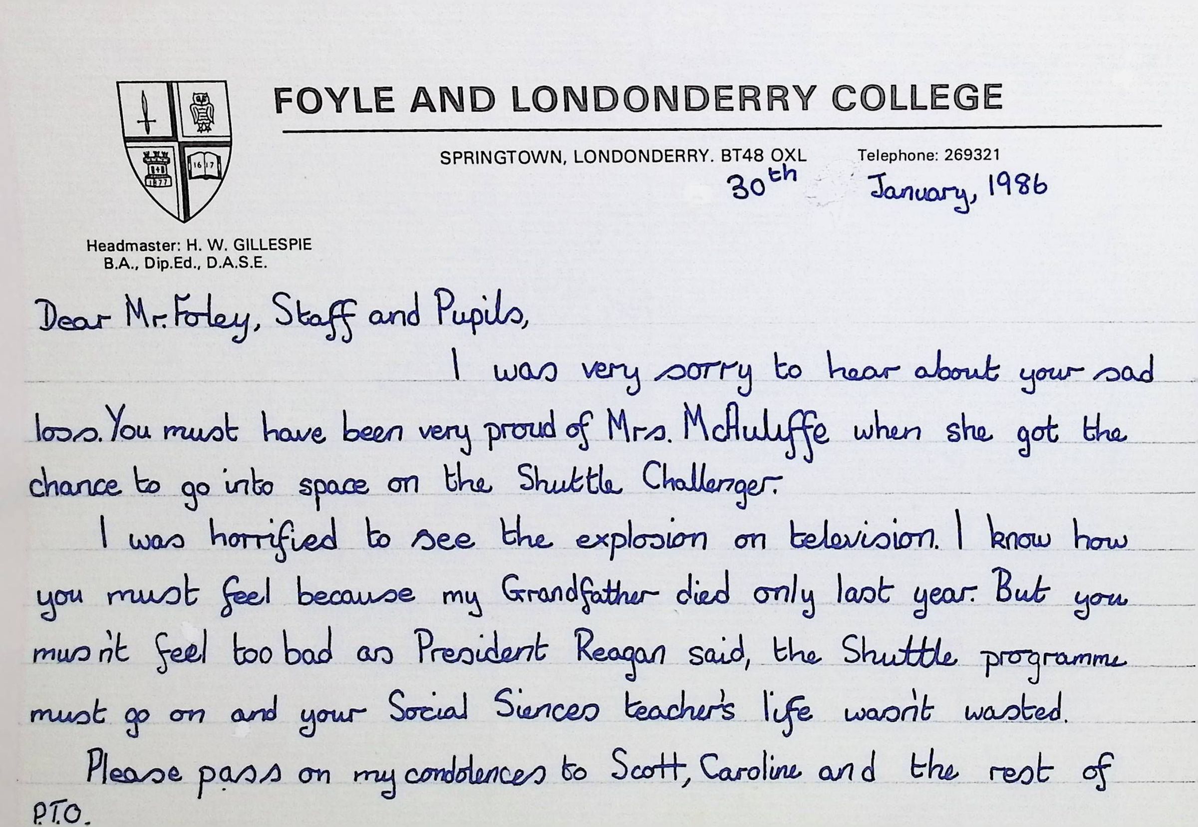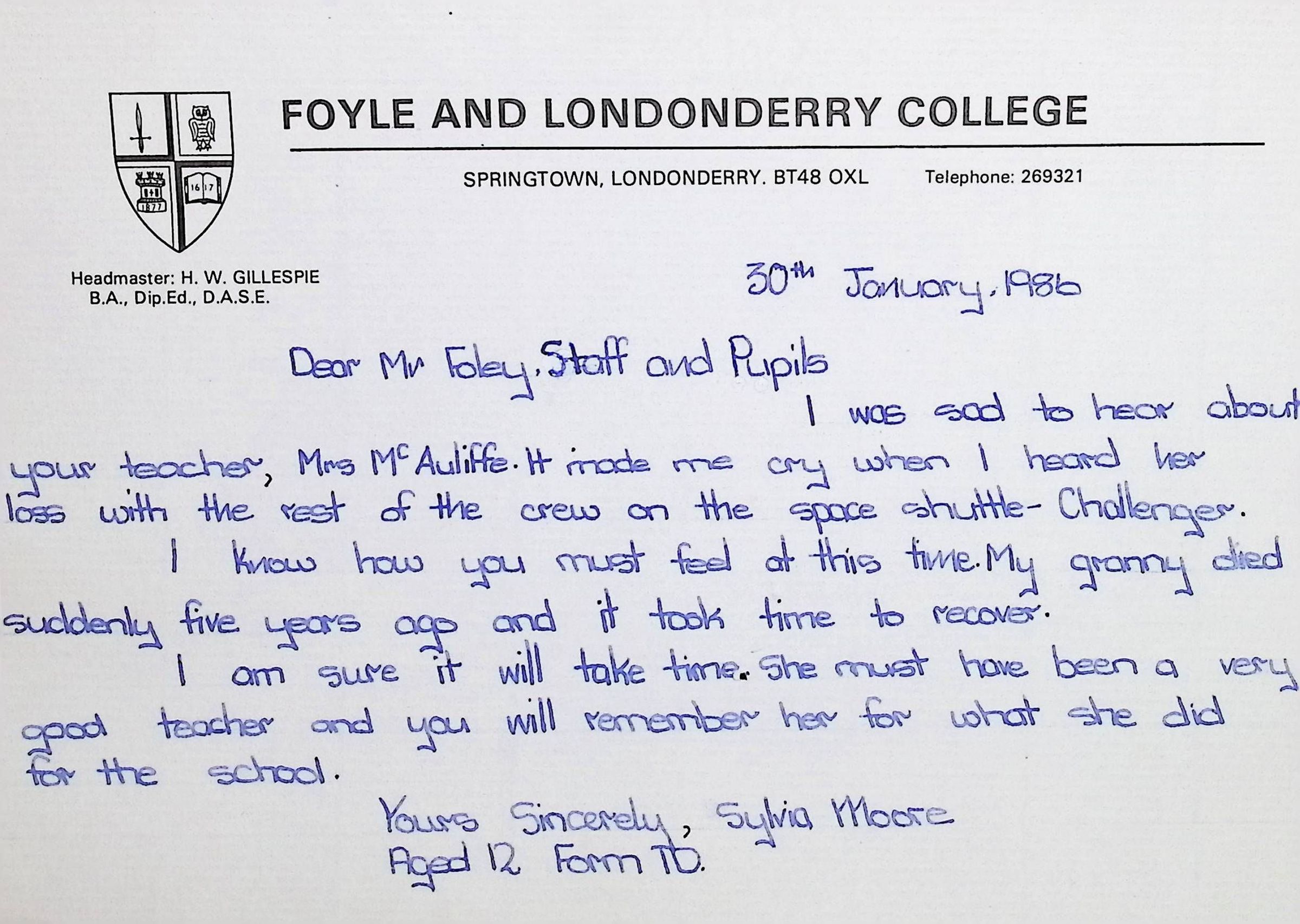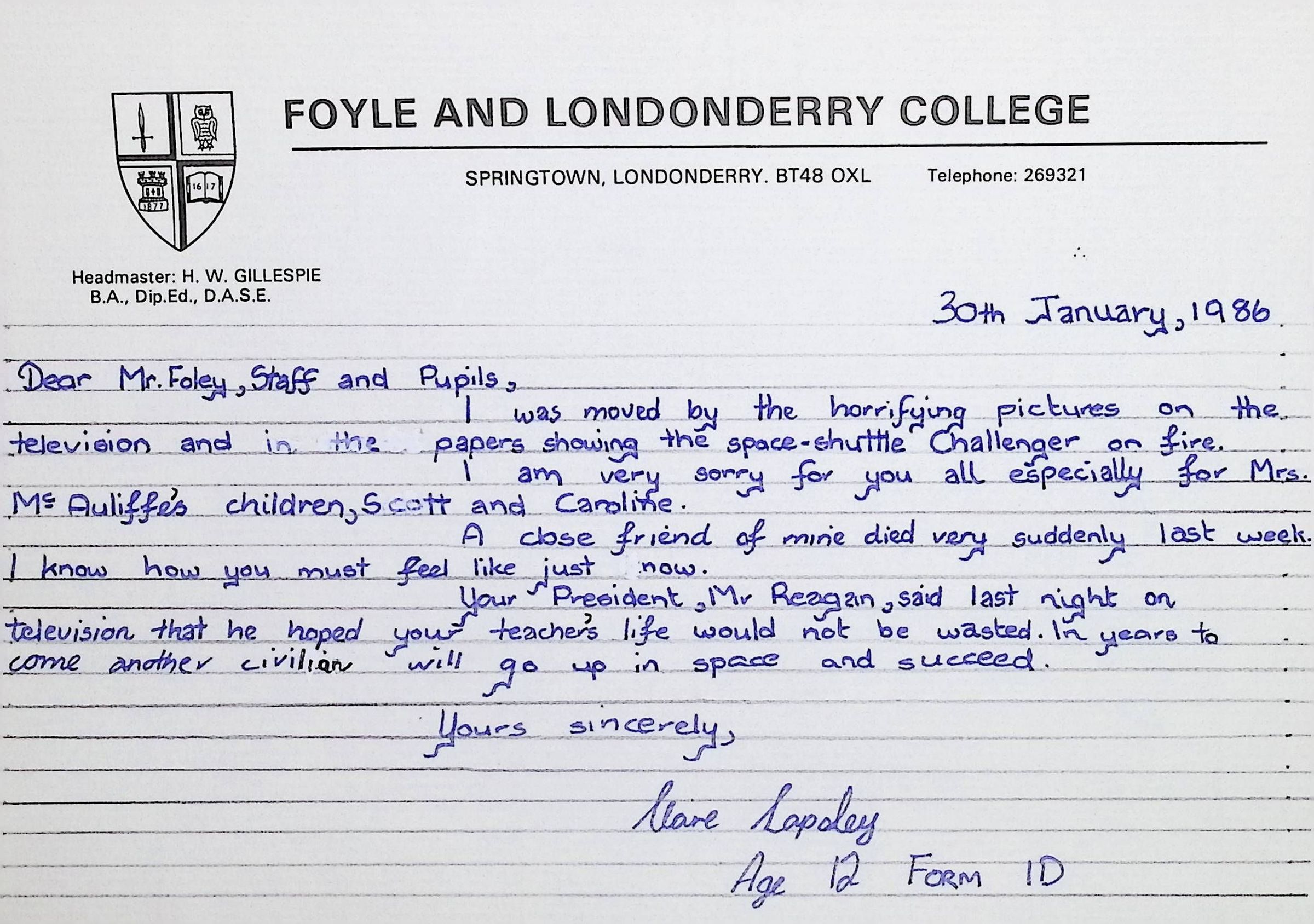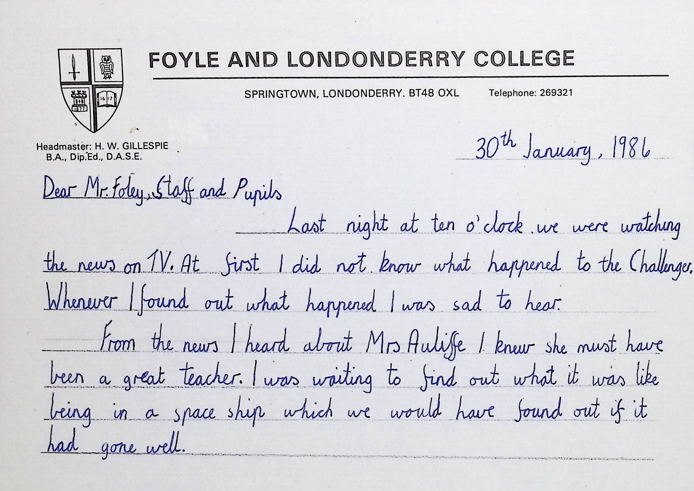 Handwritten Letters to Charles Foley (Principal), Staff, and Pupils of Concord High School from Karen Madeleine Shaw of Foyle and Londonderry College (2 pages)
