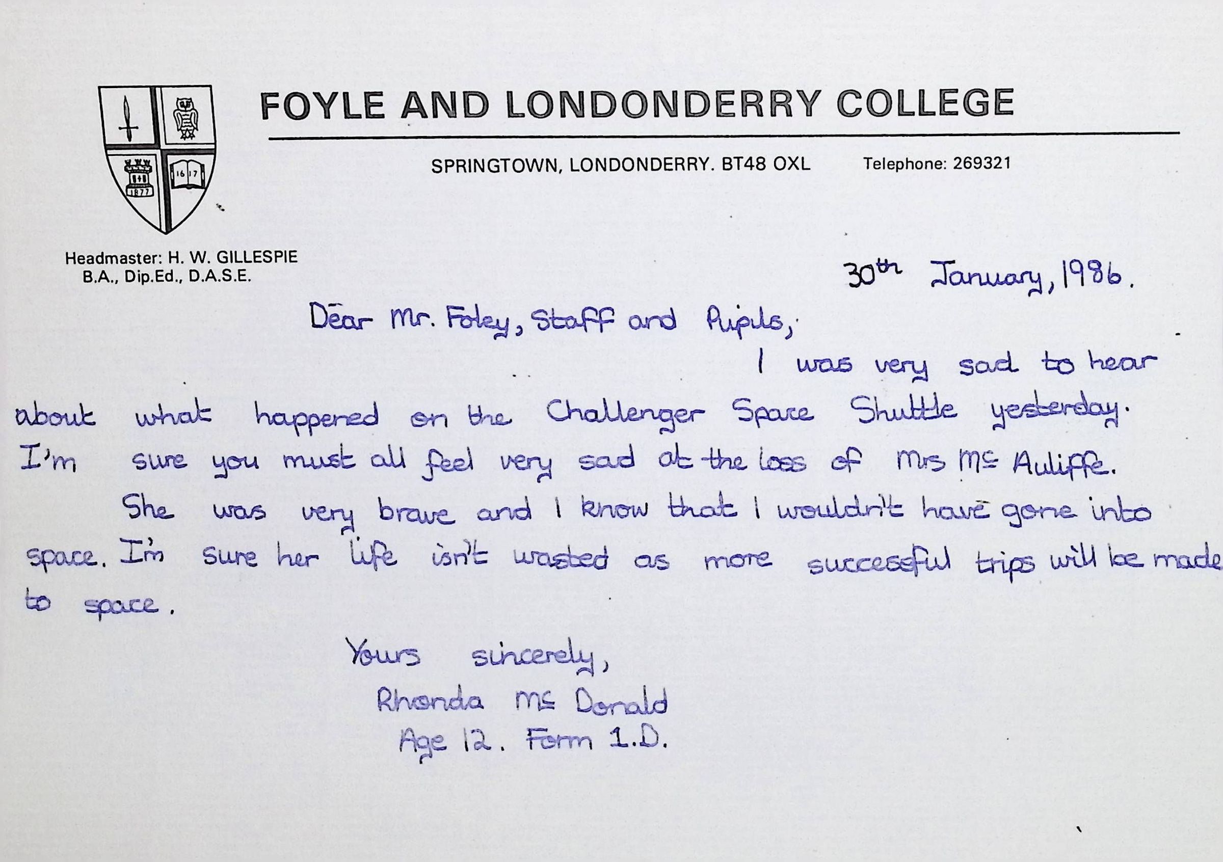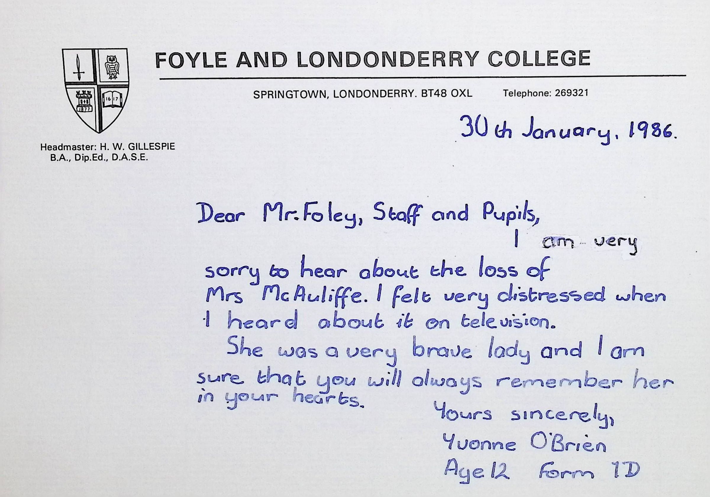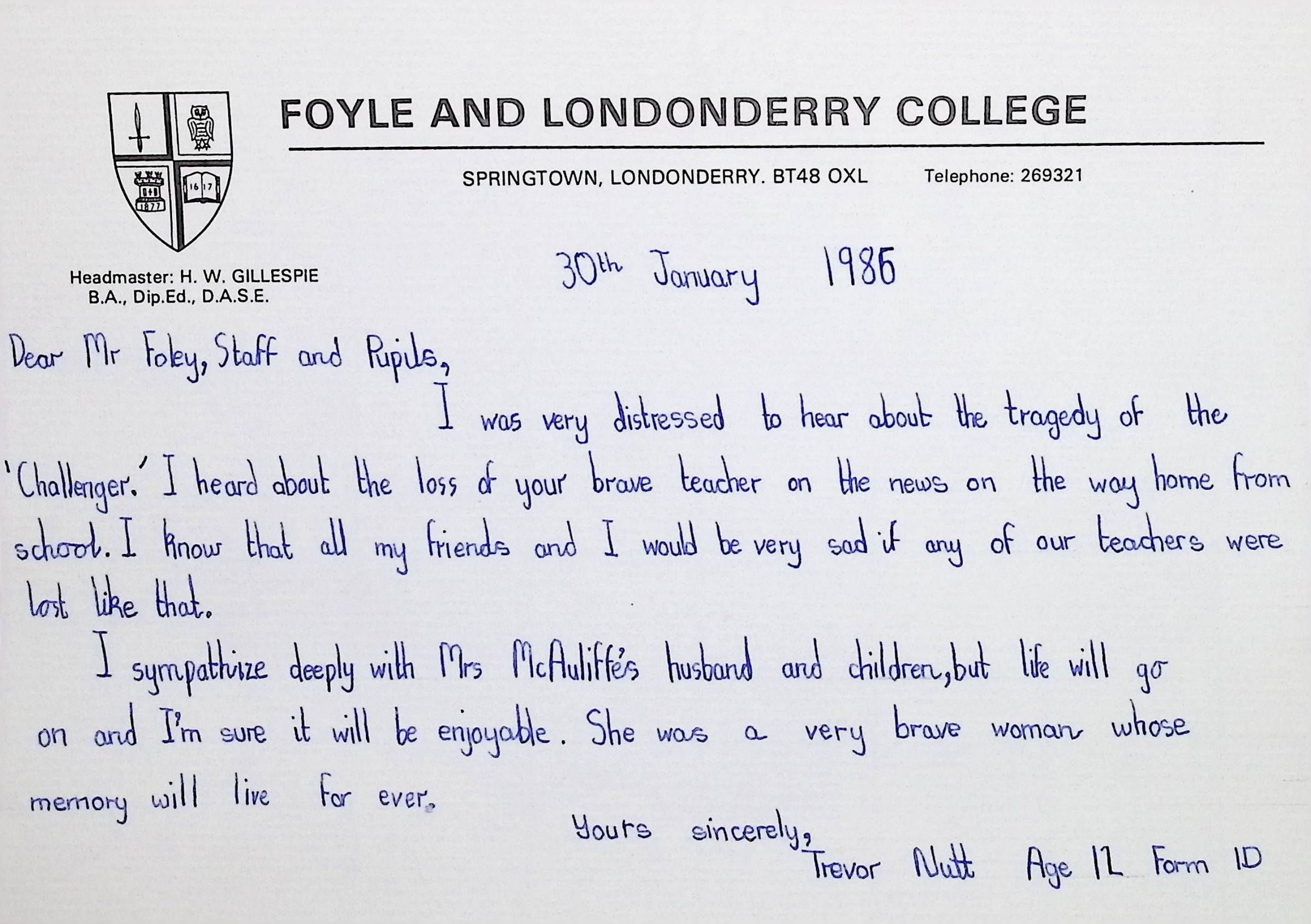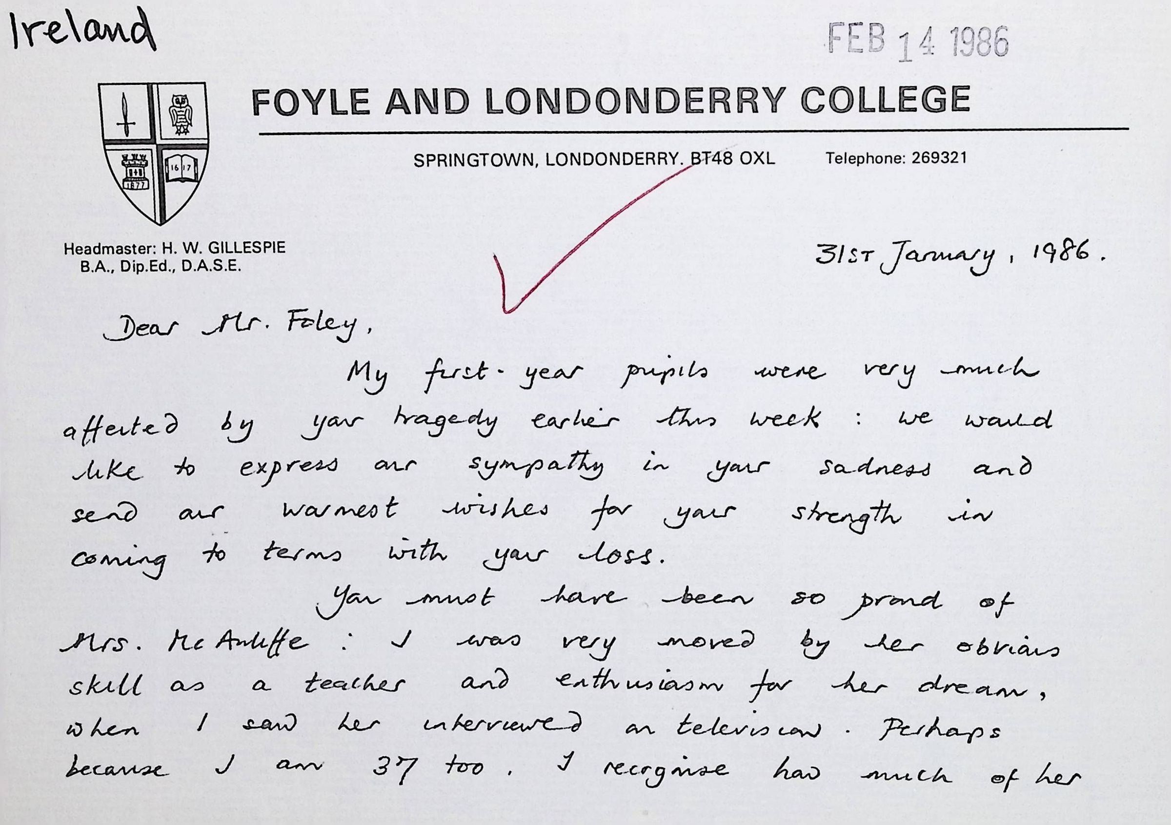 Handwritten Letters to Charles Foley (Principal), Staff, and Pupils of Concord High School from Karen Madeleine Shaw of Foyle and Londonderry College (2 pages)