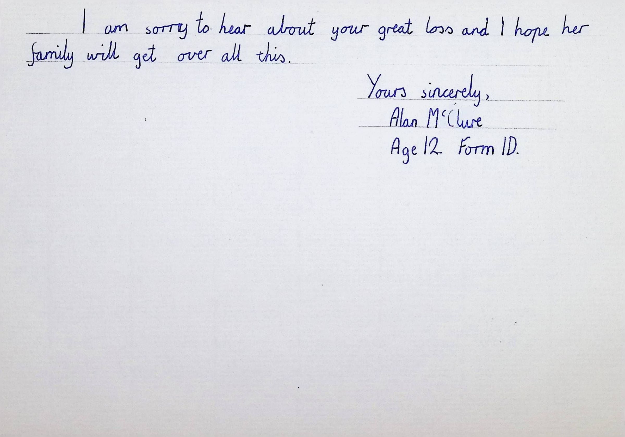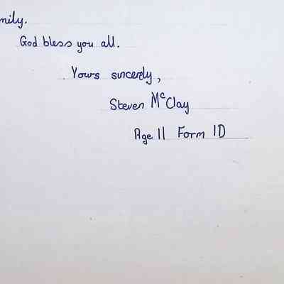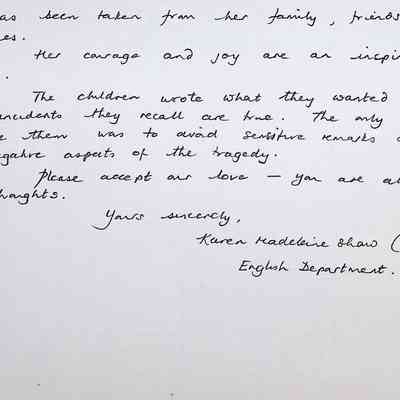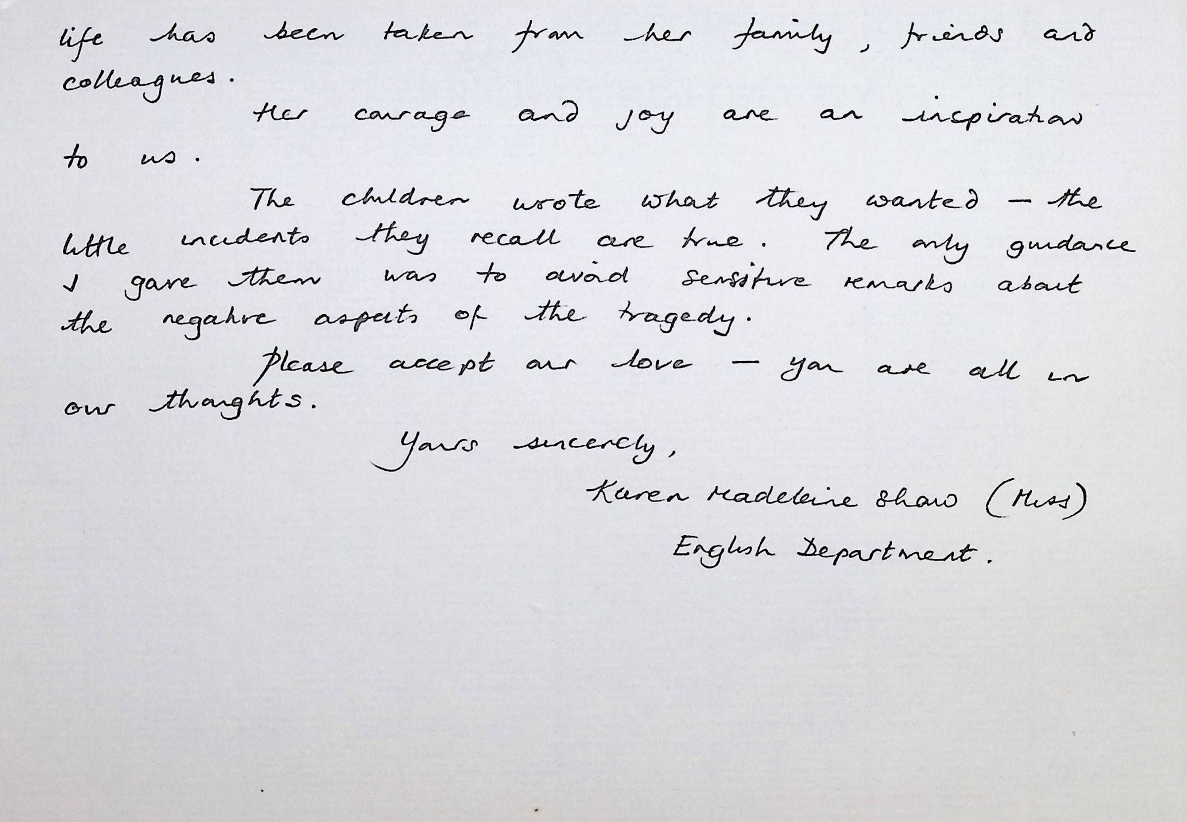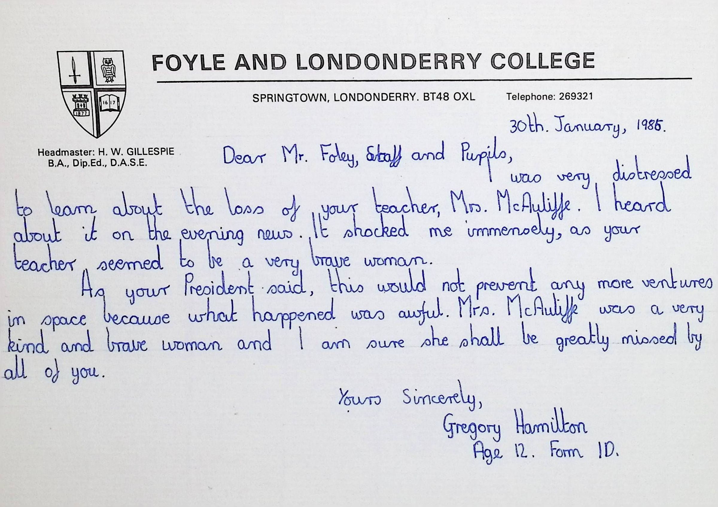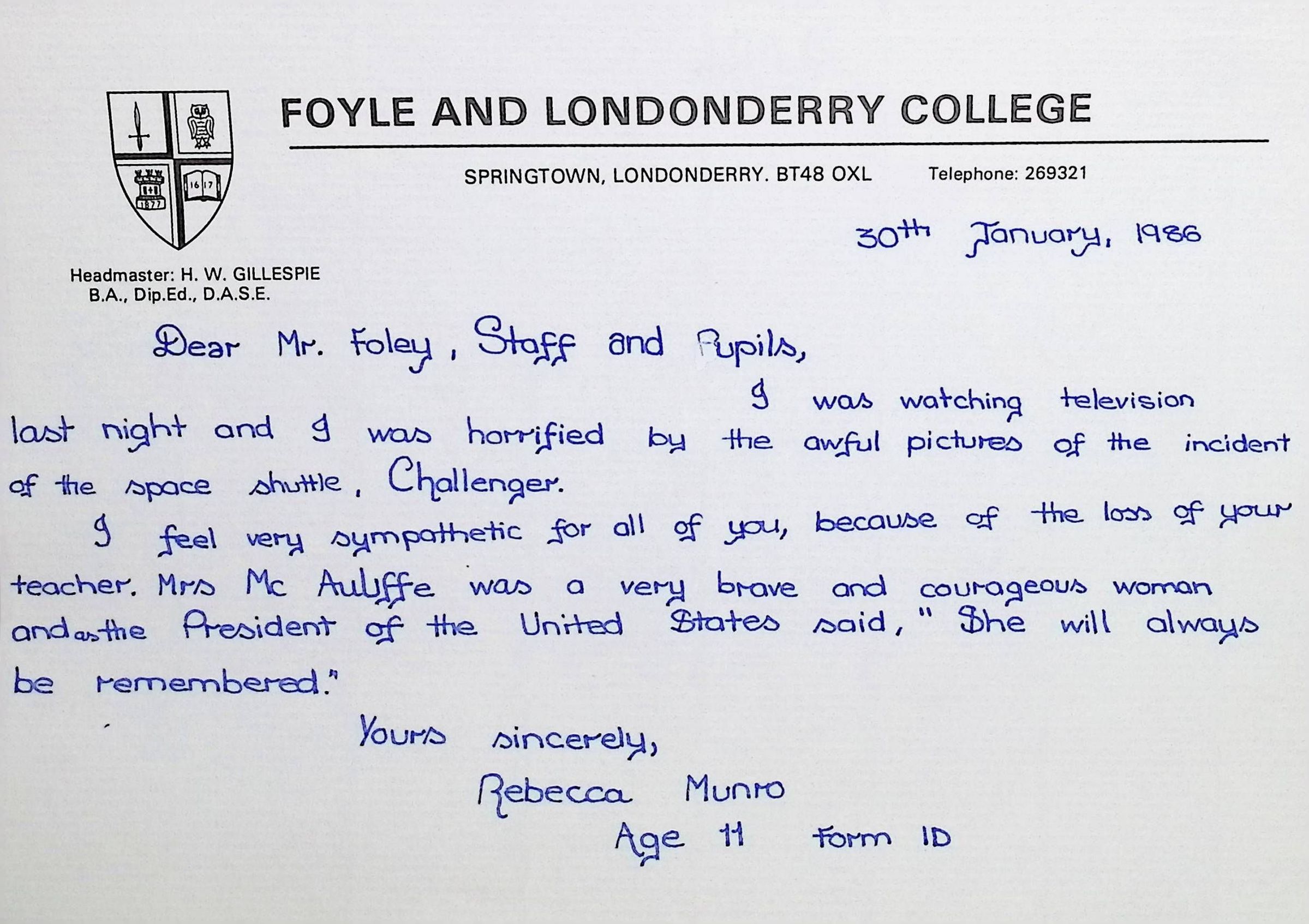 Handwritten Letters to Charles Foley (Principal), Staff, and Pupils of Concord High School from Karen Madeleine Shaw of Foyle and Londonderry College (2 pages)