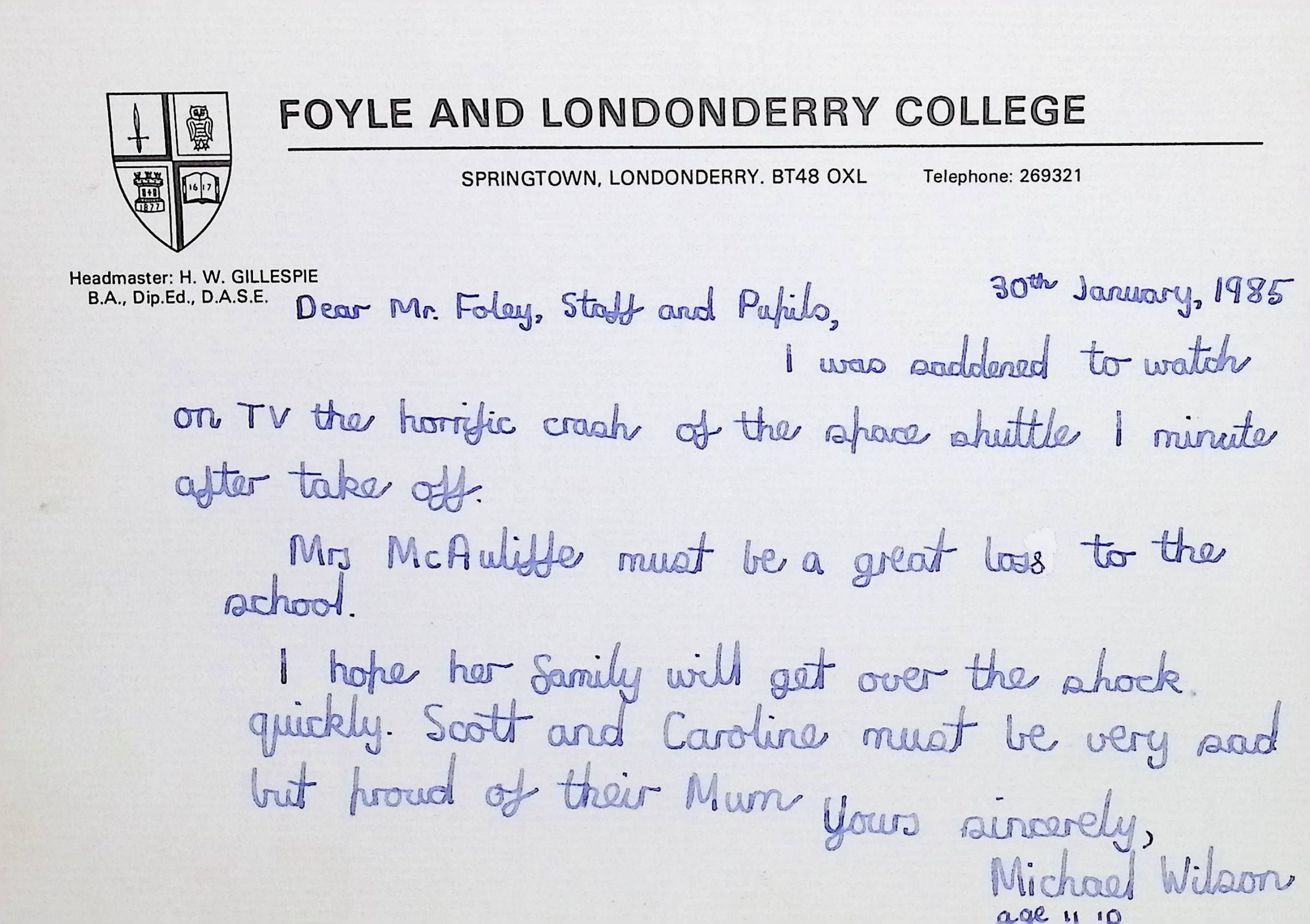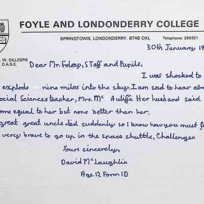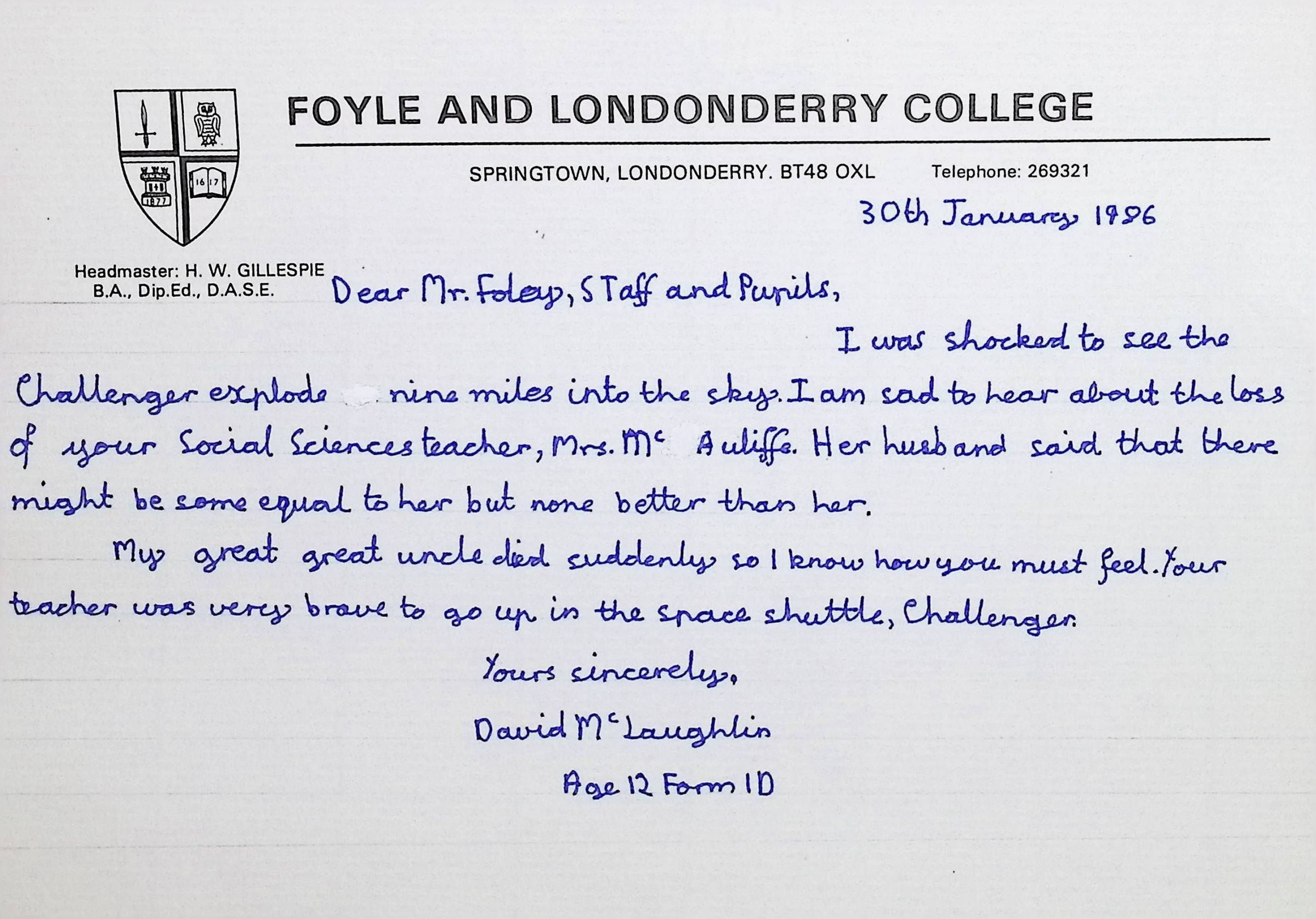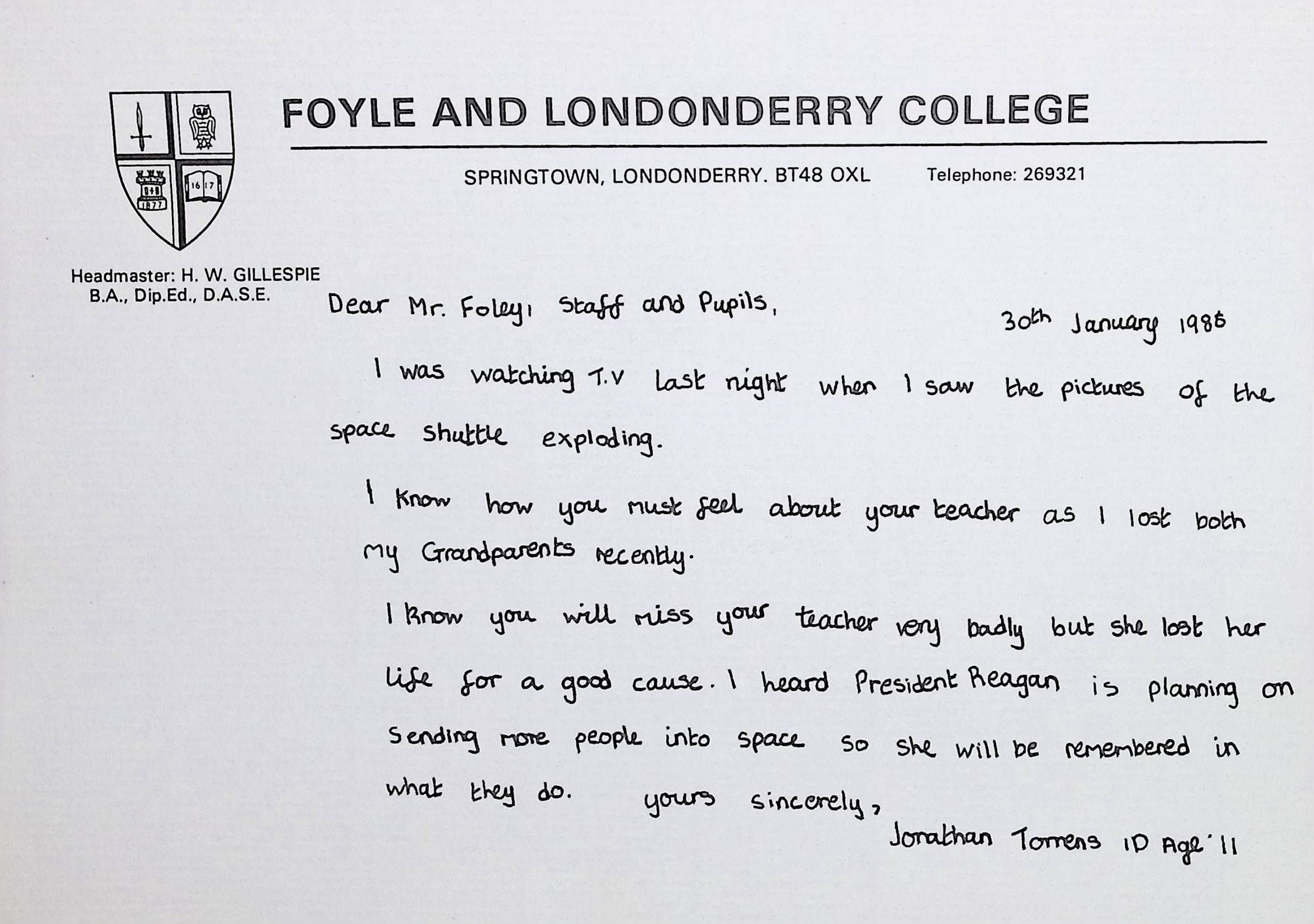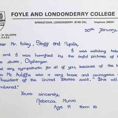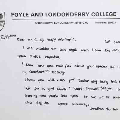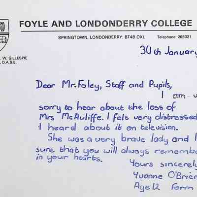 Attached: Handwritten letters to Charles Foley (Principal), Staff, and Pupils of Concord High School from students from Foyle and Londonderry College