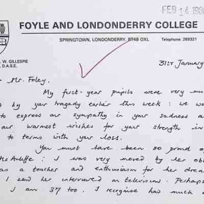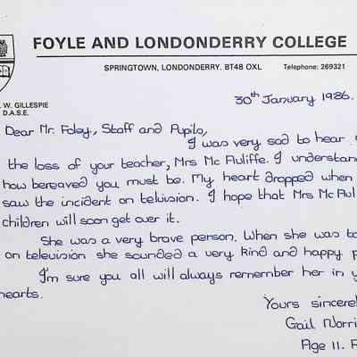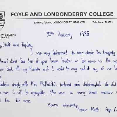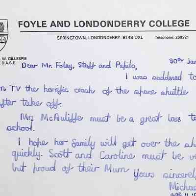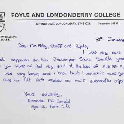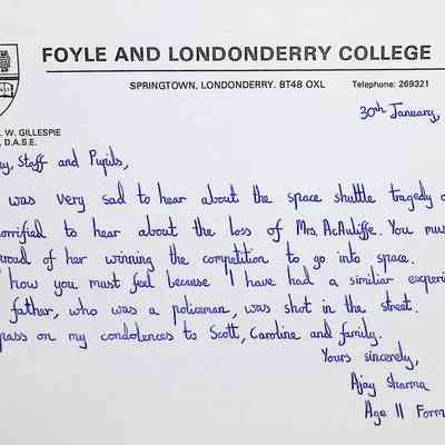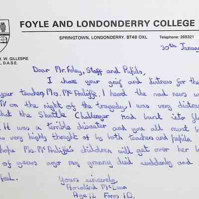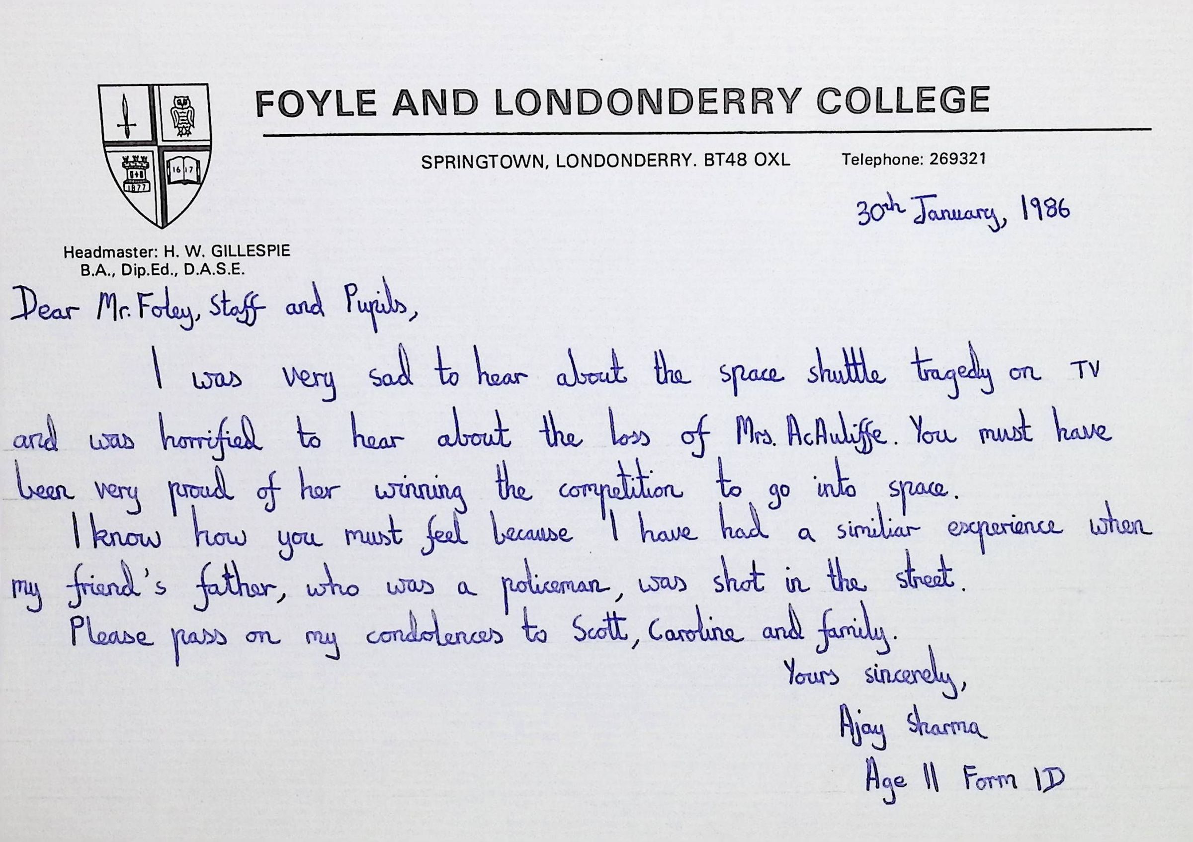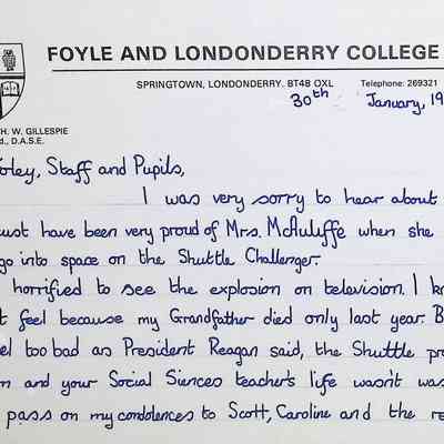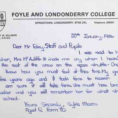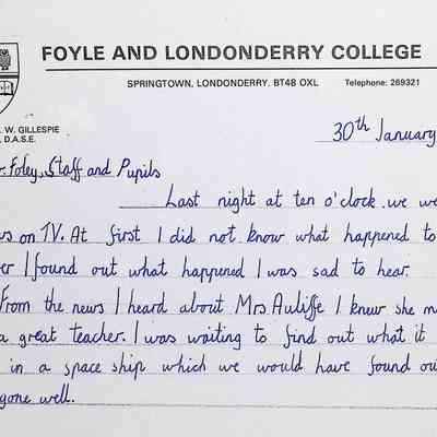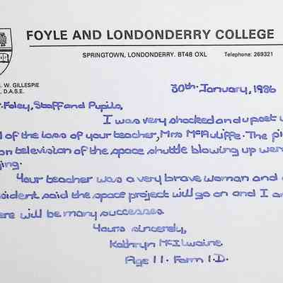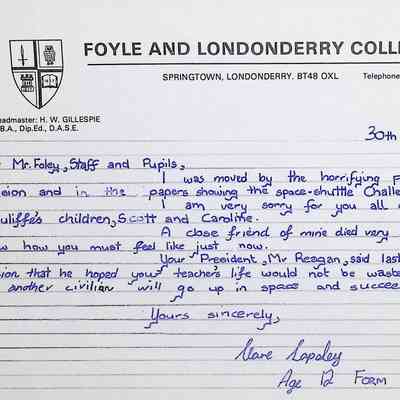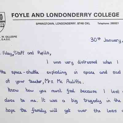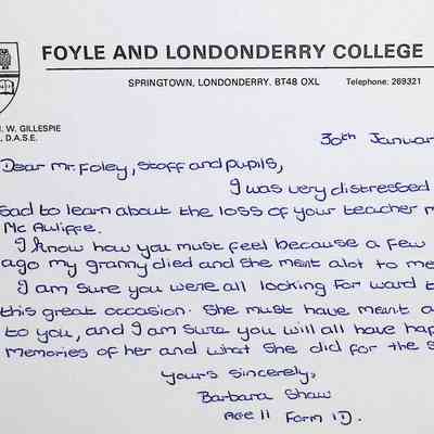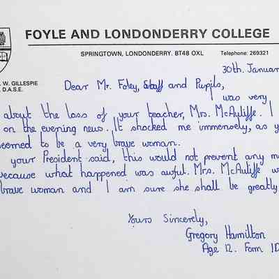 Attached: Handwritten letters to Charles Foley (Principal), Staff, and Pupils of Concord High School from students from Foyle and Londonderry College