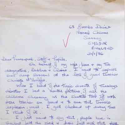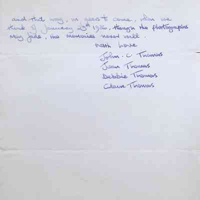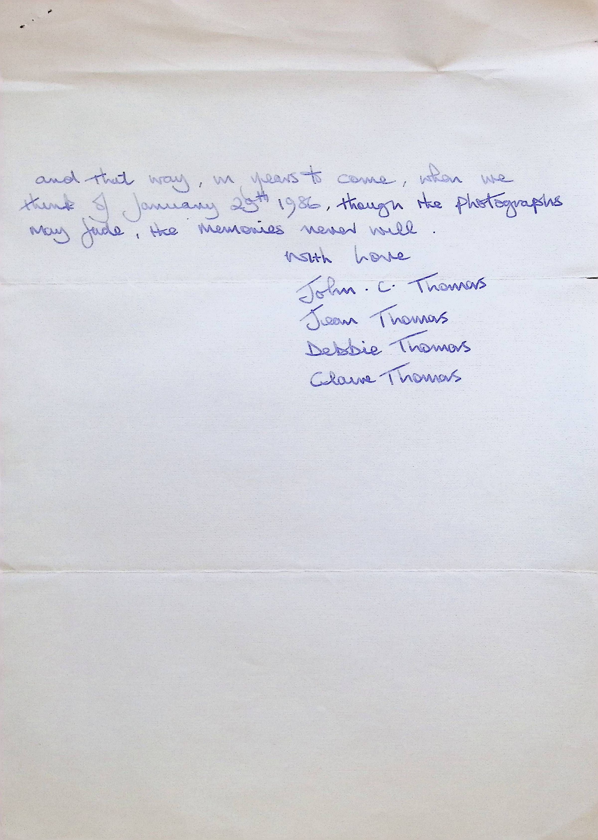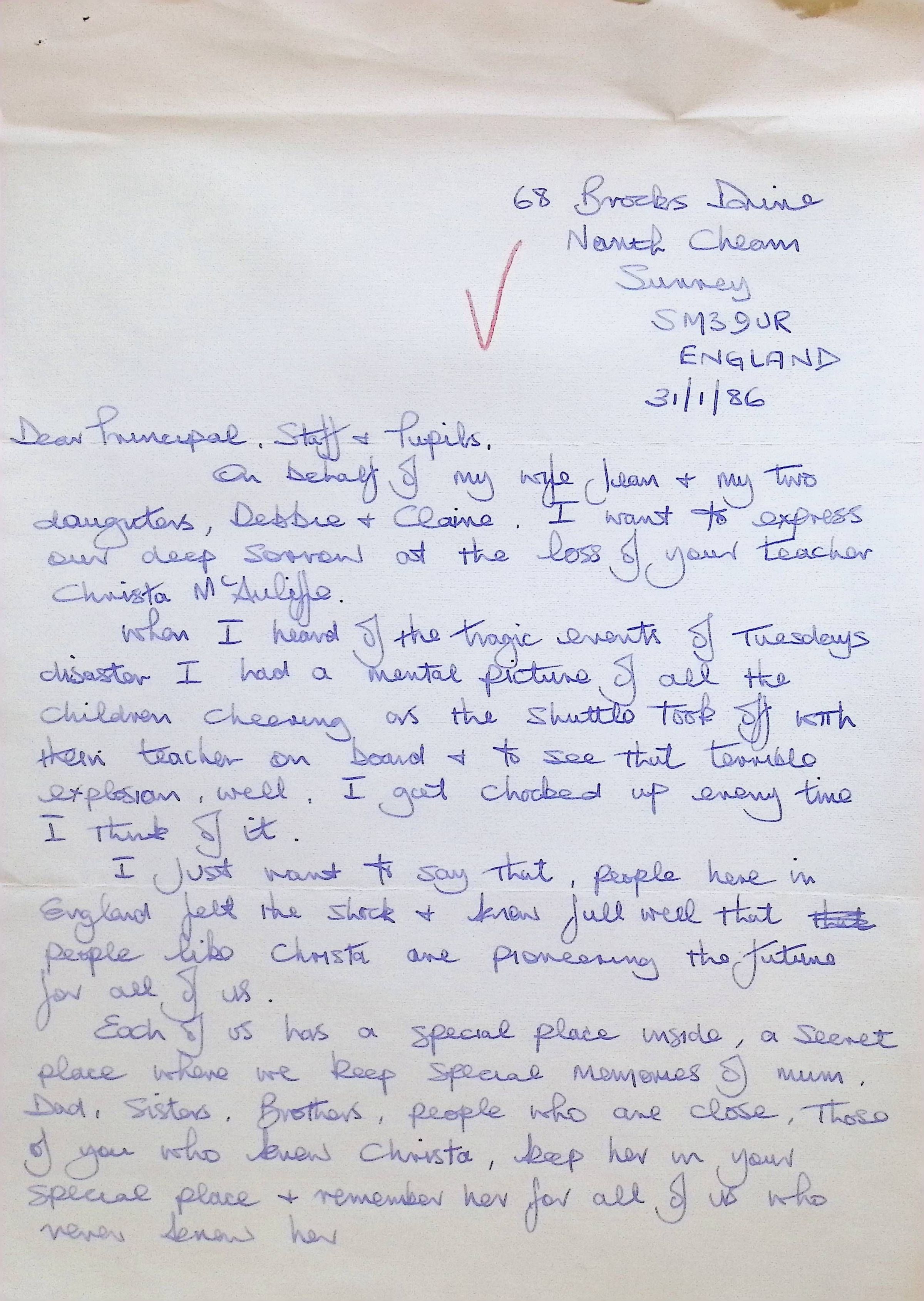 Handwritten Letter to Principal, Staff, and Pupils of Concord High School from John, Jean, Debbie, and Claire Thomas (England)