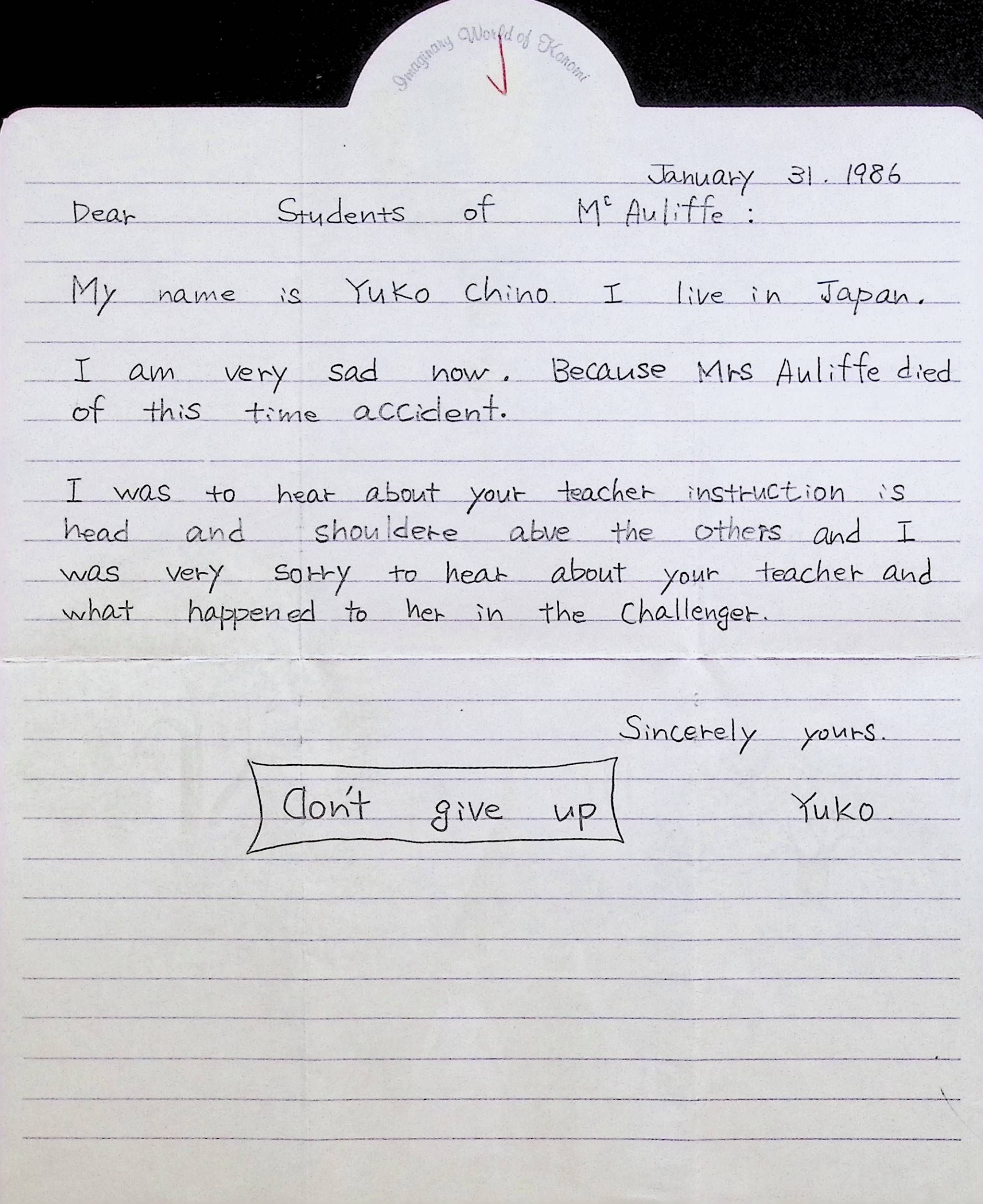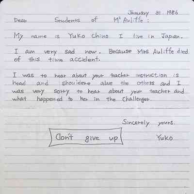 Letter to Students of McAuliffe (Concord High School) from Yuko Chino (Japan) Dated January 31, 1986