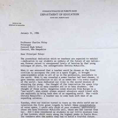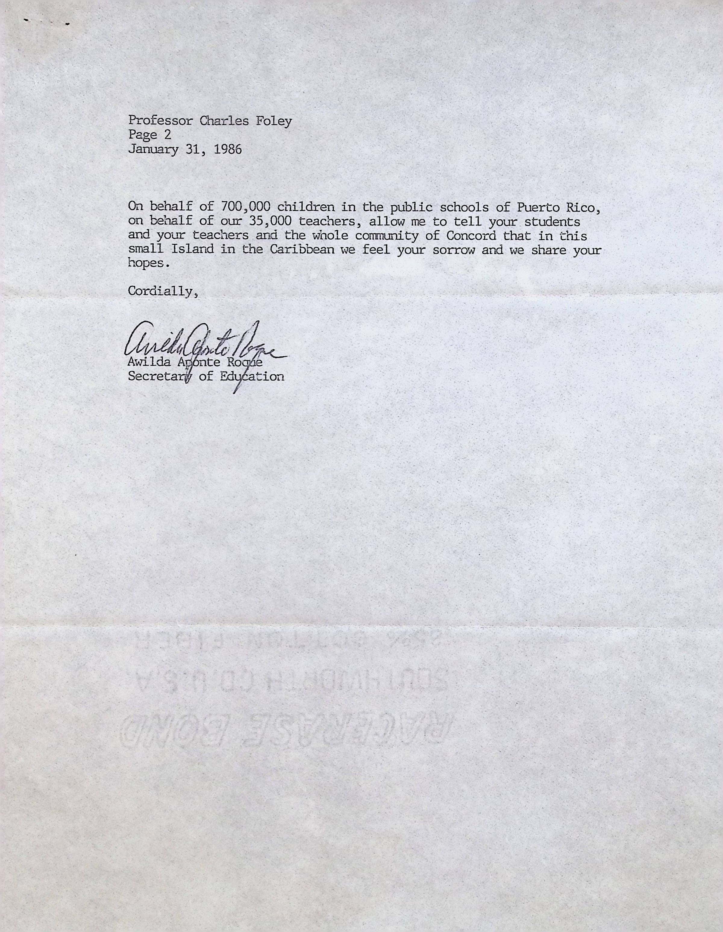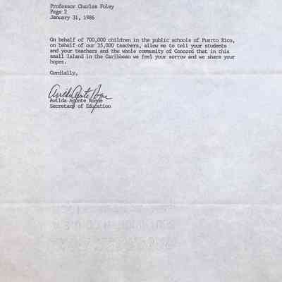 Typed Letter to Charles Foley (Principal of Concord High School) from Awilda Aponte Roque (Secretary of Commonwealth of Puerto Rico Department of Education)