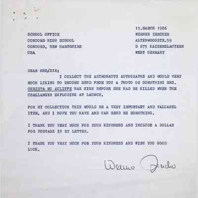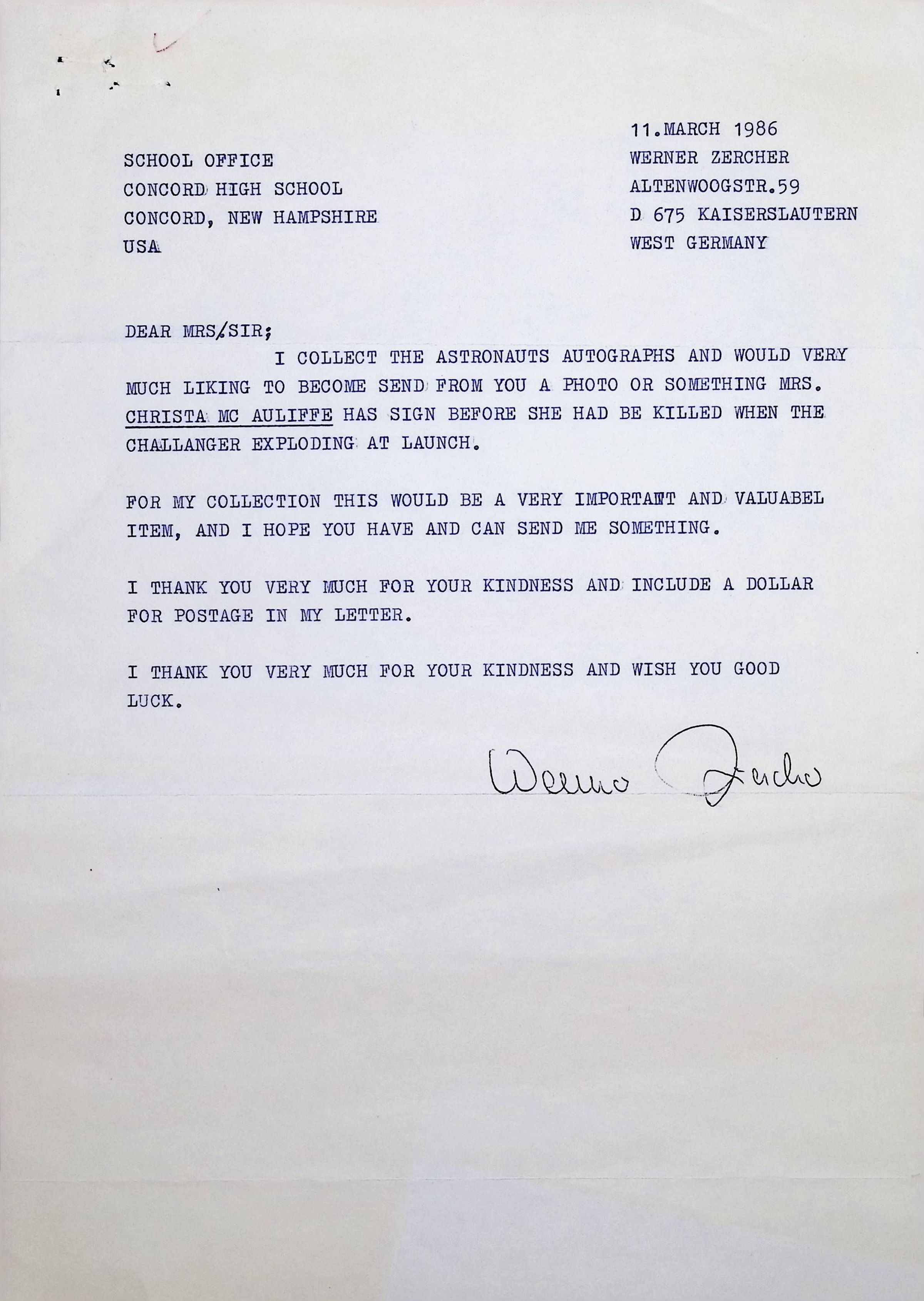 Typed letter to Concord High School from Werner Zercher
