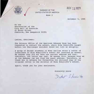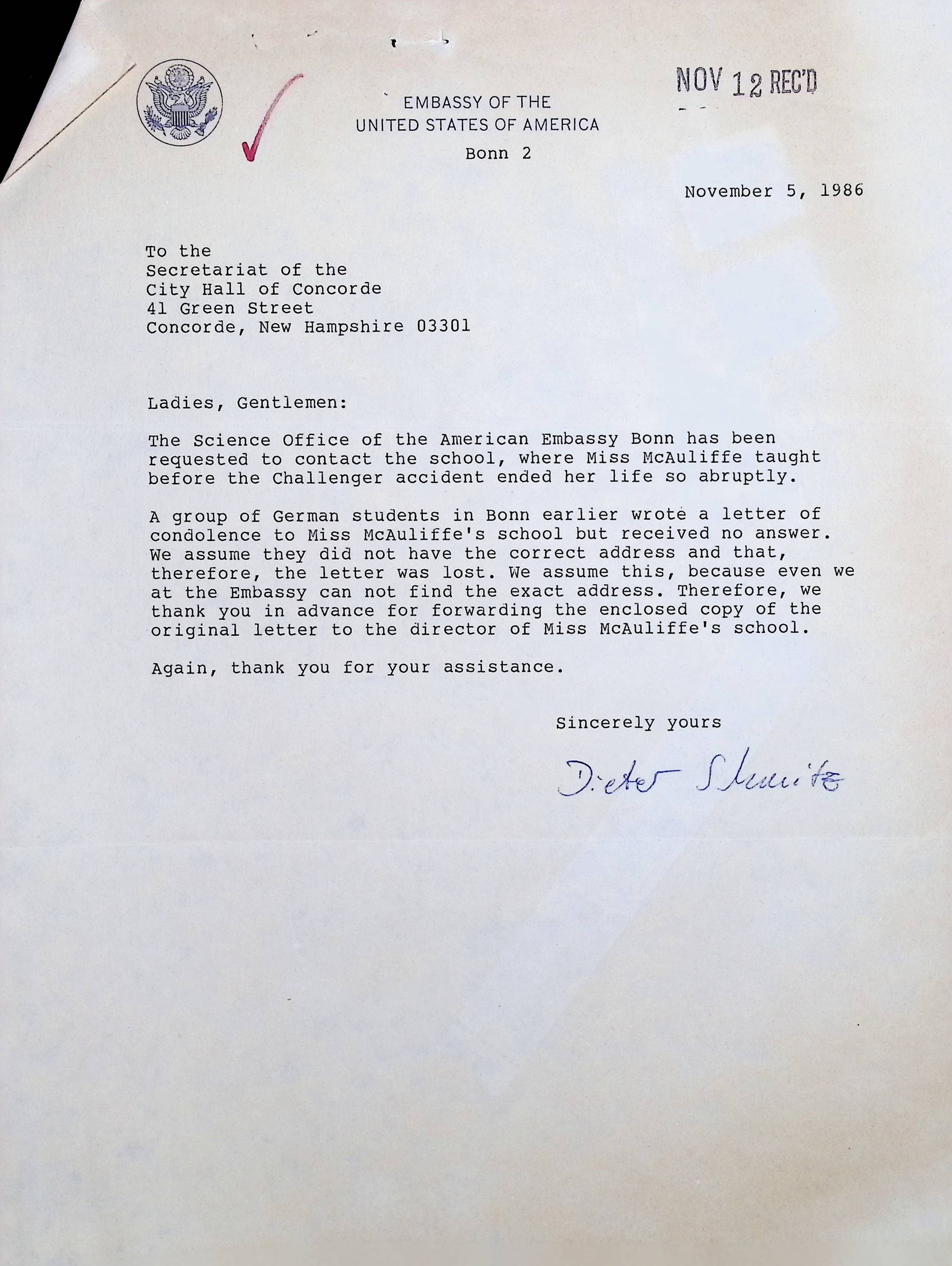 Typed letter to Secretary of Concord City Hall from Dieter (last name indecipherable) from the Science Office in the American Embassy Bonn