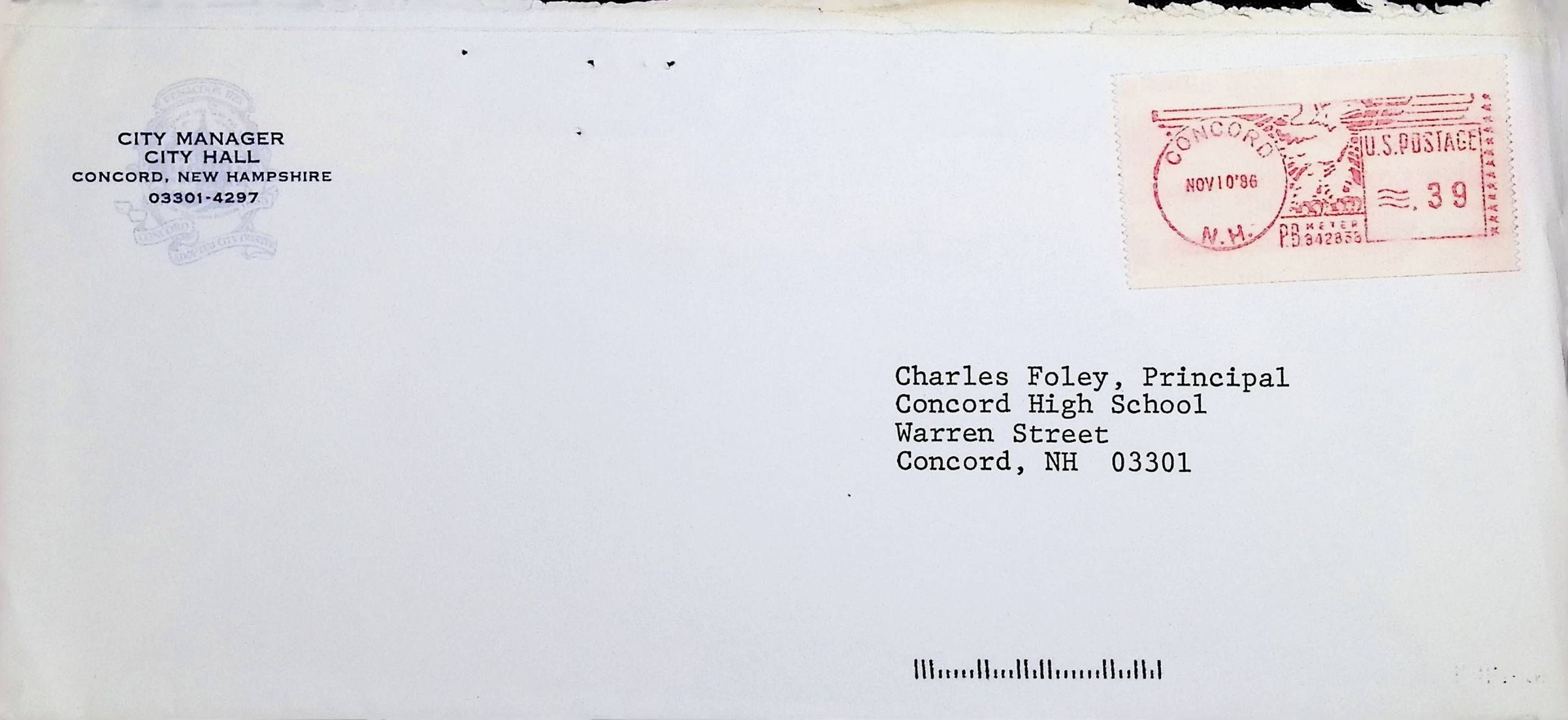 Addressed to Charles Foley, Principal of Concord High from City Manager of Concord City Hall