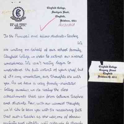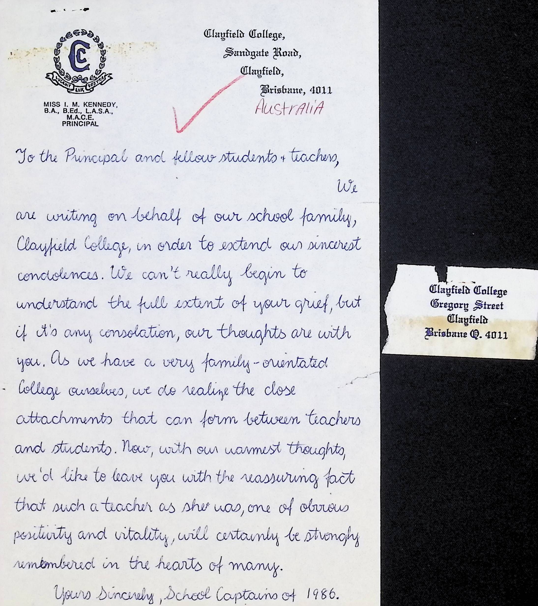 Letter to Concord High School Principal (Charles Foley) and Students from Clayfield College School Captains of 1986 (Australia)