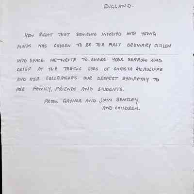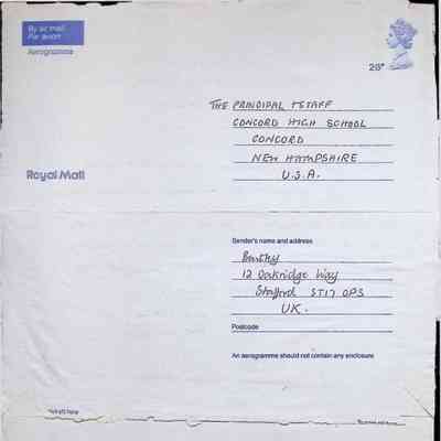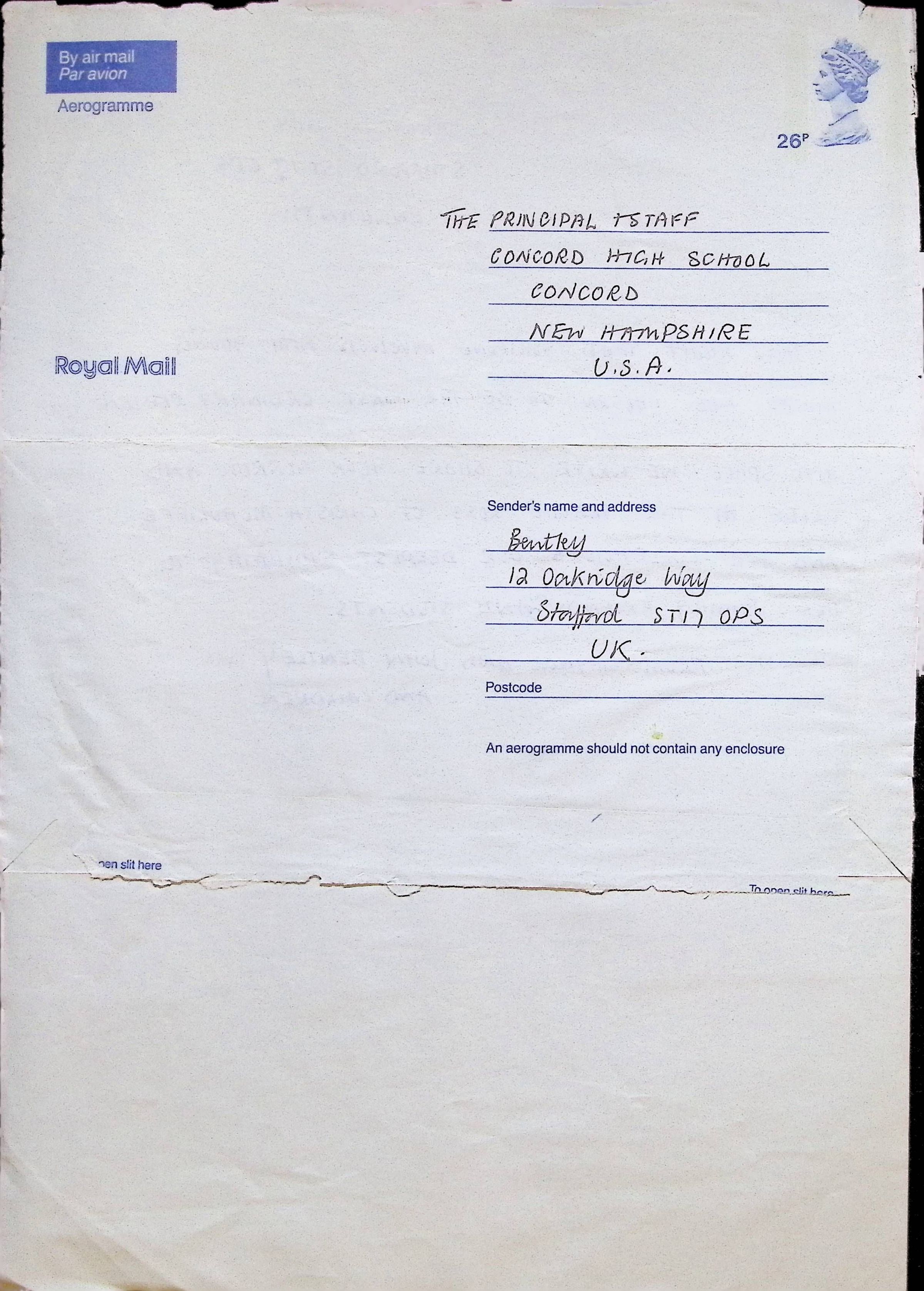 Aerogramme Letter to the Principal and Staff of Concord High School) from Gaynor and John Bentley
