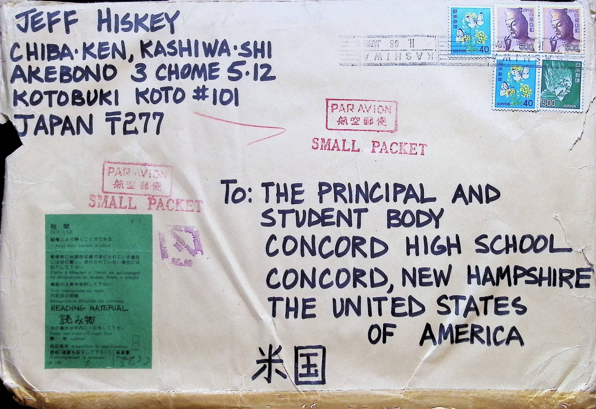 Addressed to Principal and Student Body of Concord High School from Jeff Hiskey of Edogawa Gakuen Toride High School