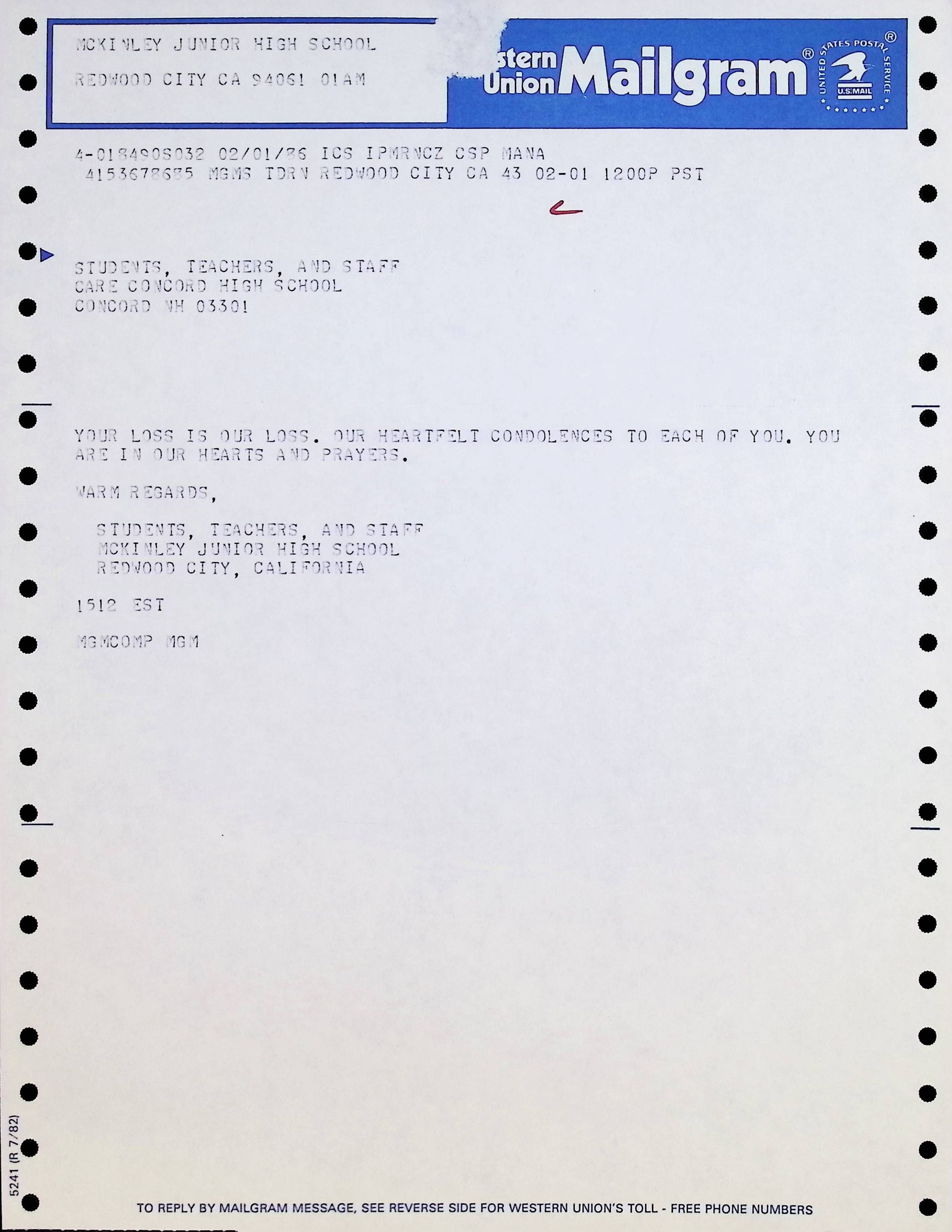 Western Union Mailgram To Concord High School from McKinley Junior High School Dated 2/1/1986