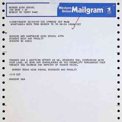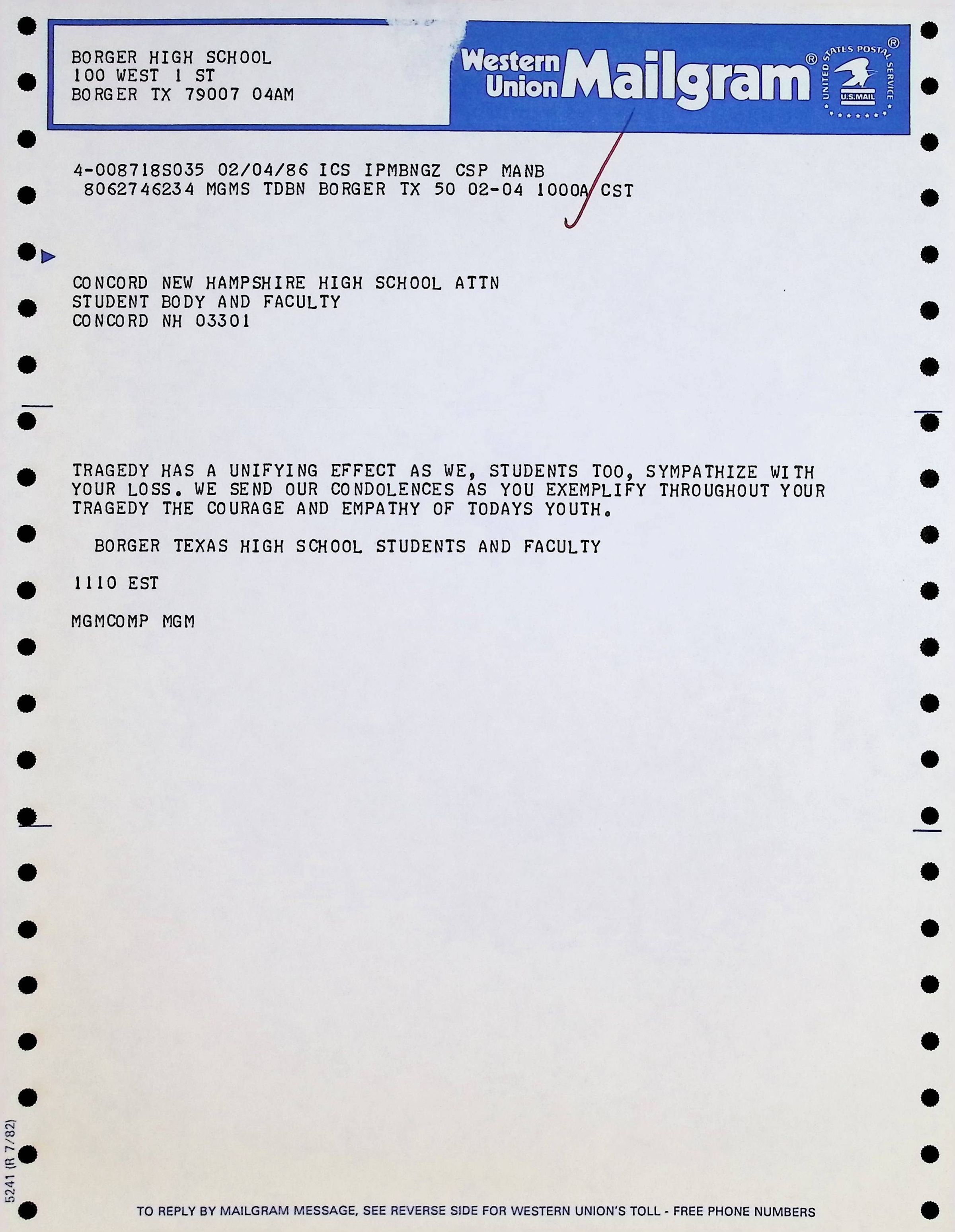 Western Union Mailgram To Concord High School from Borger Texas High School Dated 2/4/1986