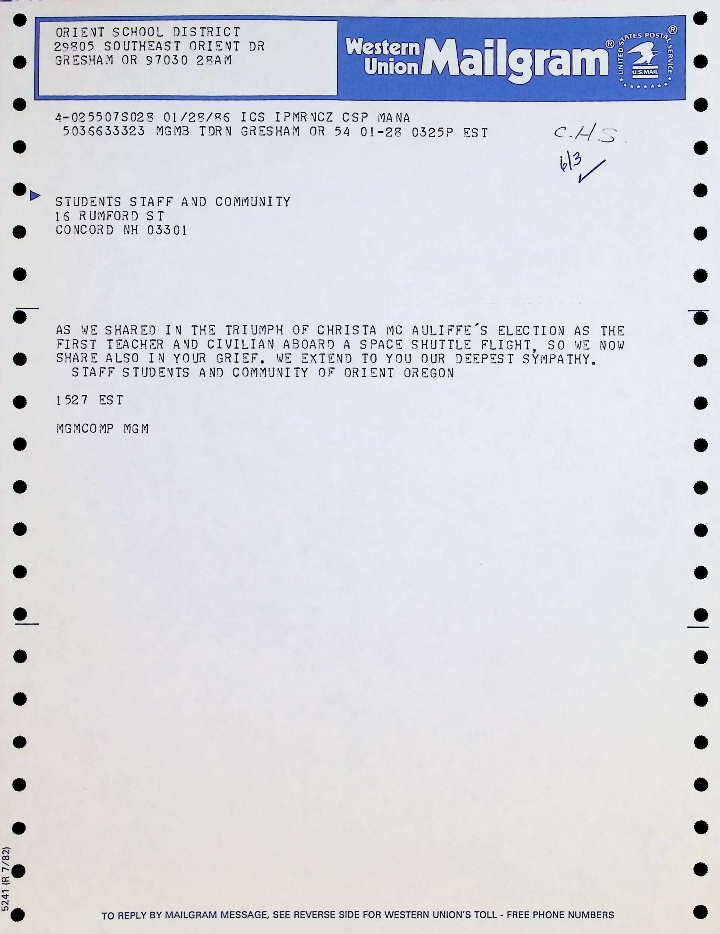 To Concord High School from Staff, Students, and Community of Orient, Oregon