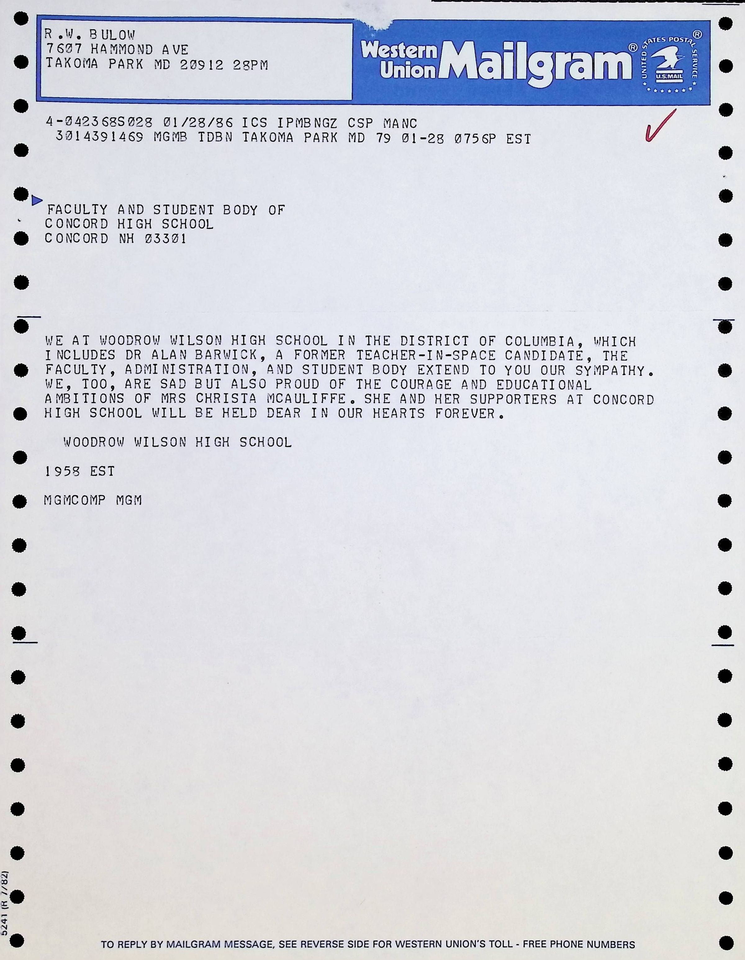 Mailgram dated January 28, 1986Entry/Object ID