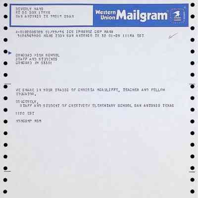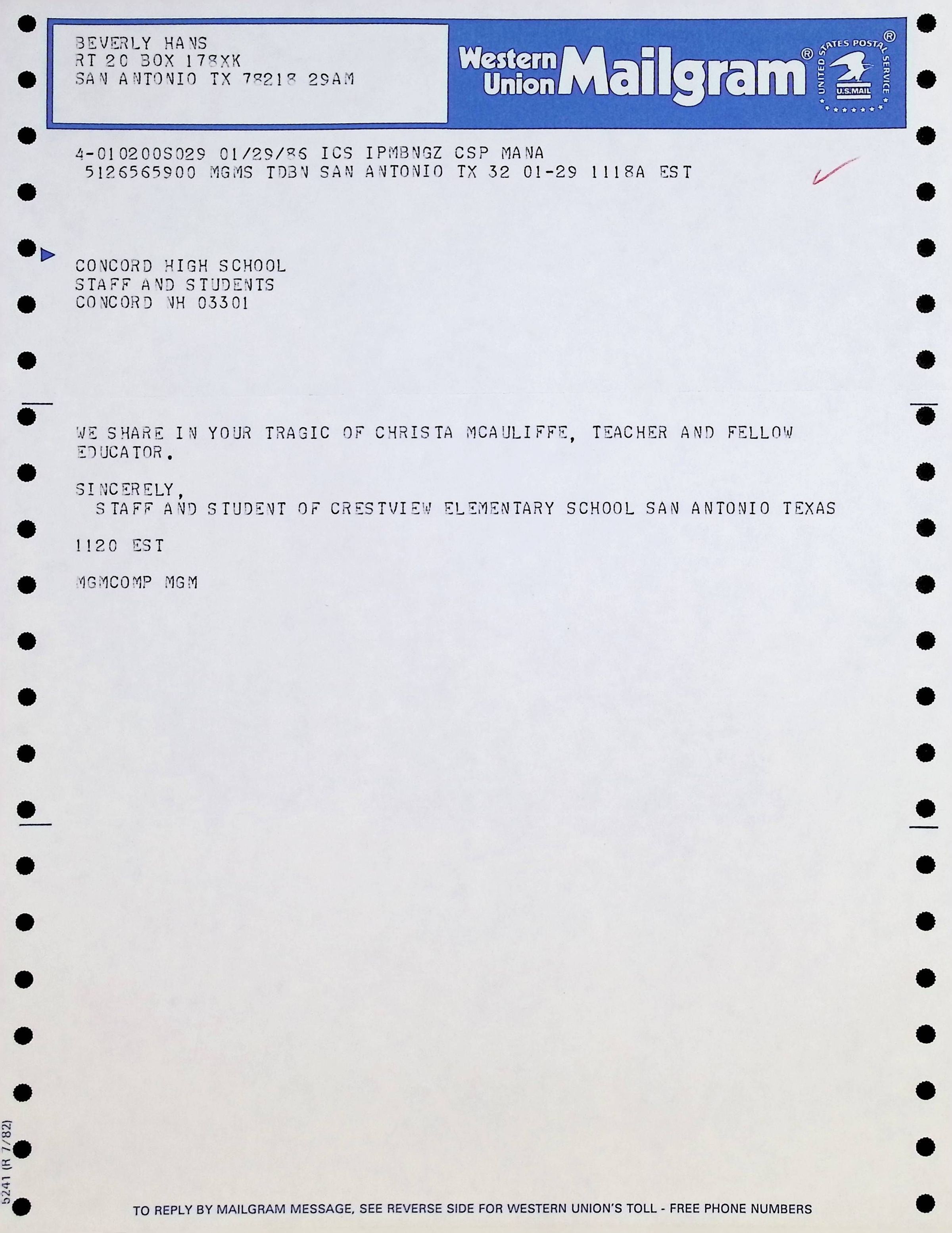 Western Union Mailgram To Concord High School from Crestview Elementary School Dated 1/29/1986