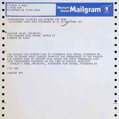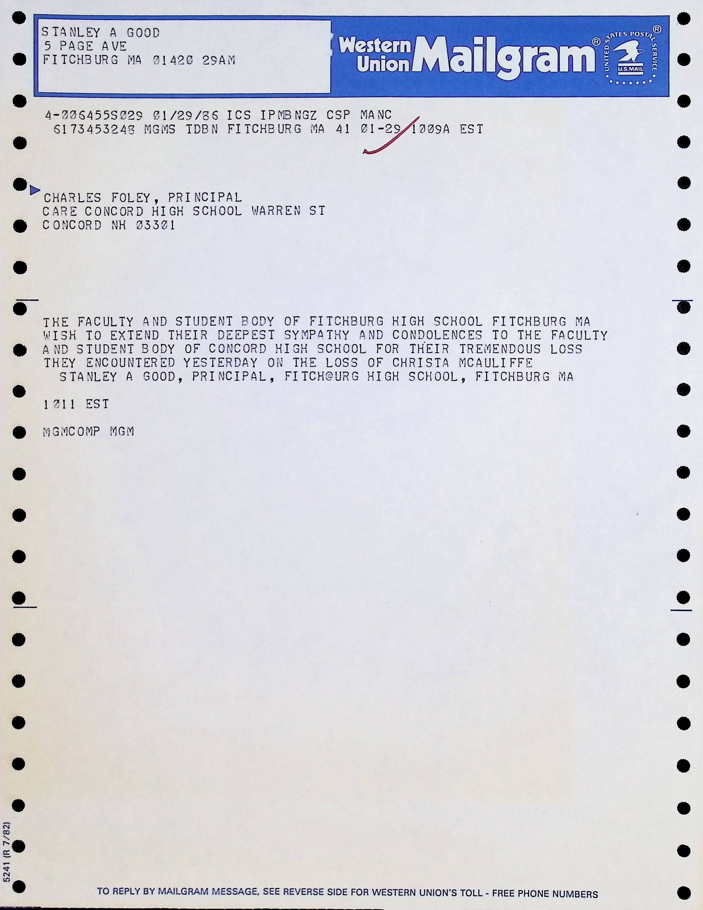 Western Union Mailgram To Concord High School from Fitchburg High School Dated 1/29/1986