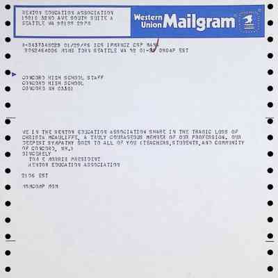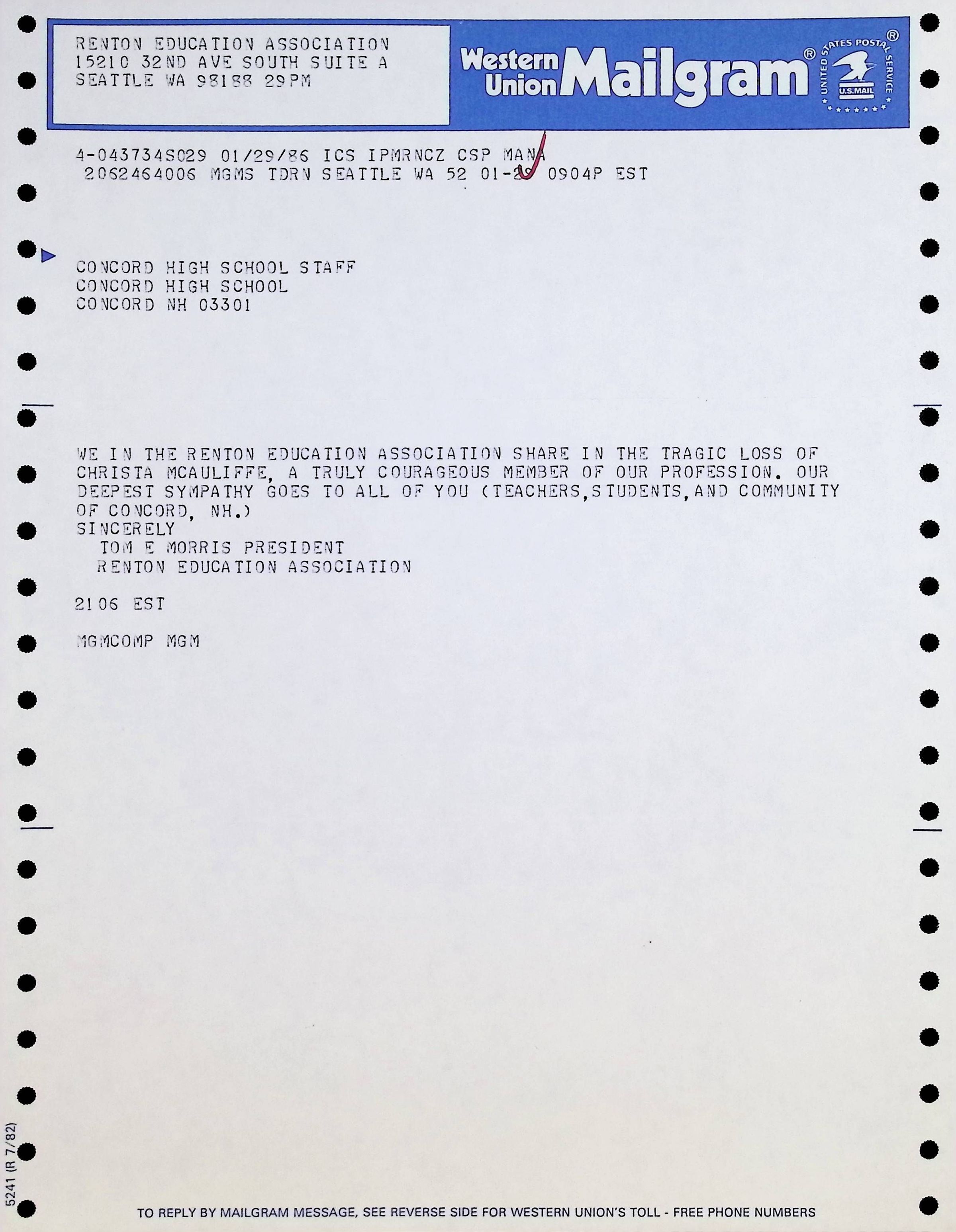 Western Union Mailgram To Concord High School from Renton Education Association Dated 1/29/1986