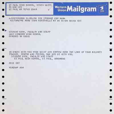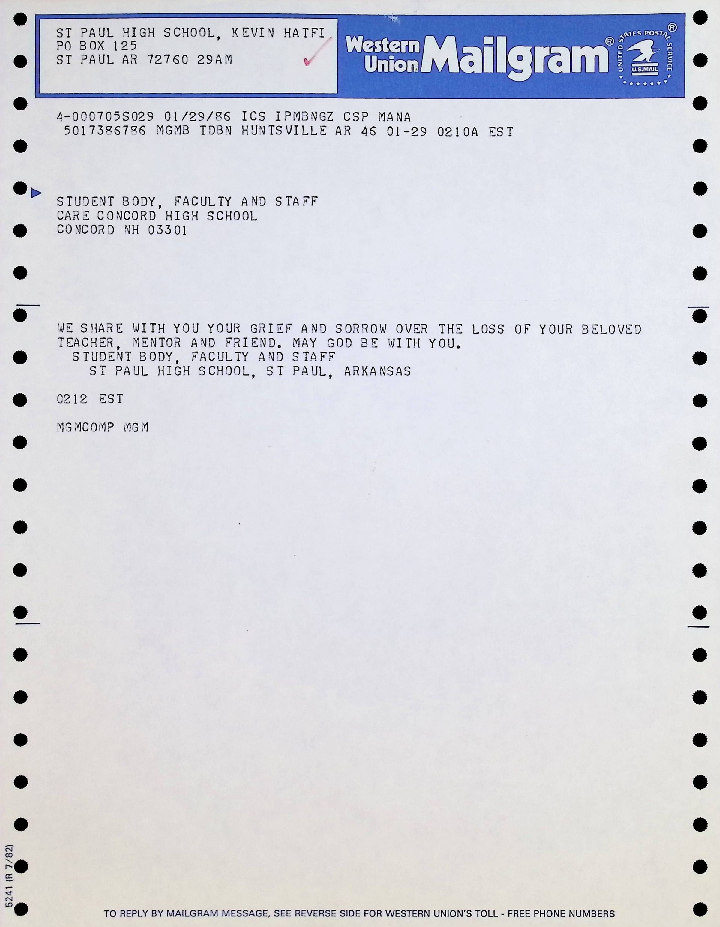 Western Union Mailgram To Concord High School from St. Paul High School Dated 1/29/1986