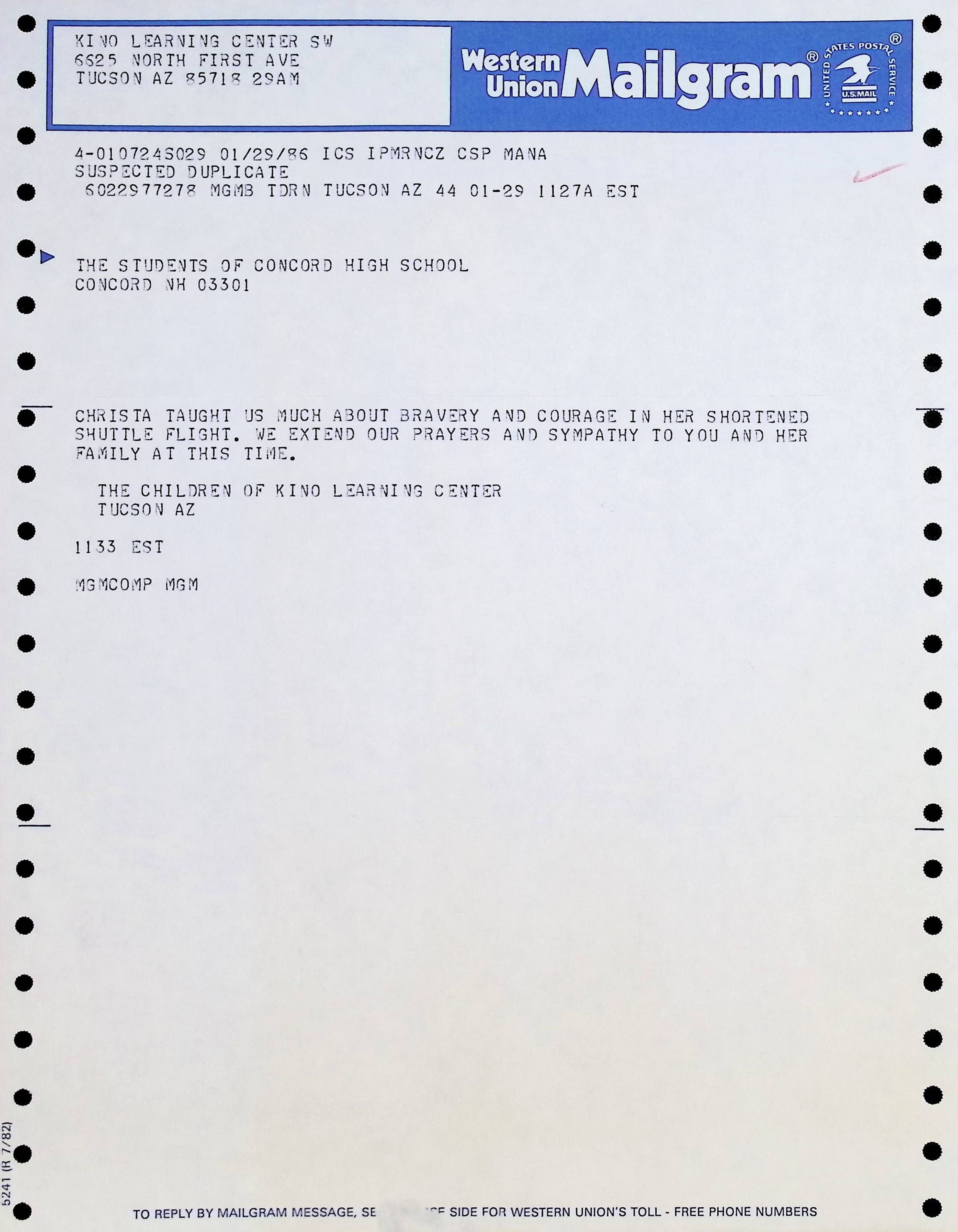 Mailgram dated January 29, 1986Entry/Object ID