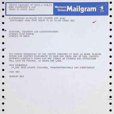 Western Union Mailgram To Concord High School from the United Teachers of Dade Dated 1/30/1986