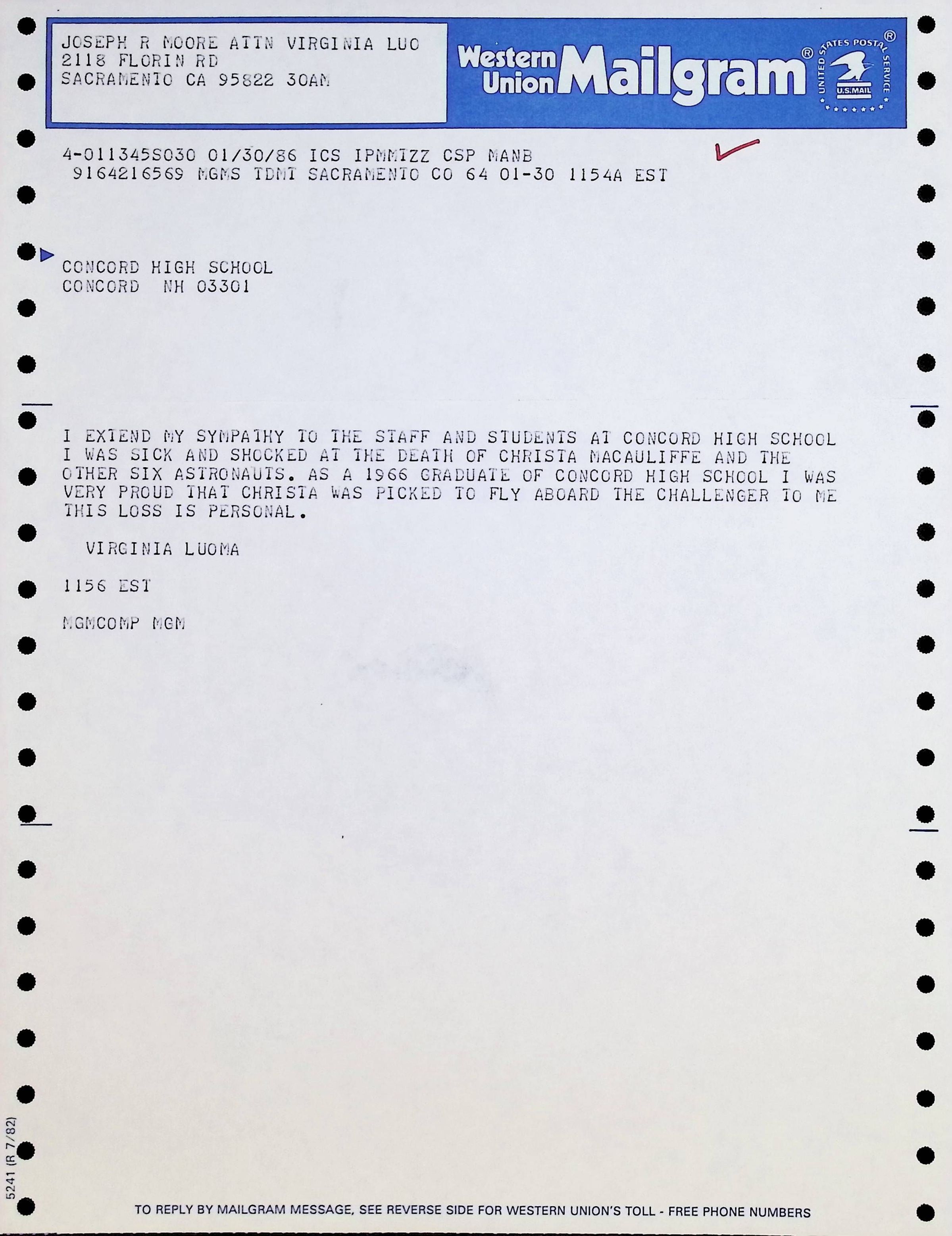 Western Union Mailgram To Concord High School from Virginia Luoma Dated 1/30/1986