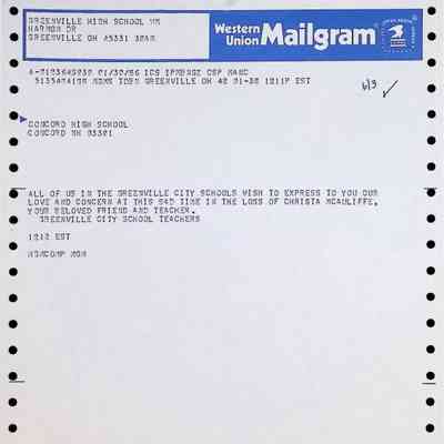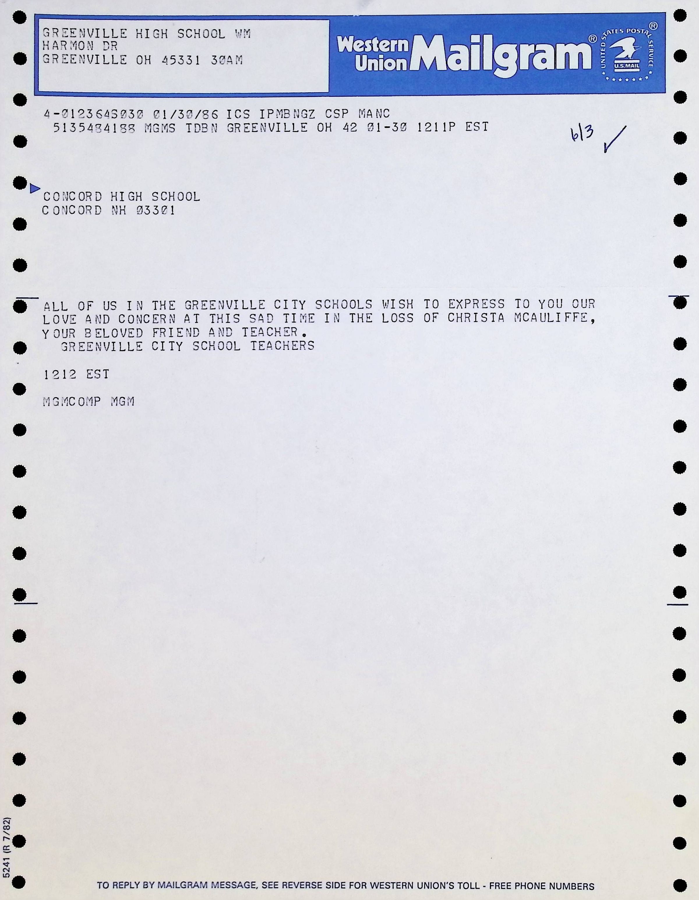 Western Union Mailgram To Concord High School from Greenville City Schools Dated 1/30/1986