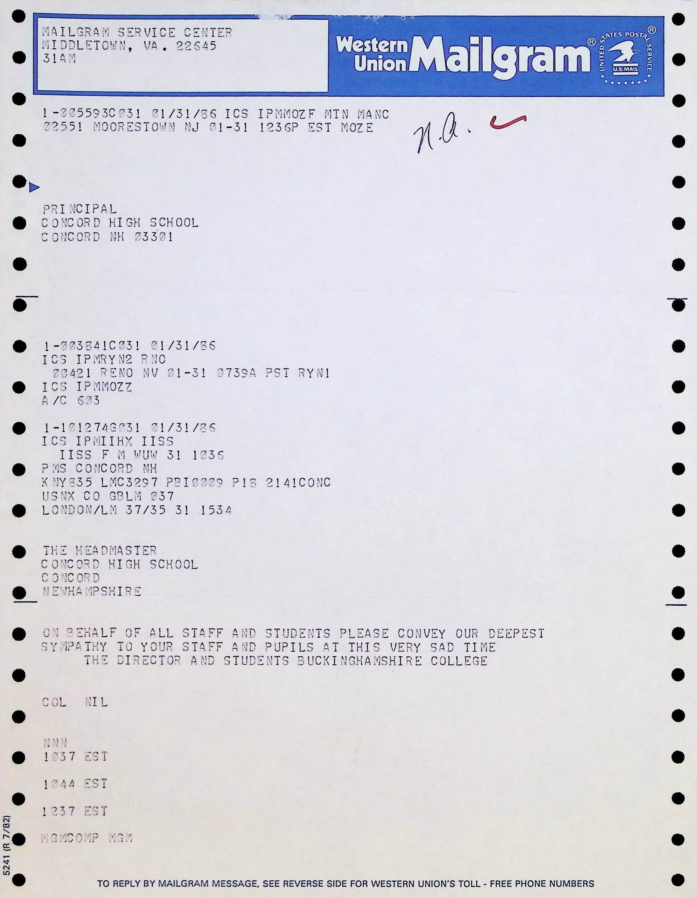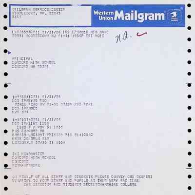 Western Union Mailgram To Concord High School from Buckinghamshire College Dated 1/31/1986