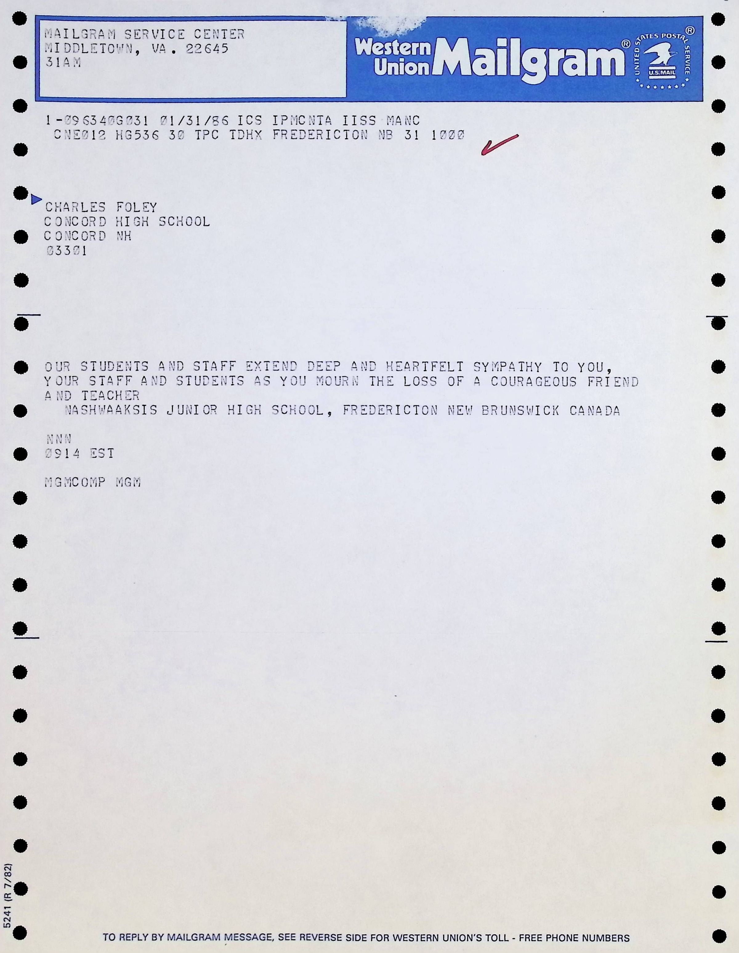 Mailgram dated January 31 1986Entry/Object ID