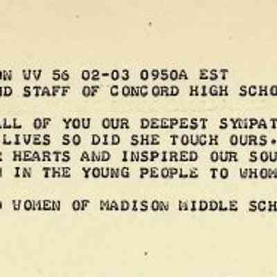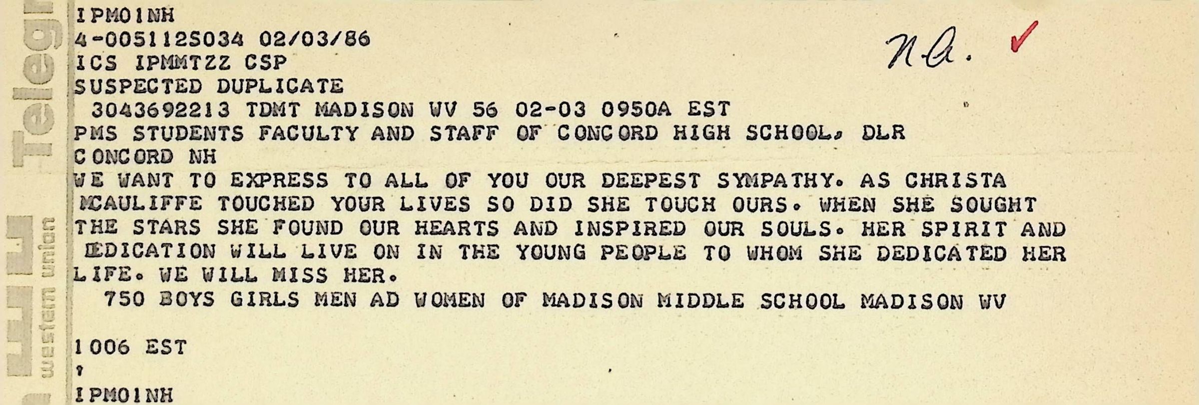 Western Union Telegram To Concord High School from Madison Middle School Dated 2/3/1986