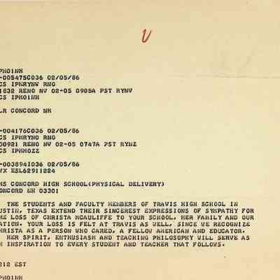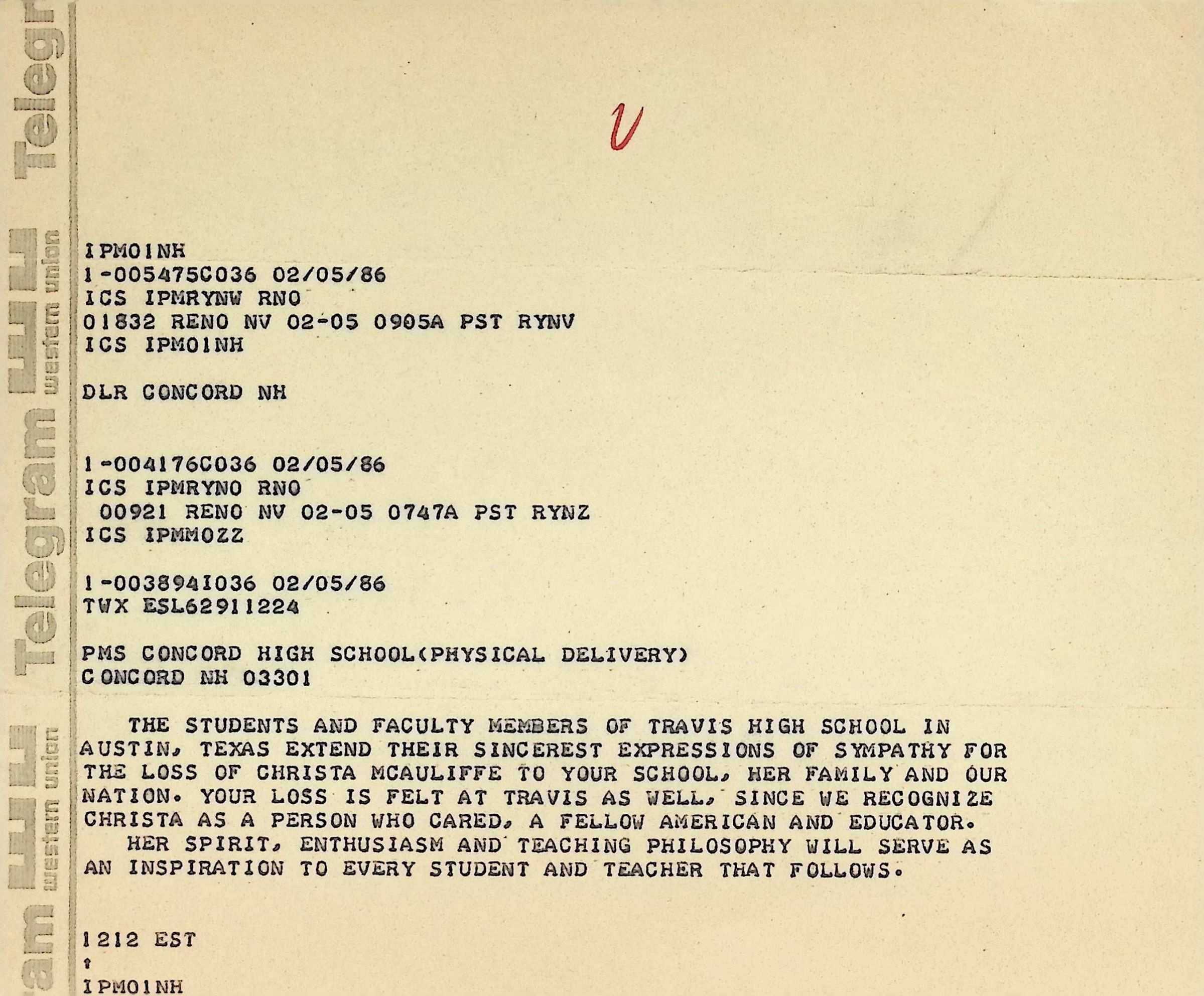 Western Union Telegram To Concord High School from Travis High School Dated 2/5/1986
