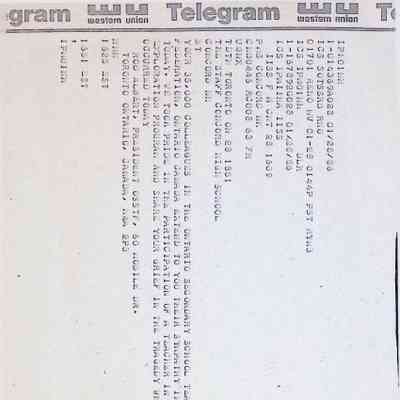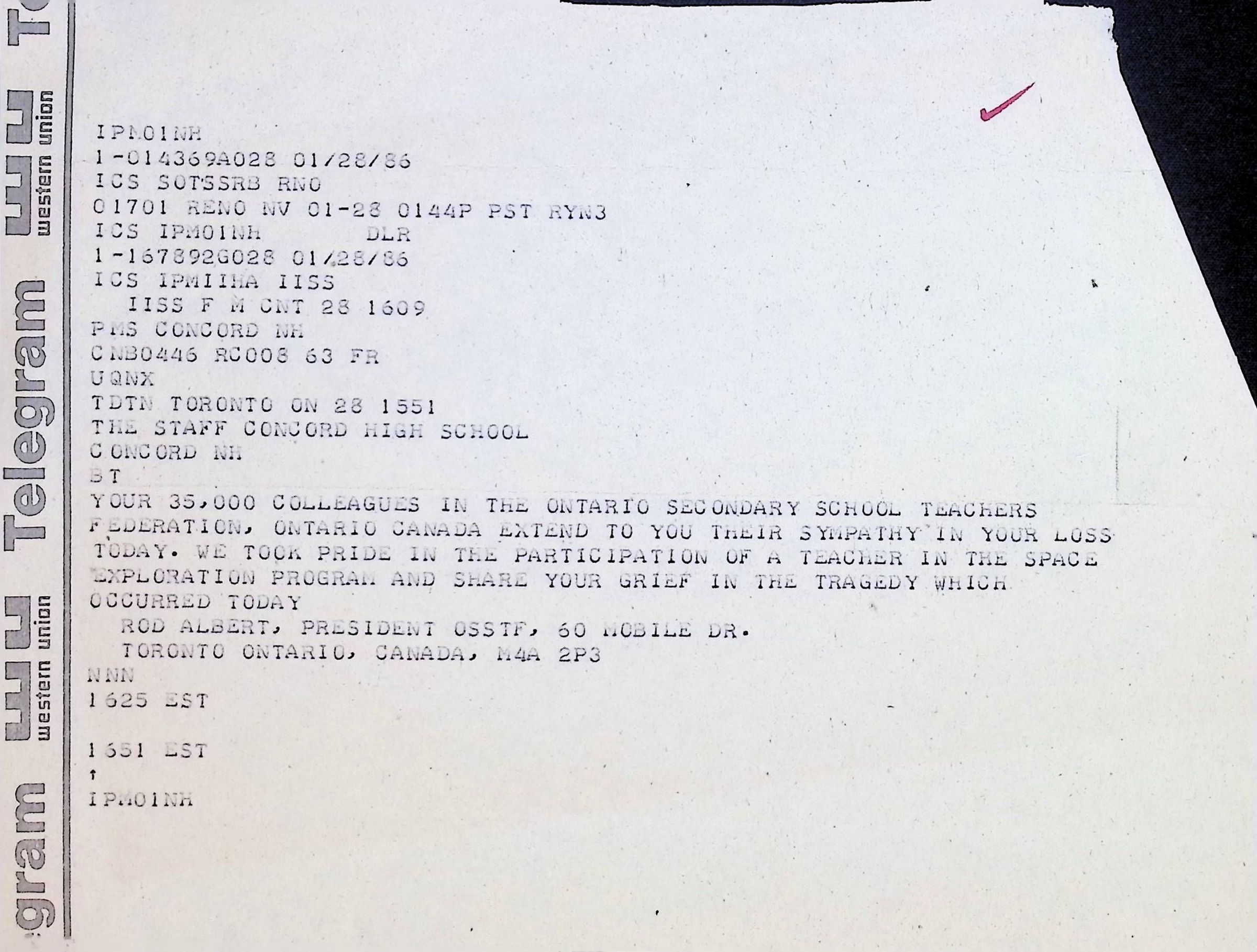 Western Union Telegram To Concord High School from the Ontario Secondary School Dated 1/28/1986