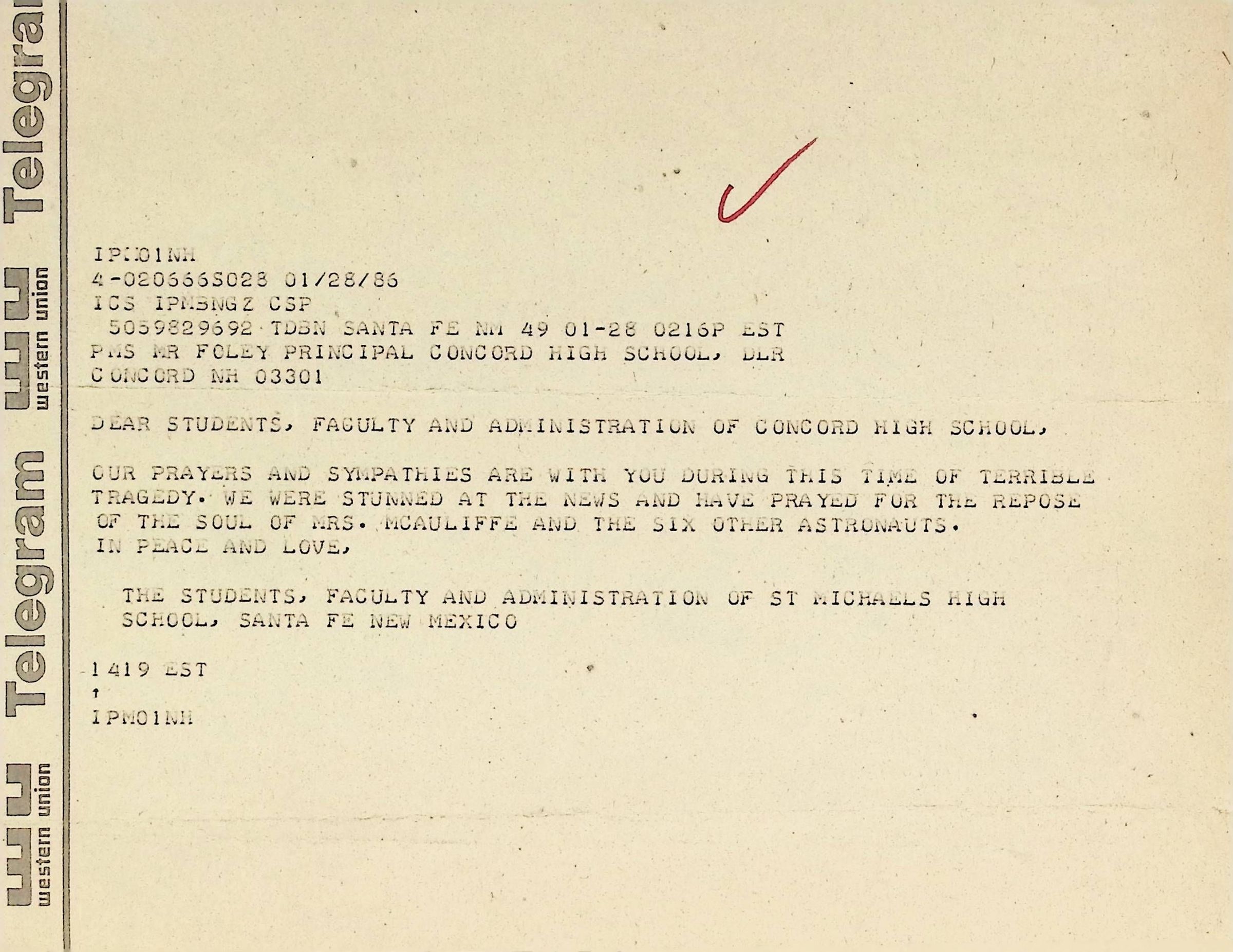 Western Union Telegram To Concord High School from St. Michael's High School Dated 1/28/1986