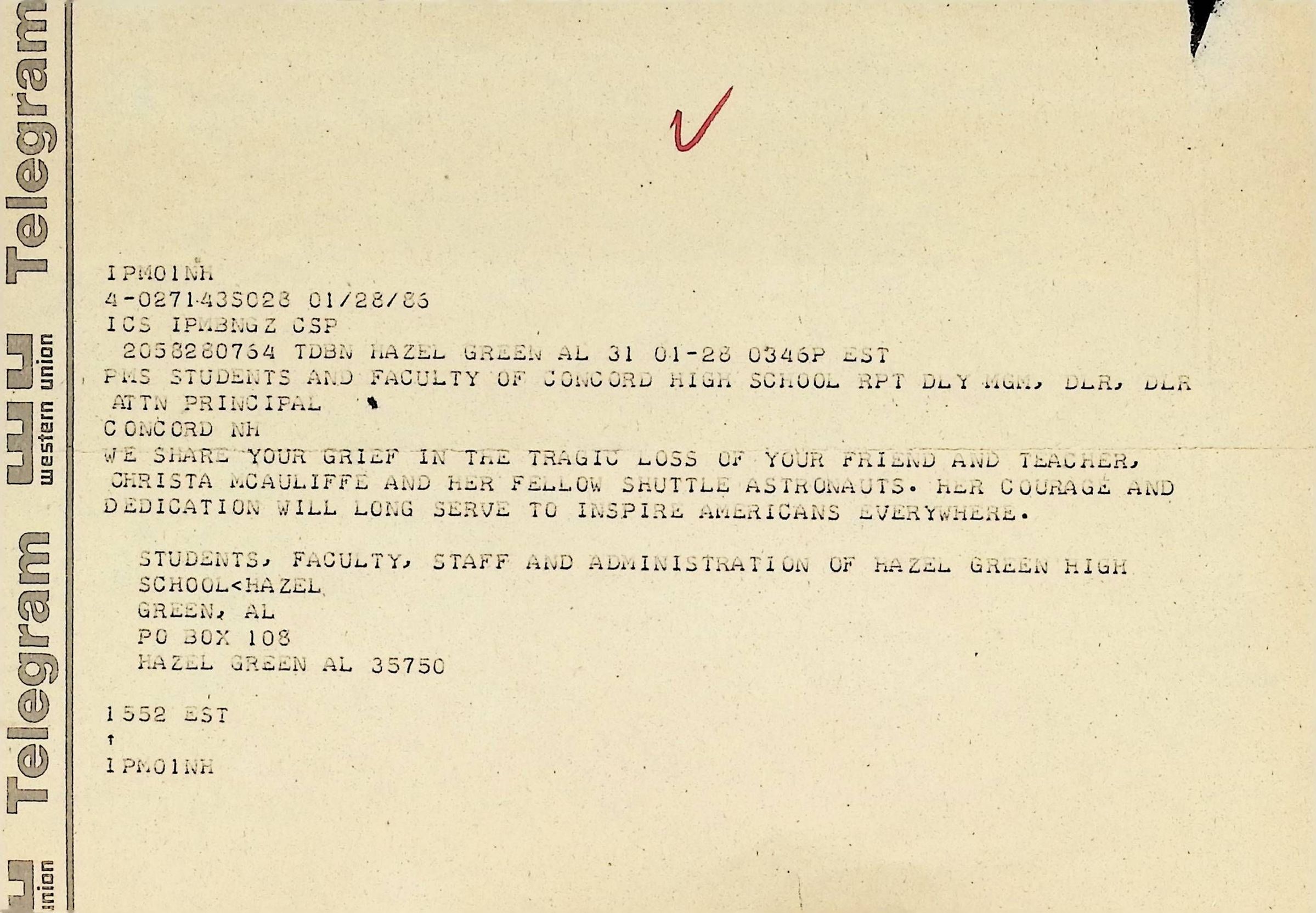 Western Union Telegram To Concord High School from Hazel Green High School Dated 1/28/1986
