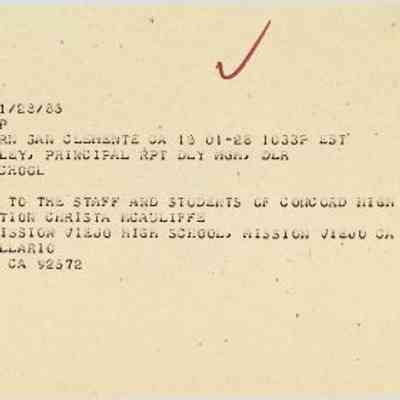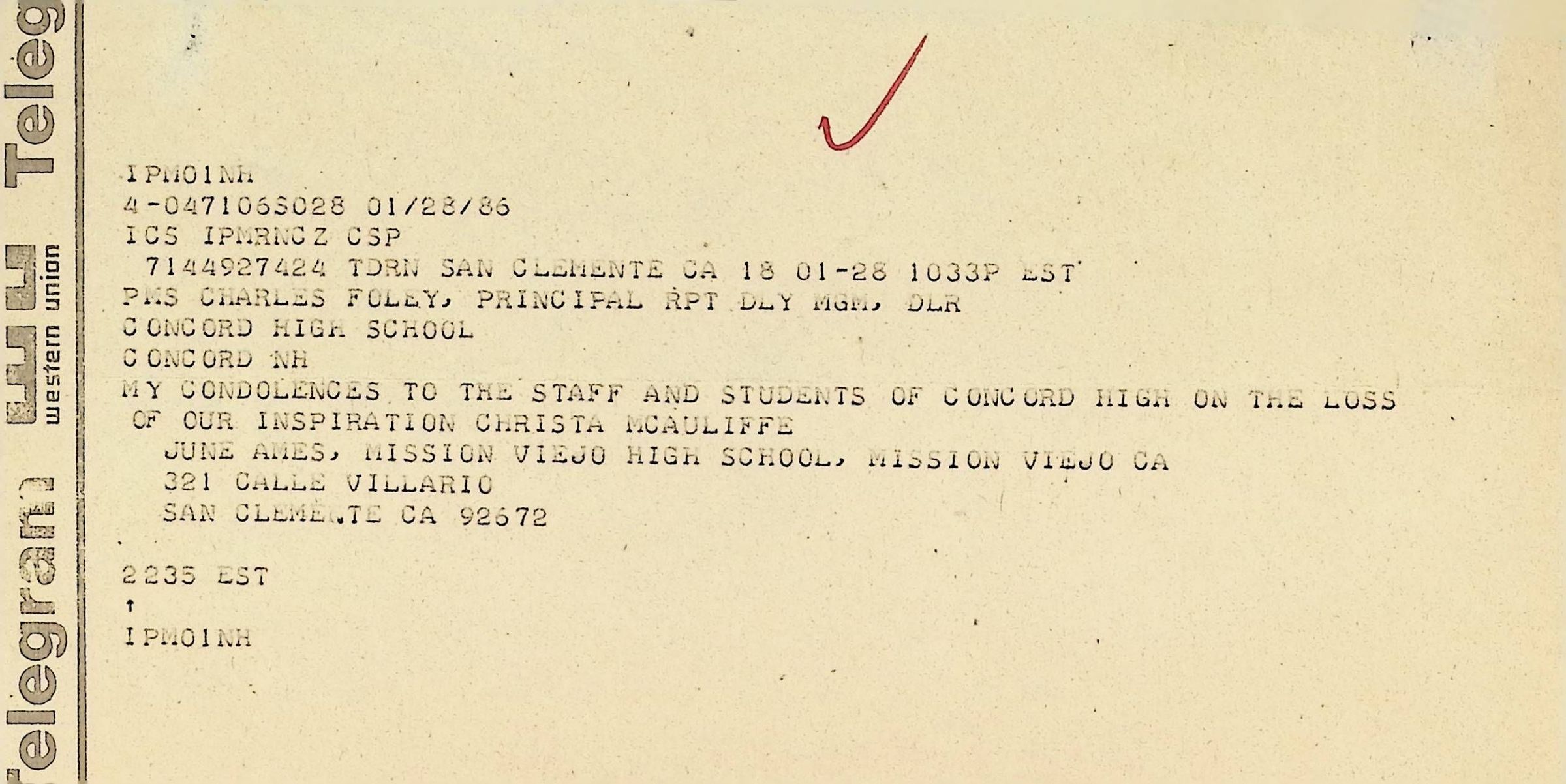 Western Union Telegram To Concord High School from Mission Viejo High School Dated 1/28/1986