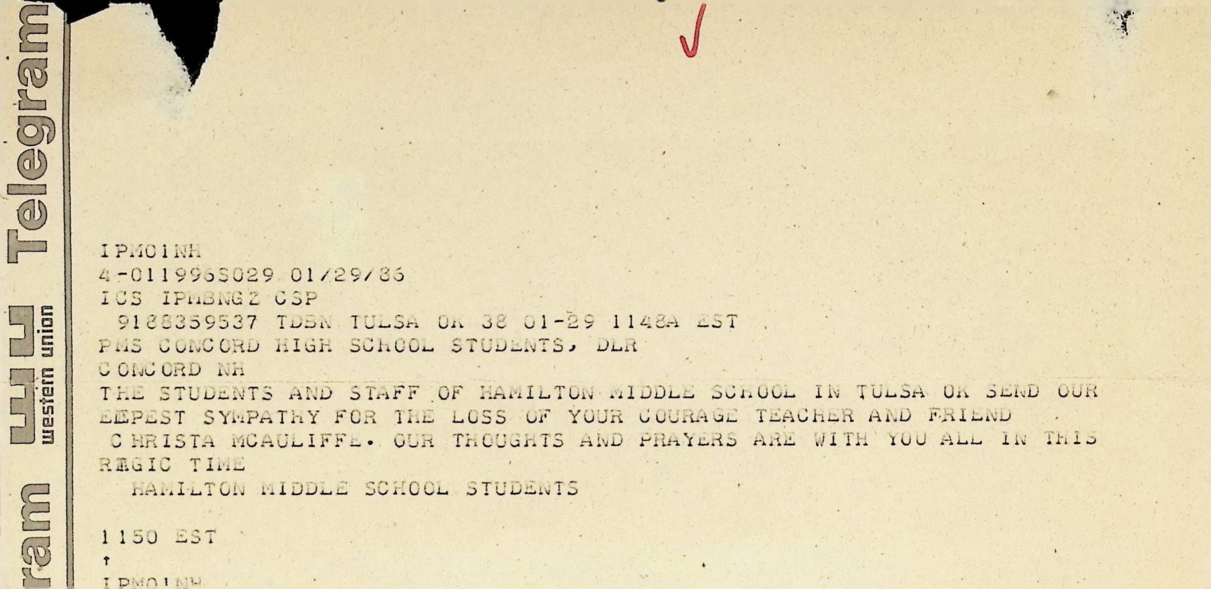 Western Union Telegram To Concord High School from Hamilton Middle School Dated 1/29/1986
