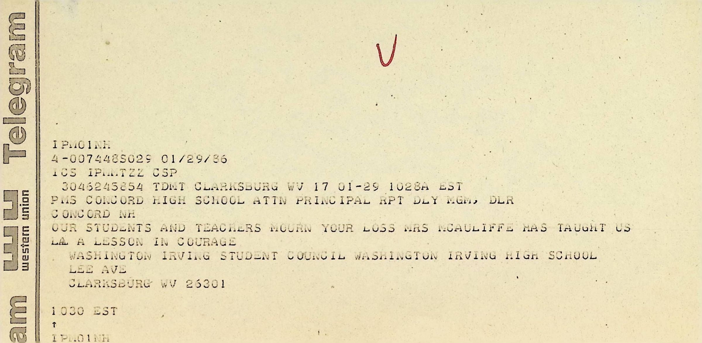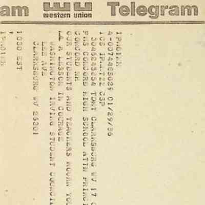 Western Union Telegram To Concord High School from Irving High School Dated 1/29/1986