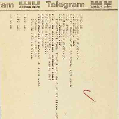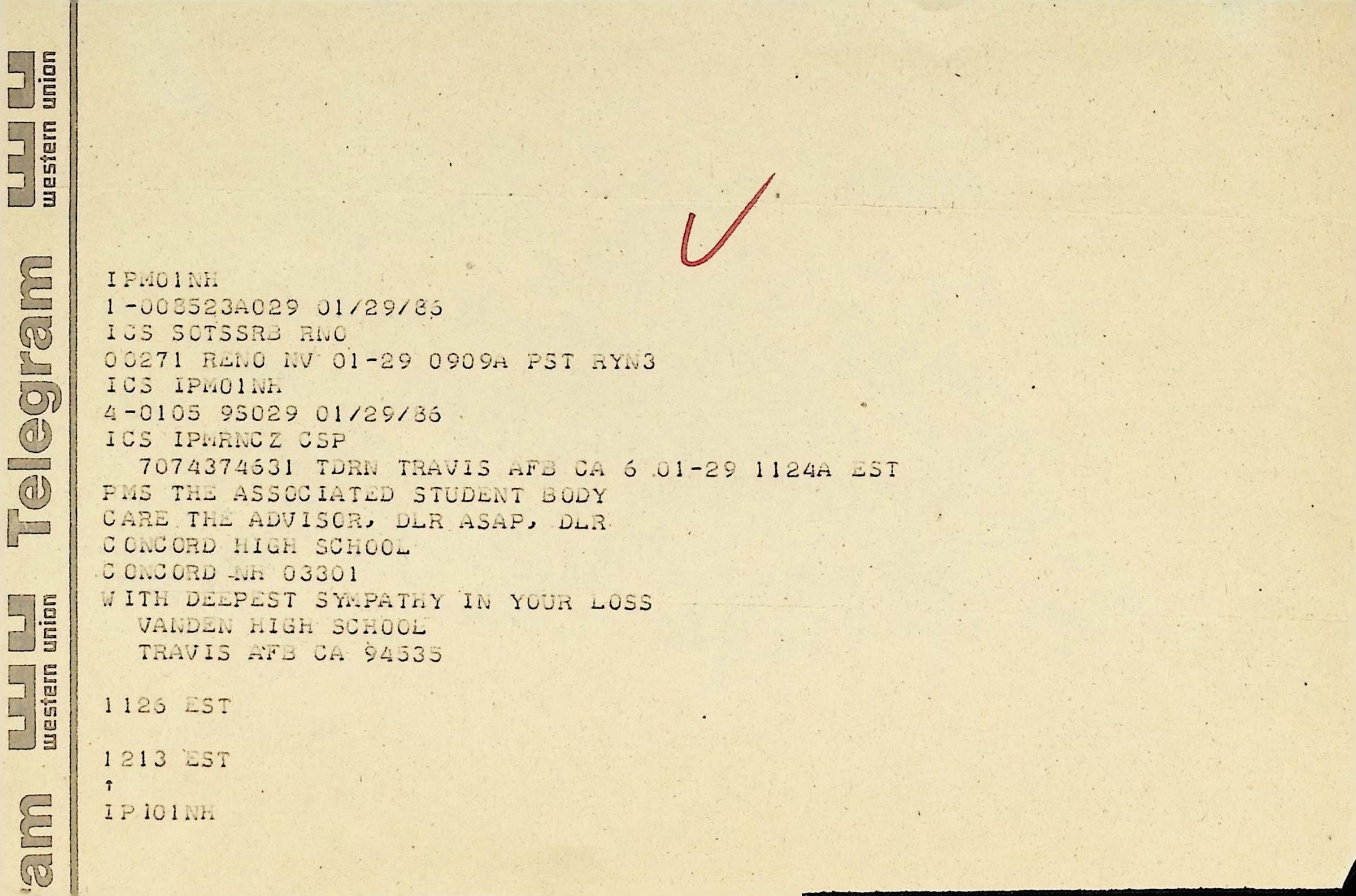 Western Union Telegram To Concord High School from Vanden High School Dated 1/29/1986
